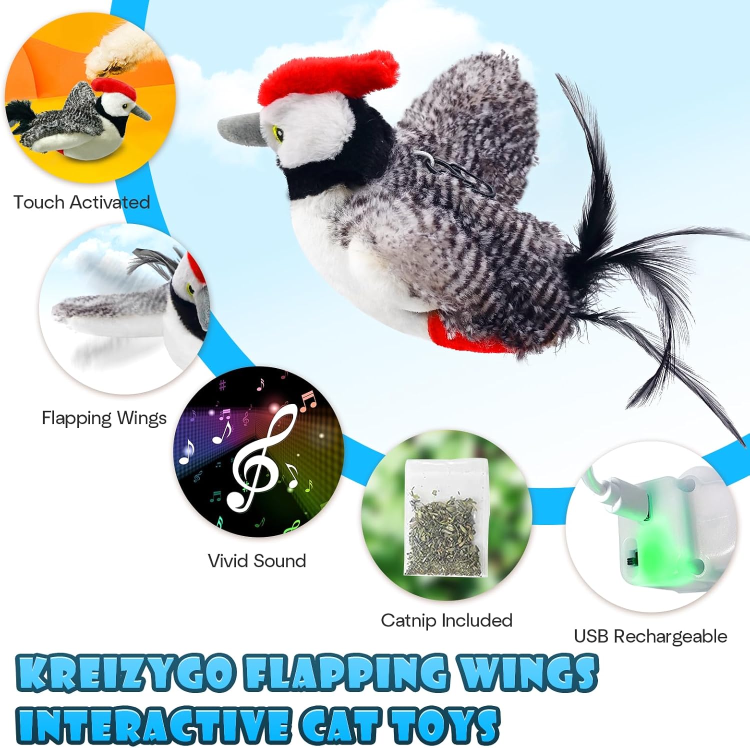 Играчка за котки, Пърхащ кълвач, Нелетяща, Чуруликаща птичка Интерактивна играчка с котешка трева за котки или малки кучета, Активира се с докосване, Презареждаща се