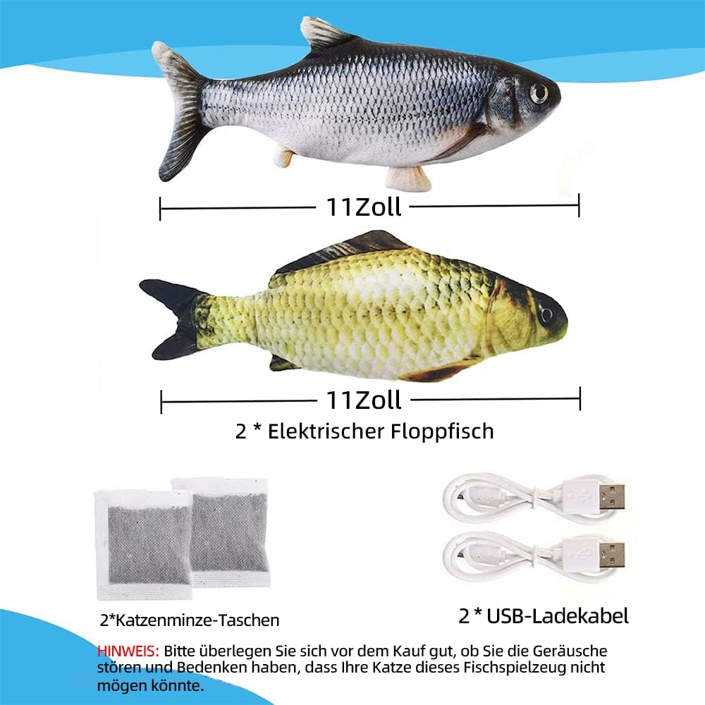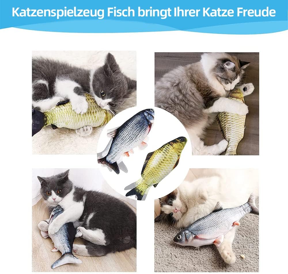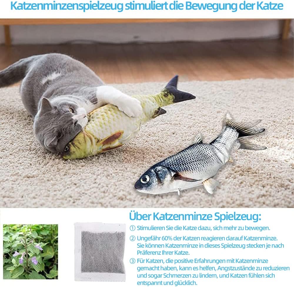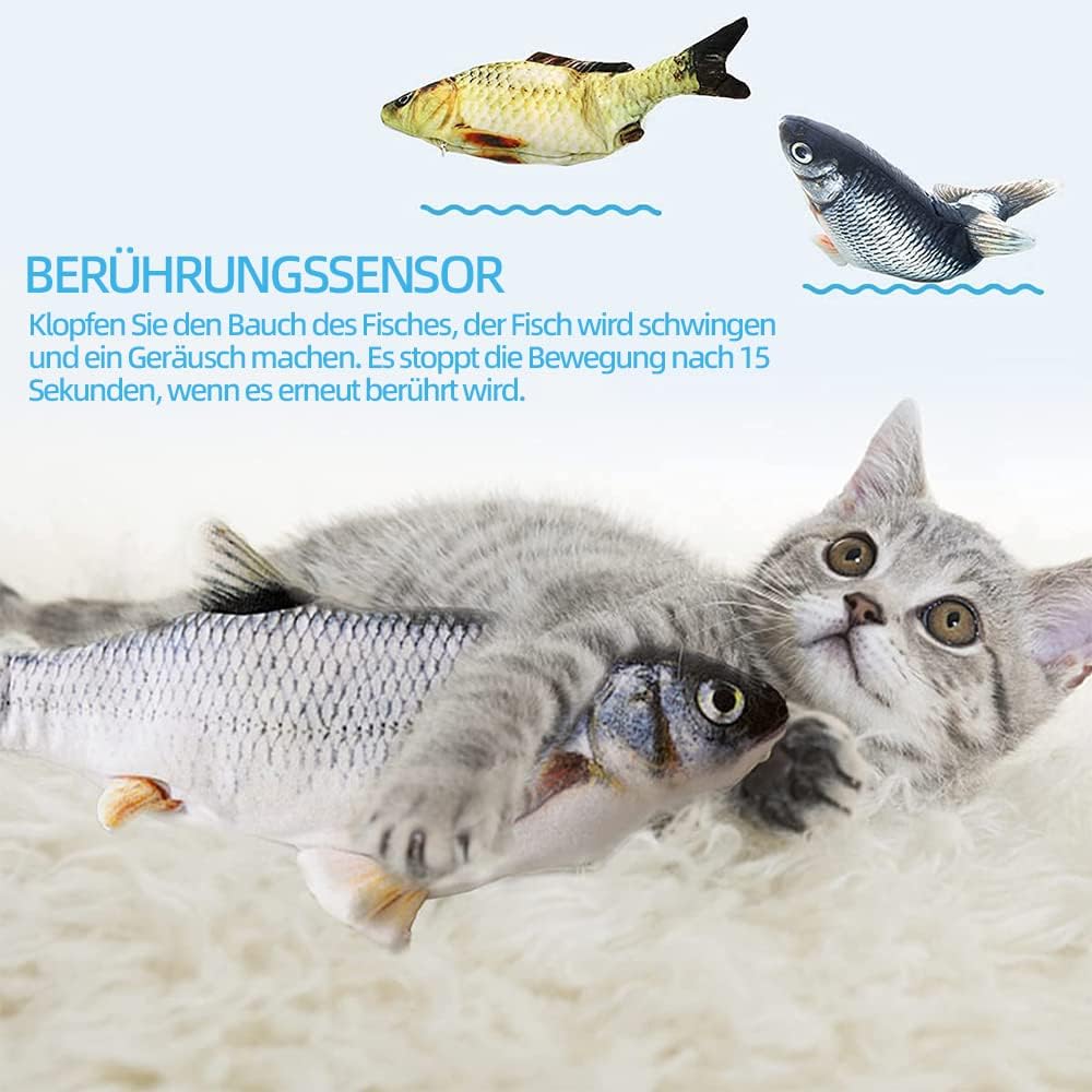 • Подвижна играчка рибка: интерактивна играчка за котки със сензор за докосване. Включете превключвателя на играчката. Когато котката ви я удари, рибката автоматично ще се размърда и ще издаде звук, който ще привлече котката ви да я захапе и хване. Когато играчката рибка спре да се докосва, тя спира след известно време, за да пести енергия, и започва отново, когато котката скочи върху нея. Тя забавлява котката ви по всяко време на деня.