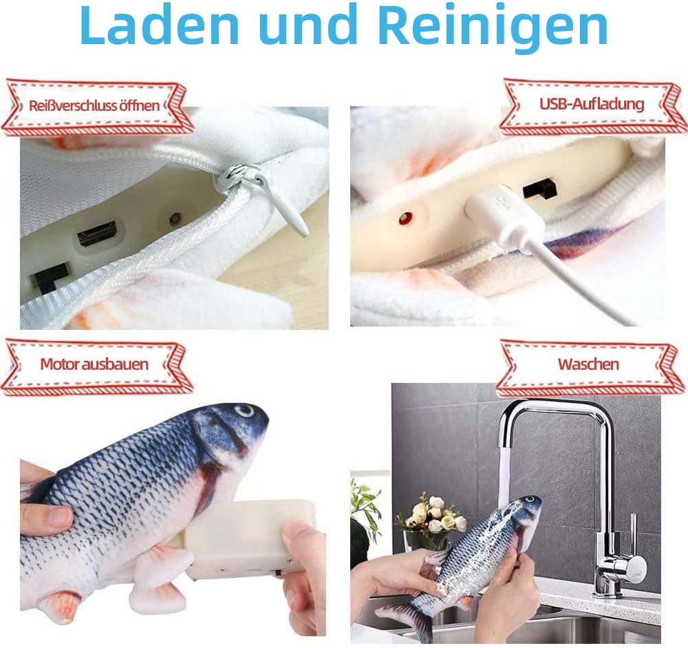 • Зареждане чрез USB: на коремчето на играчката-рибка има цип, зад него се намират моторът и бутонът за скорости. Включете USB кабела, за да заредите играчката-рибка. Изключената LED светлина означава пълно зареждане. По-малко от 70 минути до пълно зареждане и животът на батерията ще забавлява котката ви с часове. Моторът на играчката-рибка е подвижен. Моля, извадете го, преди да почистите играчката-рибка.