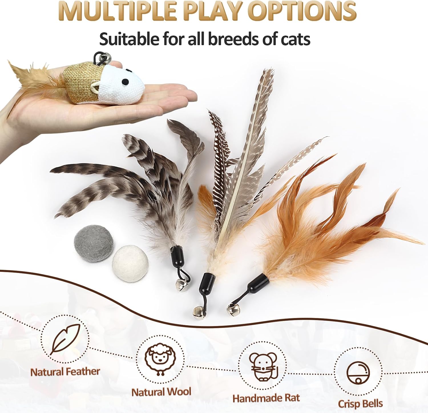 • Естествени материали: Изработена от висококачествени естествени материали като вълна и истински пера, тази играчка за котки е не само безопасна и издръжлива, но и привлекателна и атрактивна за вашата котка.