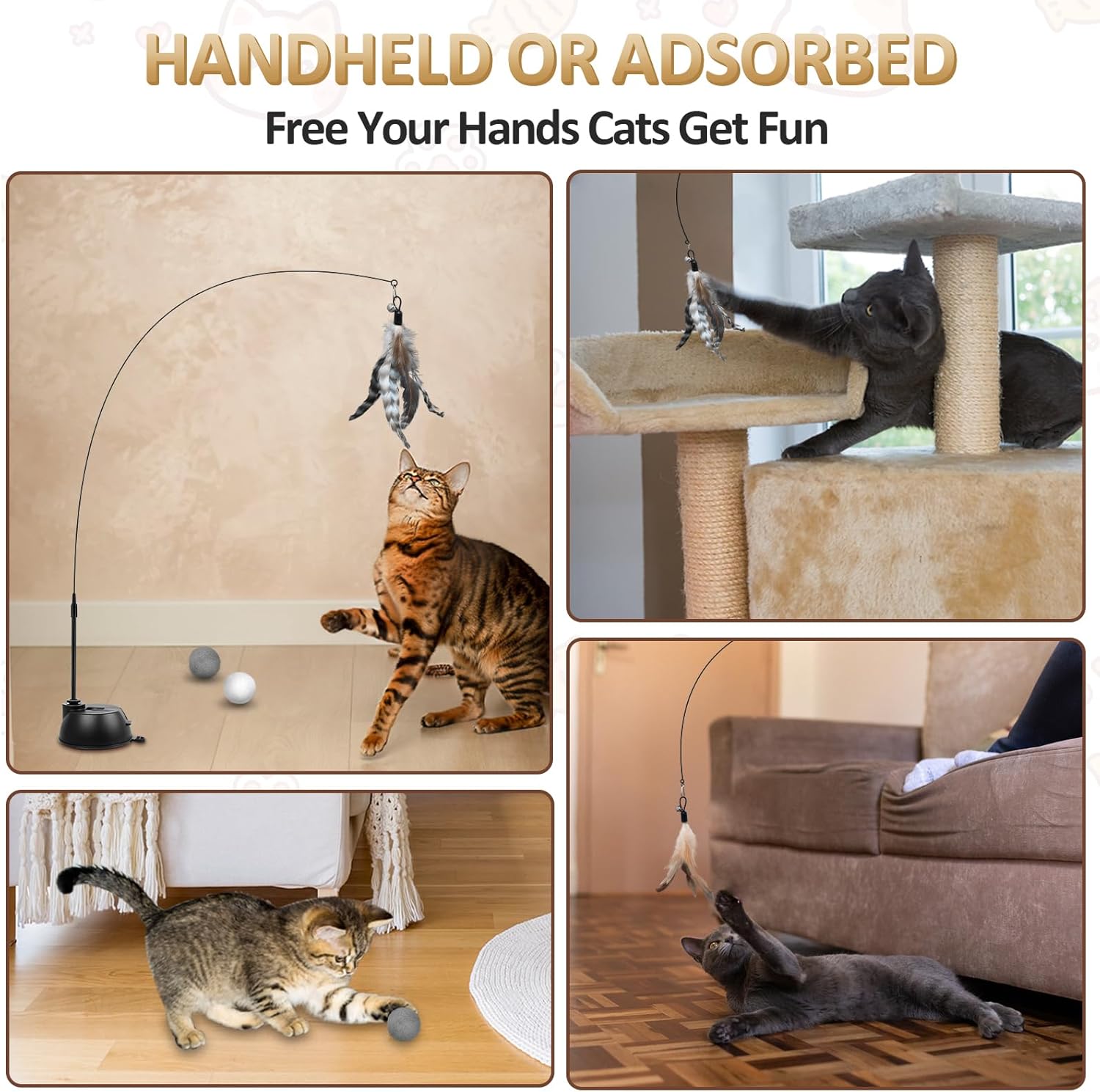 • Универсален комплект играчки: Съдържа 2 вендузи, 4 ъгъла, 1 ръчно изработена мишка, 2 топки от естествена вълна и 3 пера с камбанки, този комплект играчки за котки предлага разнообразни възможности за забавление за вашата котка.