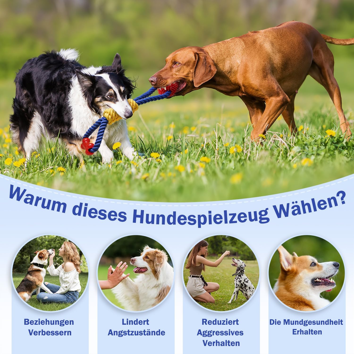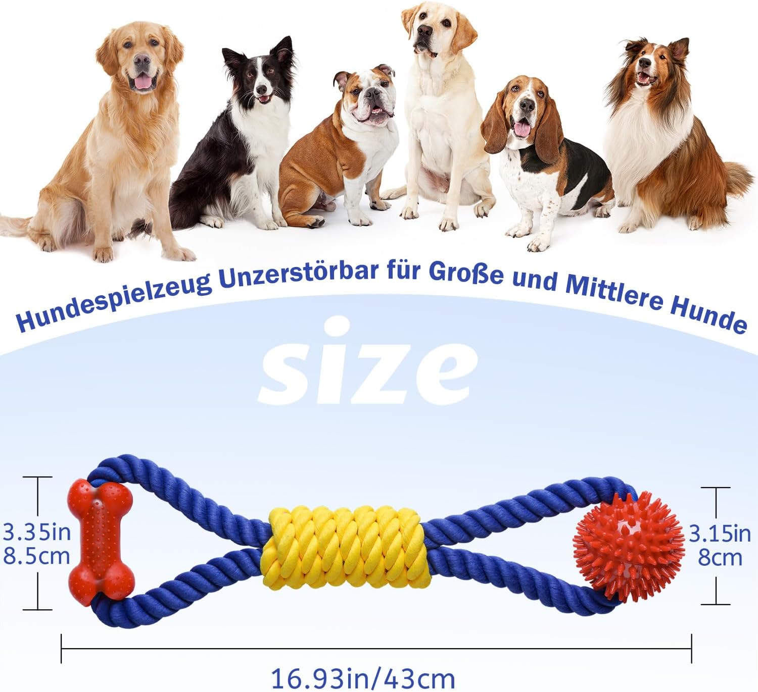 • Играчка за кучета, неразрушима за агресивни дъвчащи - Тази играчка за кучета с въже с дължина 95 см XXL и 5 възела е предназначена за средни и големи кучета, издръжлива и неразрушима. Нашата играчка за кучета с въже е плътно обвита с 3 дебели нишки, което я прави по-здрава от другите играчки с въже.