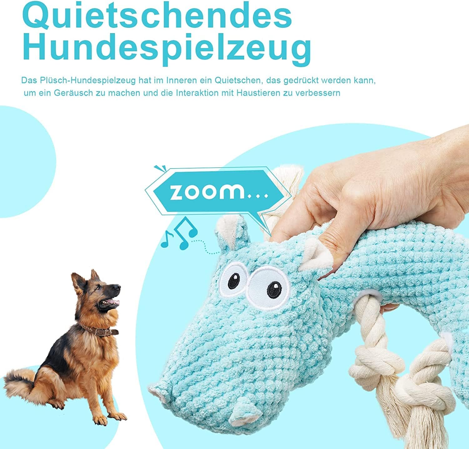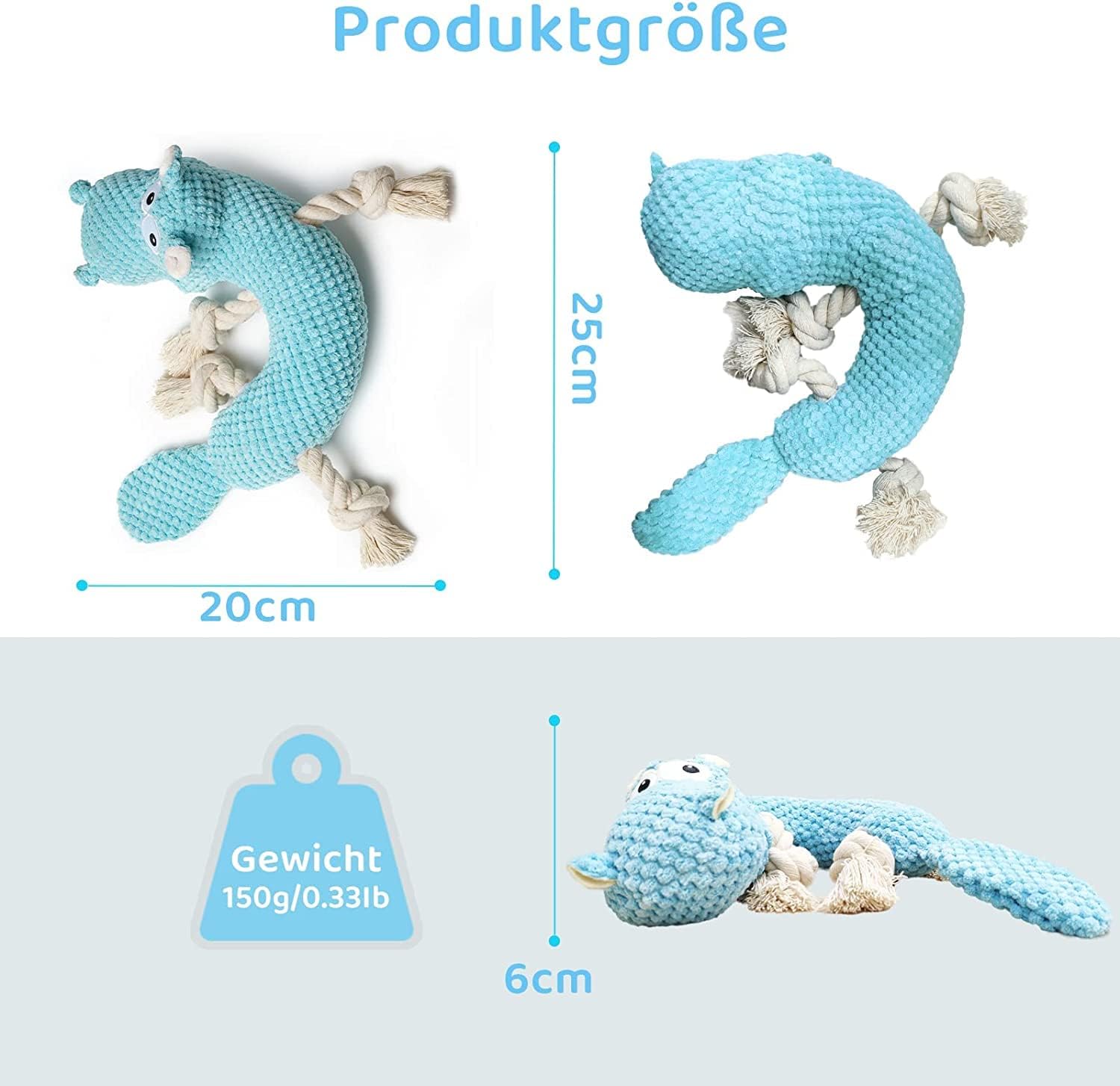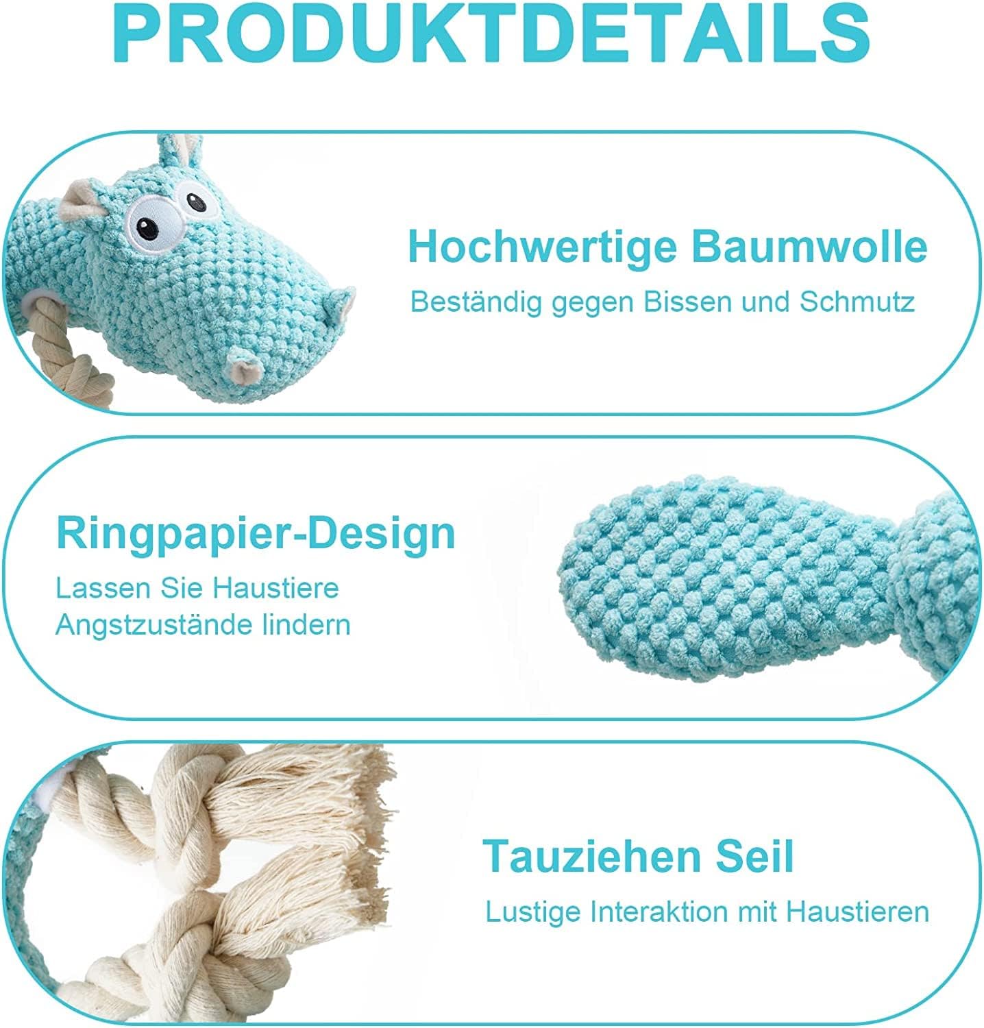 Dieses Hundespielzeug besteht aus hochwertigem Baumwollgewebe. Die innere Schicht enthält eine wasserdichte Schicht, die frei von Hand und in der Maschine gewaschen werden kann. Es ist sicher, enthält gleichzeitig ein quietschendes Spielzeug und ein Schlepper -Kriegsseil, das mit Ihrem Hund verwendet werden kann.Haben Sie entspannte Interaktionen und erhöhen Sie die Intimität zwischen Ihrem Haustier und Ihnen.