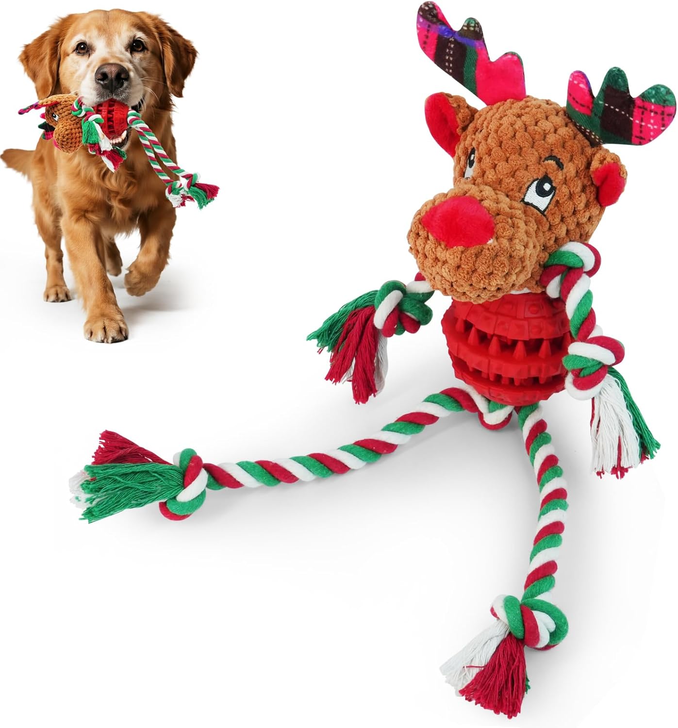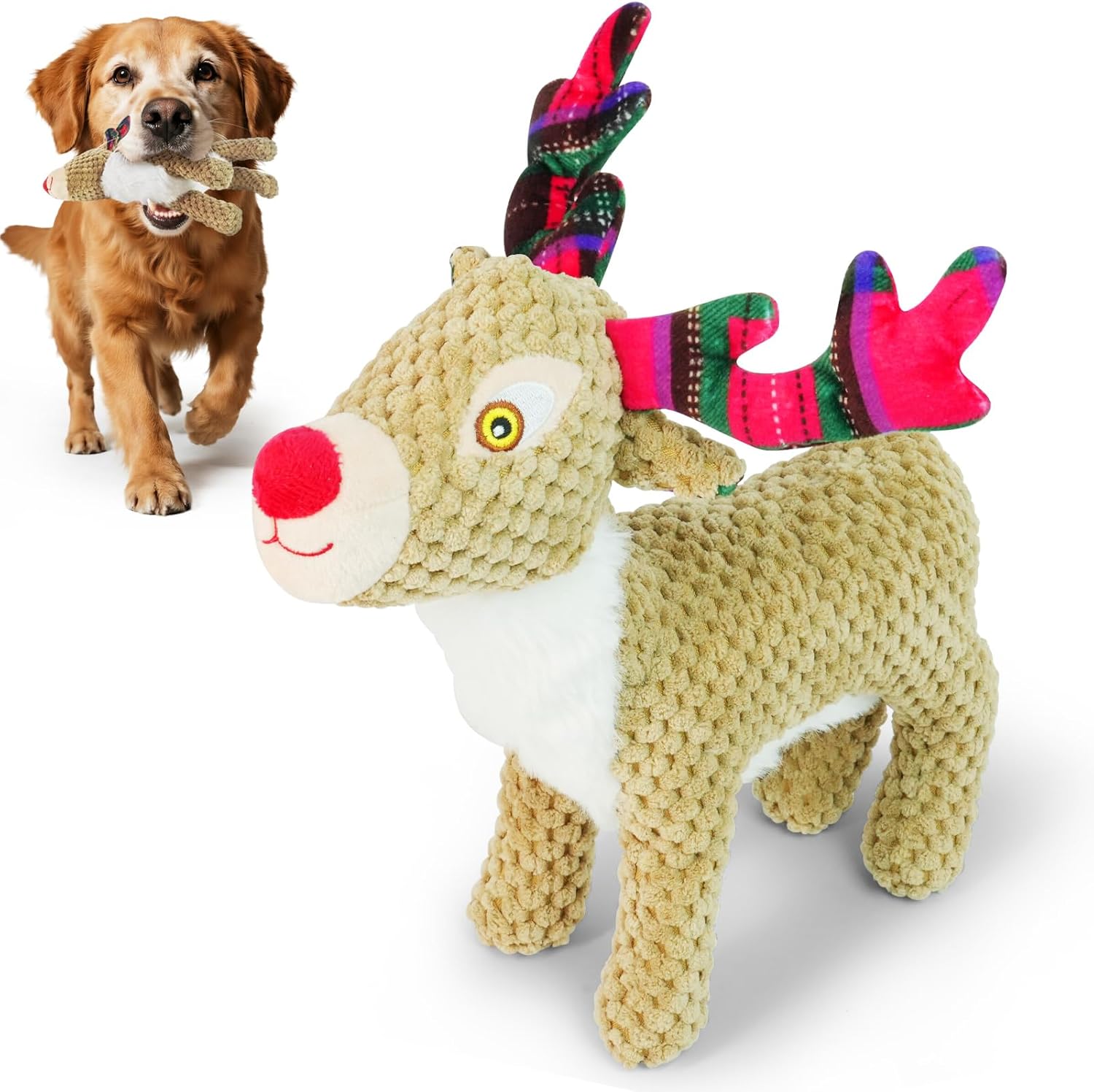 Играчка за кучета Коледен елен - Плюшена скърцаща играчка за кучета и кученца, Интерактивна играчка за дъвчене, Малки, средни и големи кучета