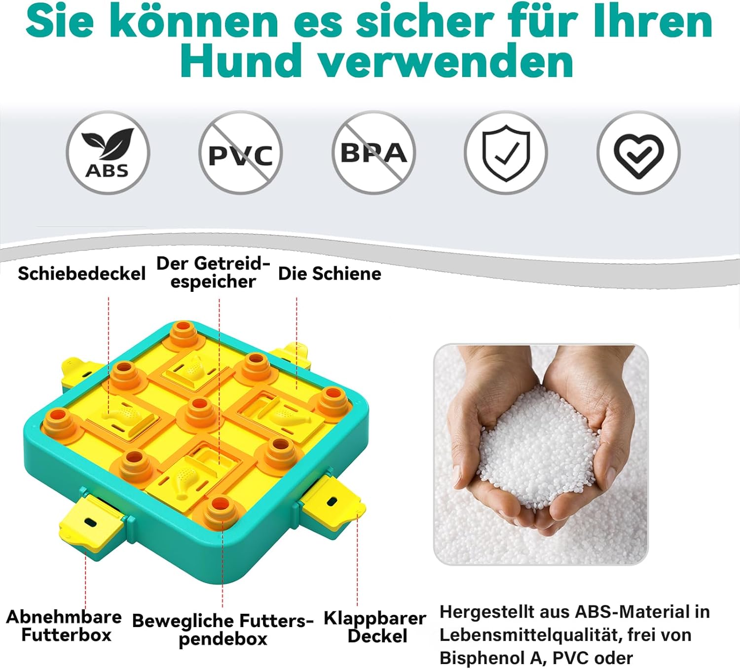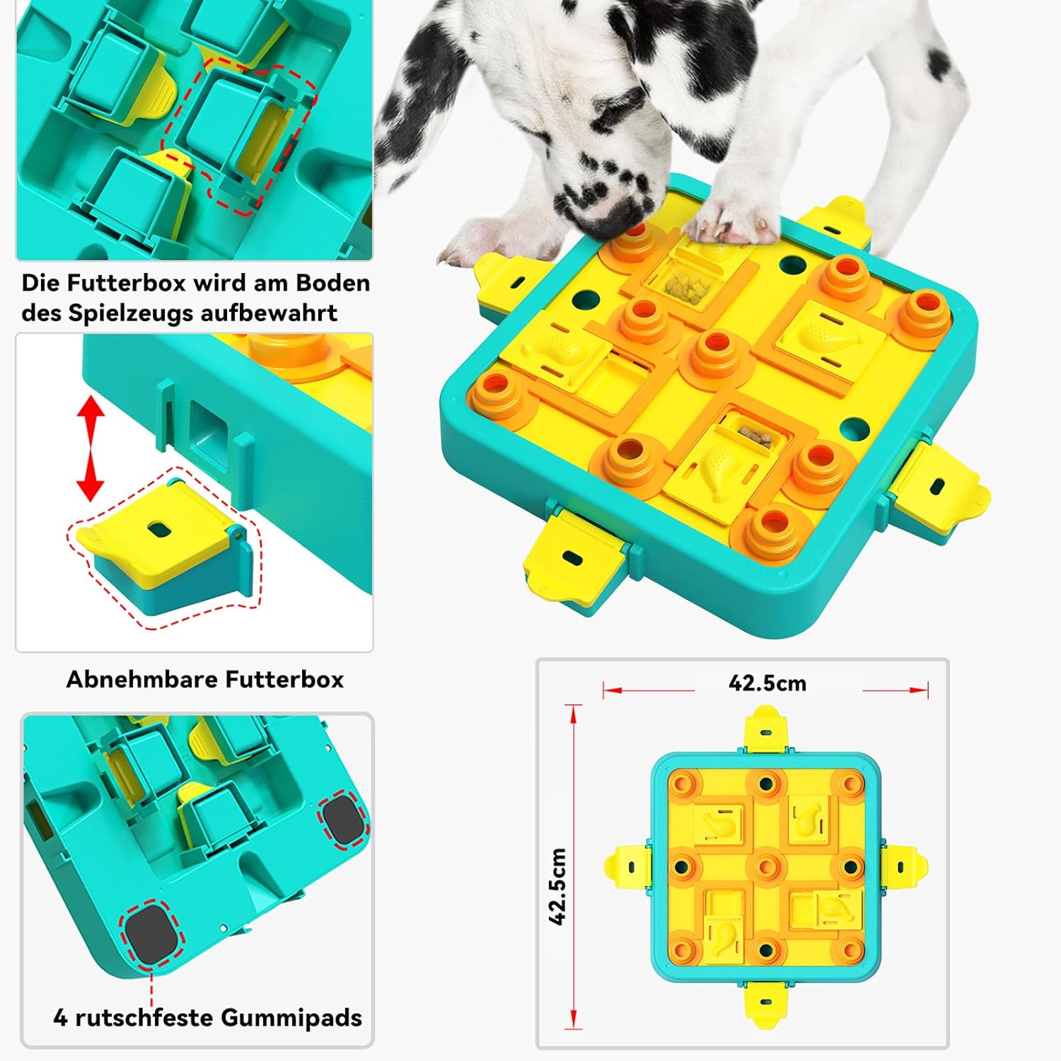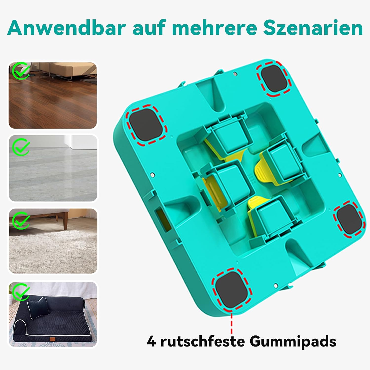 • Ниво 1 и ниво 2 Тази умна играчка за кучета има ниво на трудност 1 плюс ниво 2, можете да използвате ниво 1 или ниво 2 самостоятелно, един продукт, два начина на игра, което напълно спестява разходите ви за образователни играчки. Долната част на играчката е оборудвана с 4 неплъзгащи се подложки, за да се предотврати кучето да събаря играчката по време на игра, и може да се използва на всякаква повърхност.