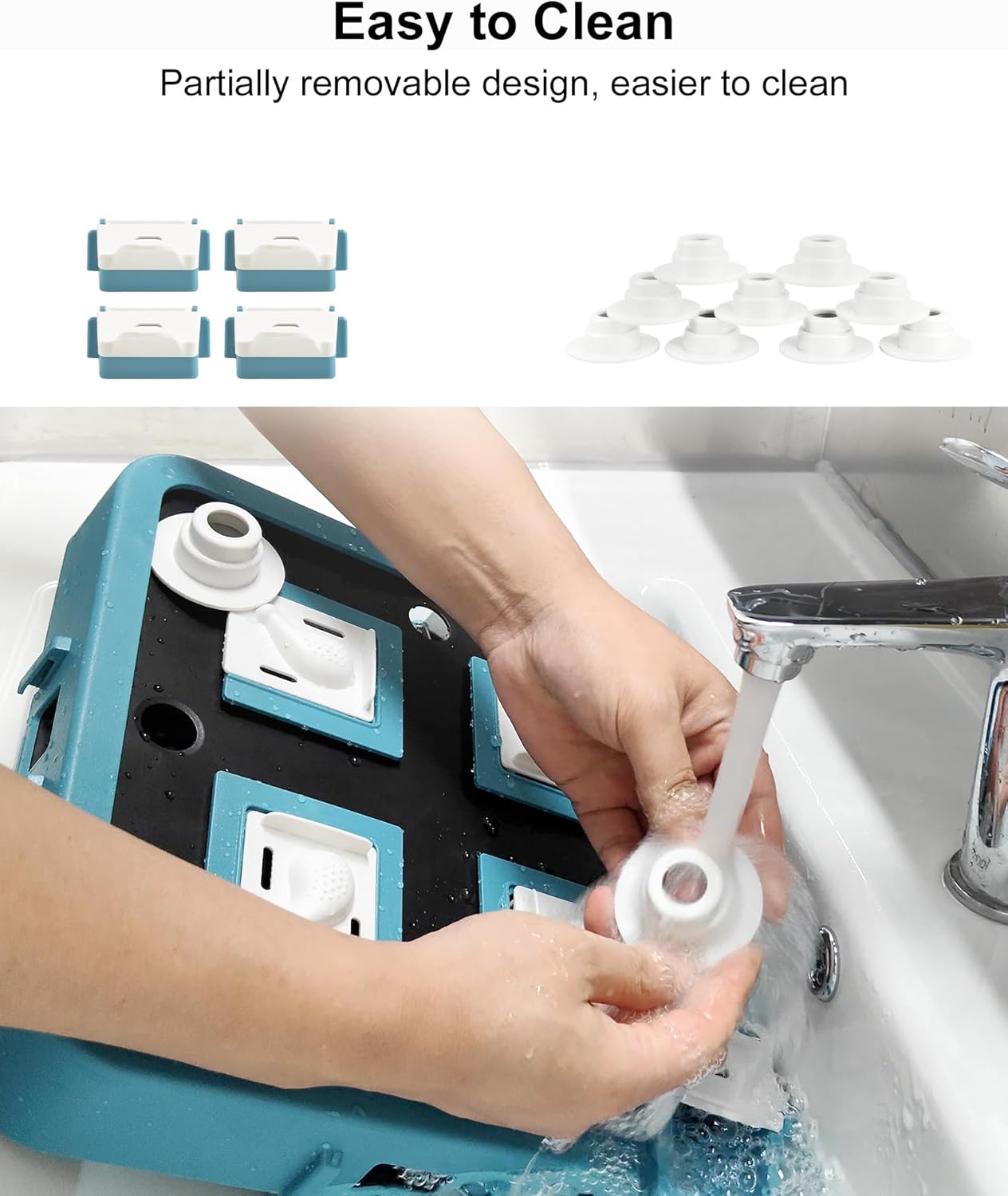 Attach the 4 removable hinged lid boxes and 9 sliding boxes to the toy and put food in these sliding boxes. The dog must slide the sliding box to the food outlet opening and the food inside falls into the 4 hinged lid boxes on the sides of the toy. Fold the lids to eat the food.