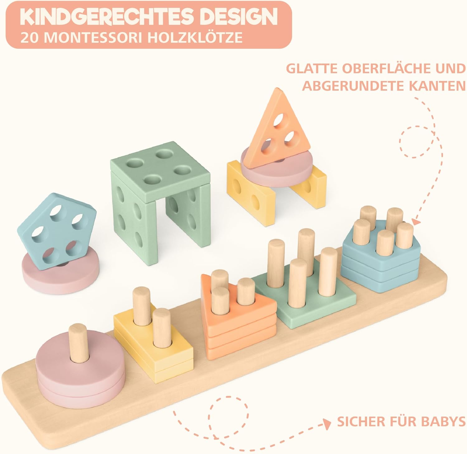 • Игра за сортиране по метода Монтесори – нашата игра за сортиране по форми и цветове в пастелни цветове помага на бебета и деца да развият фината си моторика при броене и сортиране. Състои се от 20 части, включително блокчета в 5 форми и различни цветове. Изключително големите части могат лесно да се хващат с малки пръстчета.