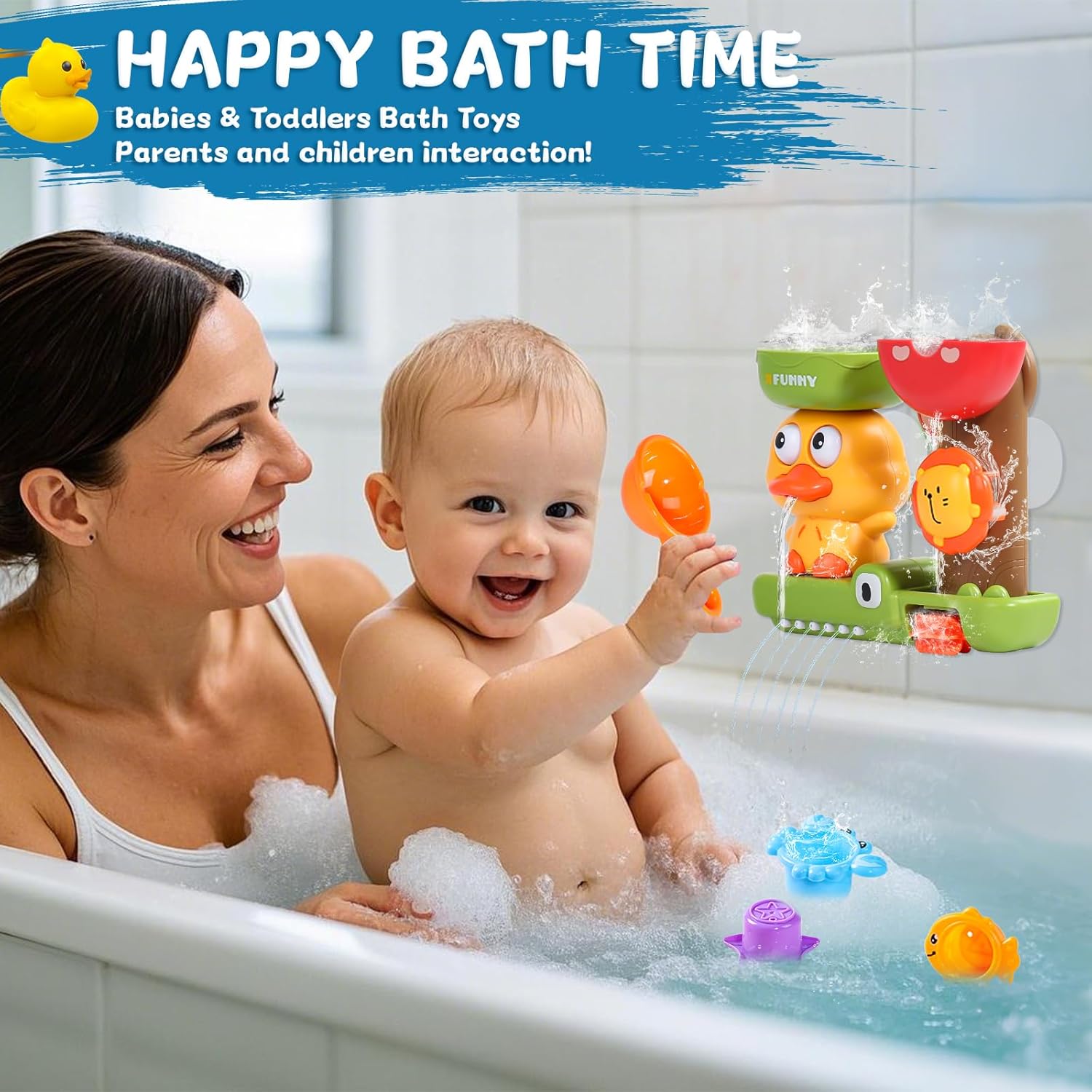 • Играчка за вана от 1 година: когато върху играчката за вана се излее вода, водните течения задвижват очите и зъбните колела на патицата да се въртят, създавайки водопад на изхода. Играчката за вана за бебе от 1 година пленява вниманието на вашето бебе и го кара да обича къпането.