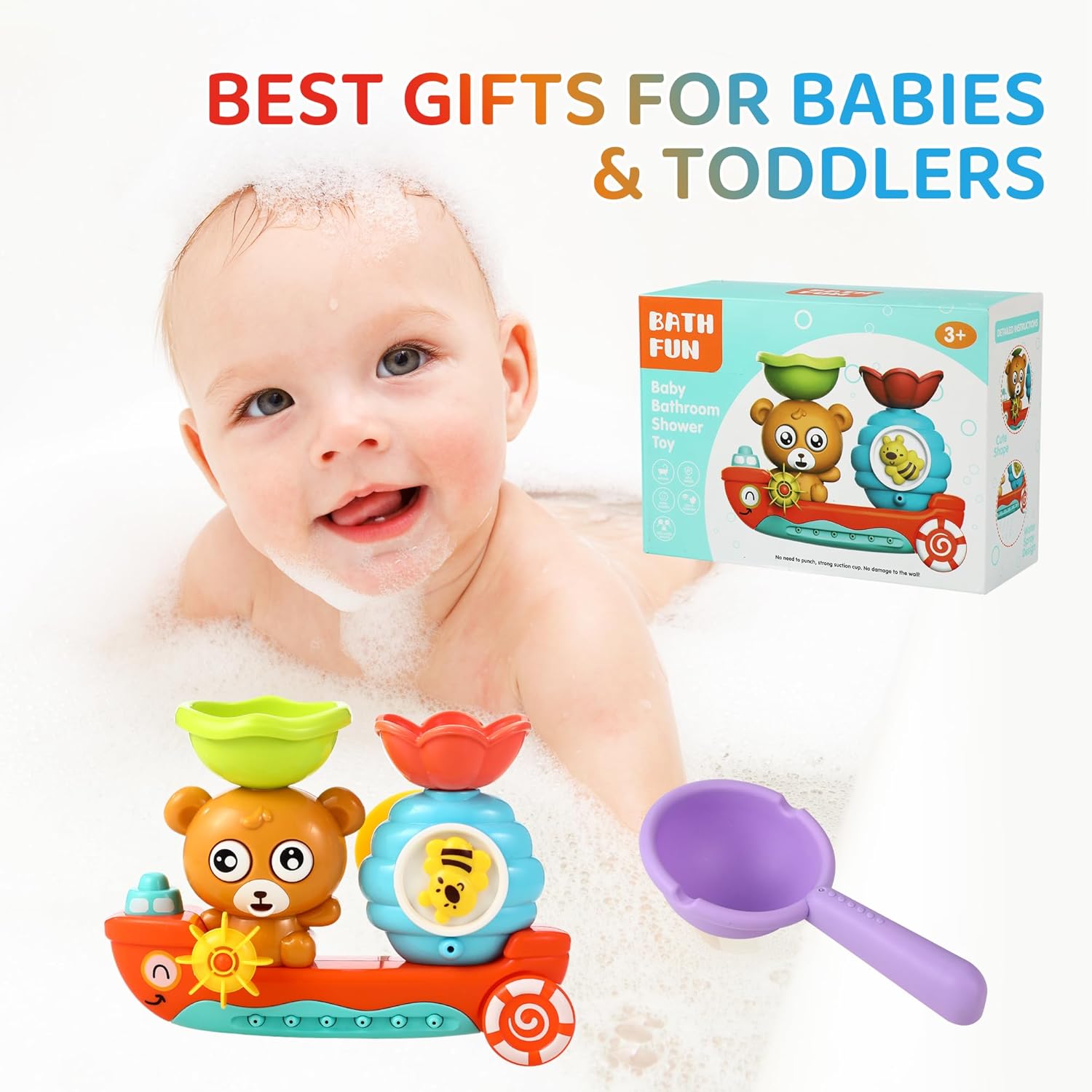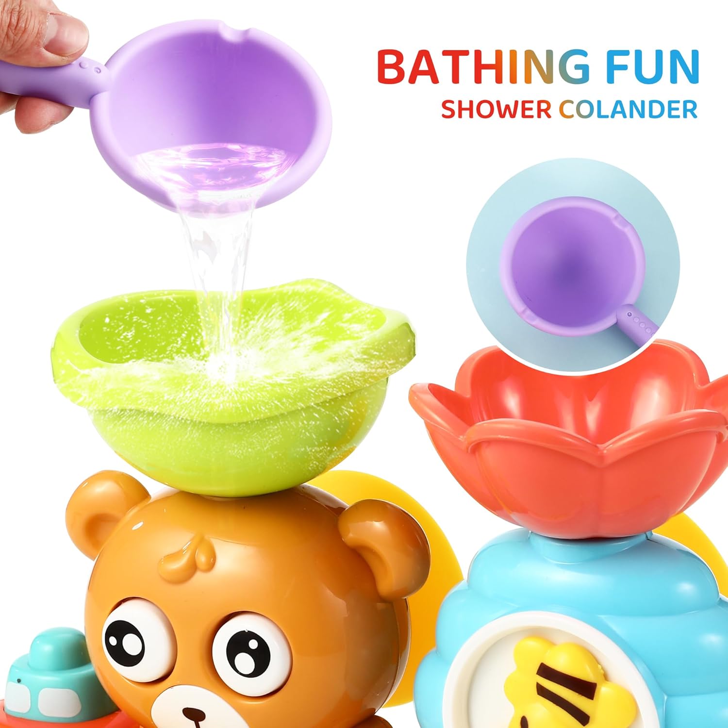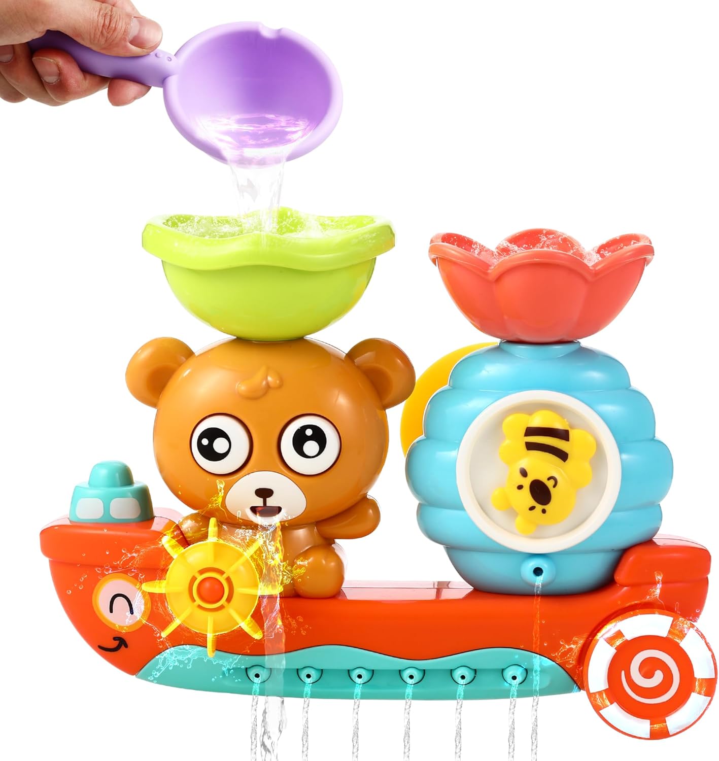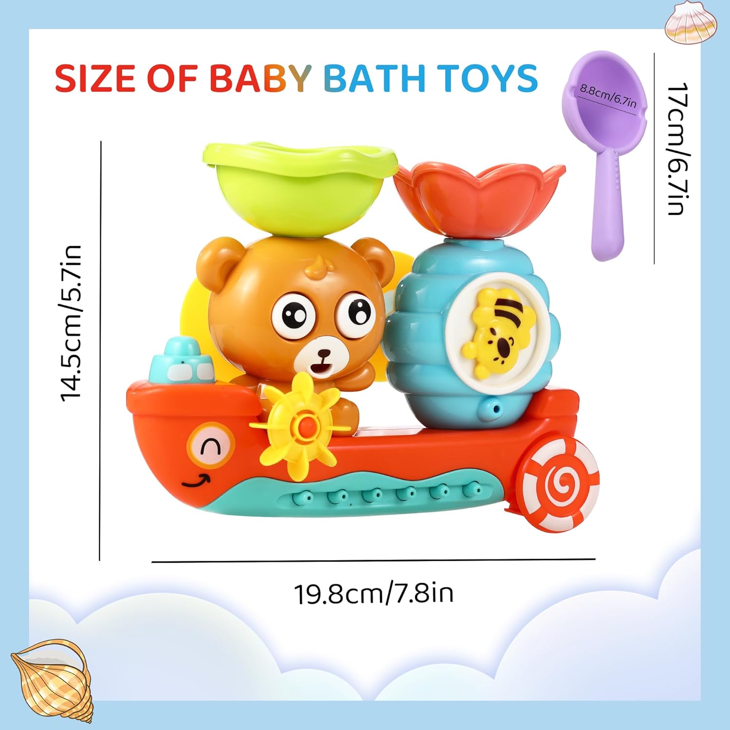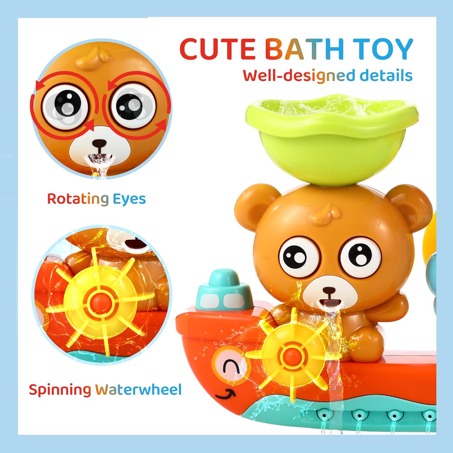 - Тази играчка за вана използва лесен воден поток и механични устройства, така че децата могат да научат координация око-ръка и фина моторика, докато играят. При наливане на вода, водният поток задвижва зъбните колела да се въртят и устата на мечката да плюе вода, което може да помогне на децата да подобрят мисловните си умения.