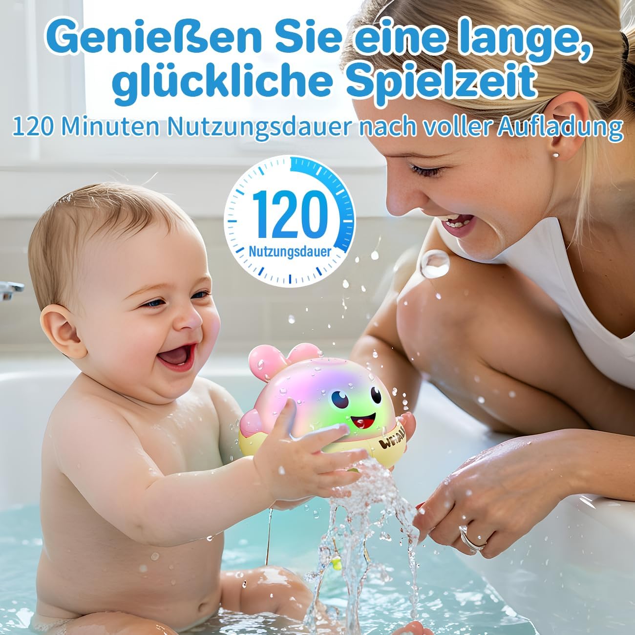 • Дълго забавление – Безгрижна употреба: тази играчка за вана има вградена батерия, предлага се с USB-C кабел за зареждане и мини отвертка и може да пръска вода непрекъснато в продължение на 120 минути след пълно зареждане. Силиконов капак защитава малкия USB порт за зареждане, така че водоустойчивостта на бебешката водна играчка е още по-надеждна. Няма нужда от честа смяна на батериите - спестява допълнителни разходи и прави играчката за малки деца Watermates екологична. Идеална за дълготрайно забавление с играчката за вана от 2-годишна възраст.