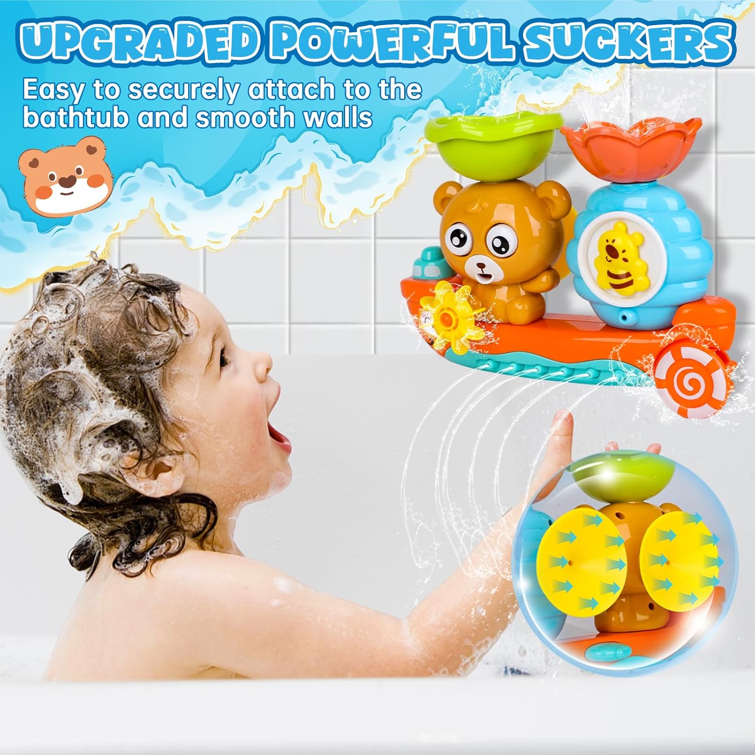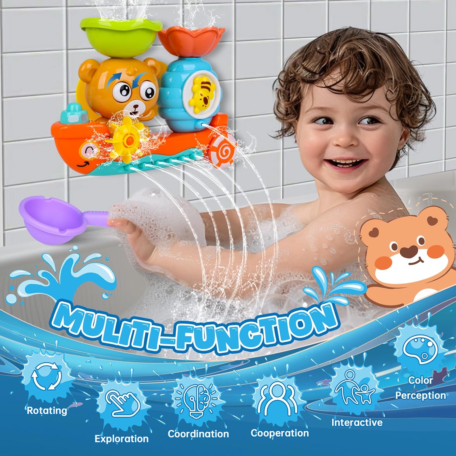 Докато го пълни с вода, детето ви игриво учи причинно-следствените принципи: Въртящите се мечи очи и бълбукащото водно колело насърчават разбирането на механиката и игриво подобряват координацията между ръцете и очите.