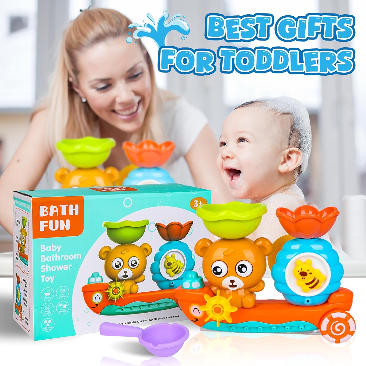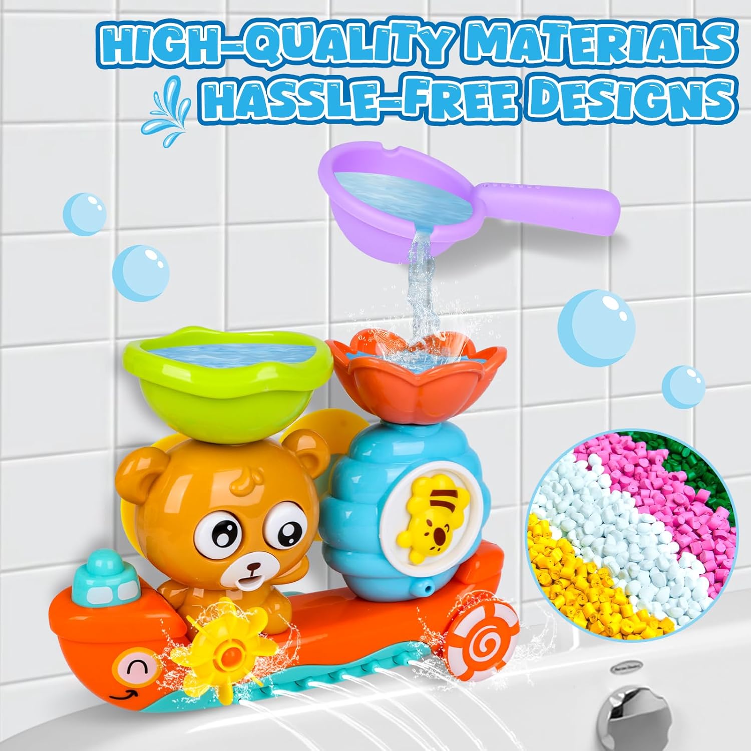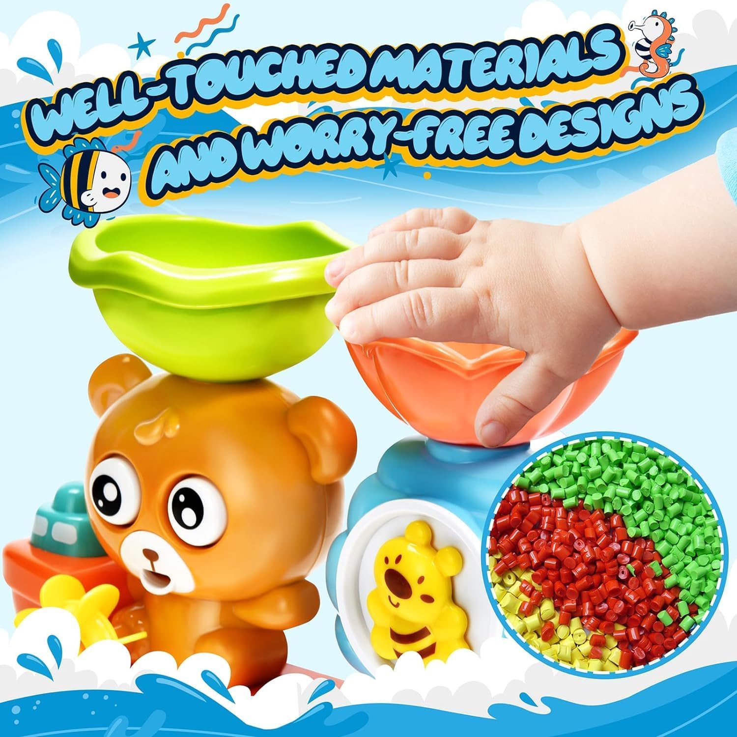 Напълно безопасна! Играчката е изработена от материал без BPA и остри ръбове. Здравите вендузи се държат здраво за ваната и тъй като не са необходими батерии, няма риск от поглъщане.