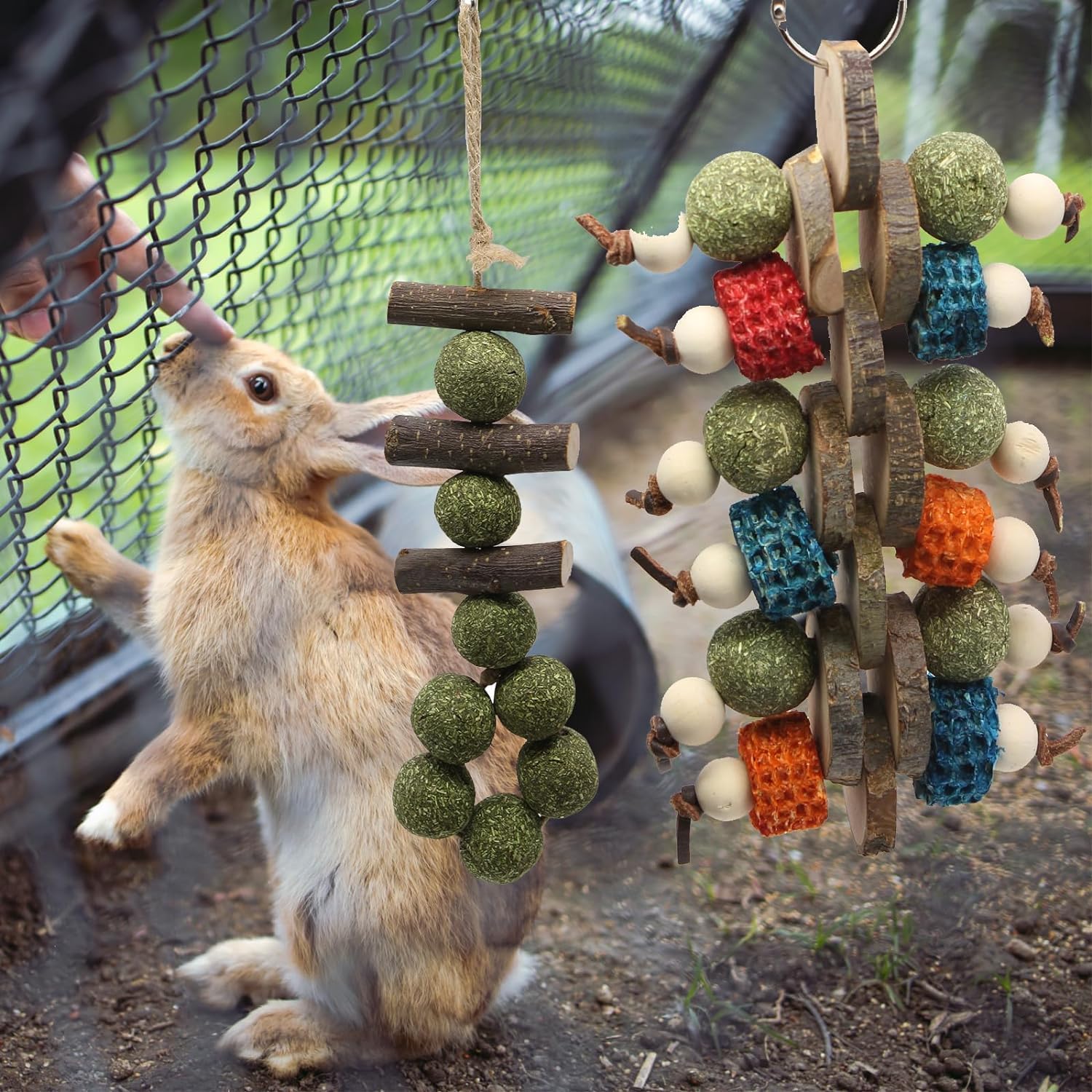 • Лакомството и дъвчащите снаксове за зайци са изработени от 100% натурален материал. Висококачествена връв от бала сено, изработена от ябълкова дървесина и ливадна трева за дъвчене. Естествени плетени топки за дъвчене и игра за зайци. Богатите на хранителни вещества тревни топки и питки спомагат за подобряване на храносмилането и повишаване на апетита.