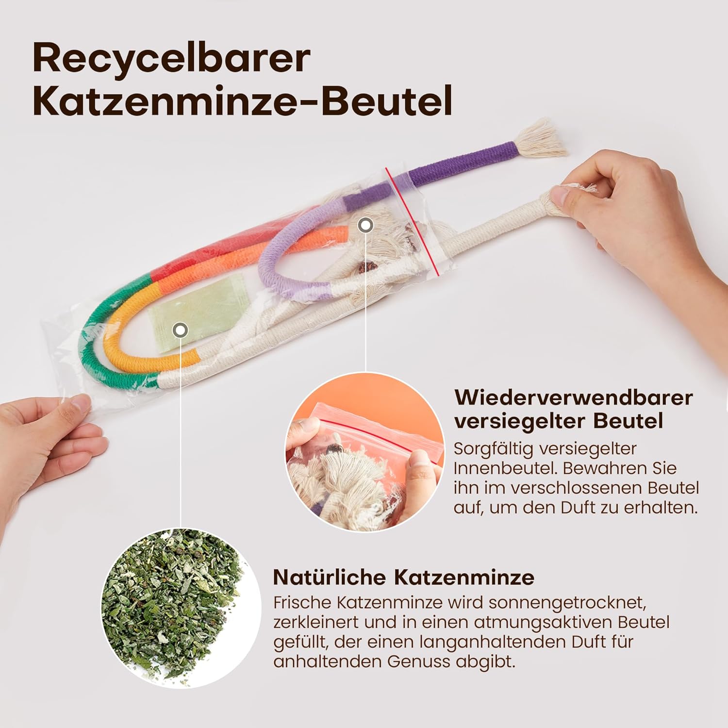 • Безопасни и органични: Тези играчки за дъвчене, ръчно изработени без метална тел и с въже от органичен памук, са безопасни за всички котки. В комбинация с торбичка за многократна употреба с котешка трева, те са важно и екологично допълнение към обогатяването на вашата котка.
