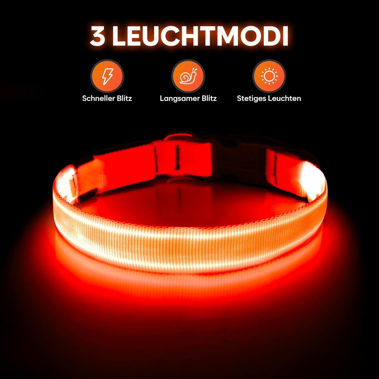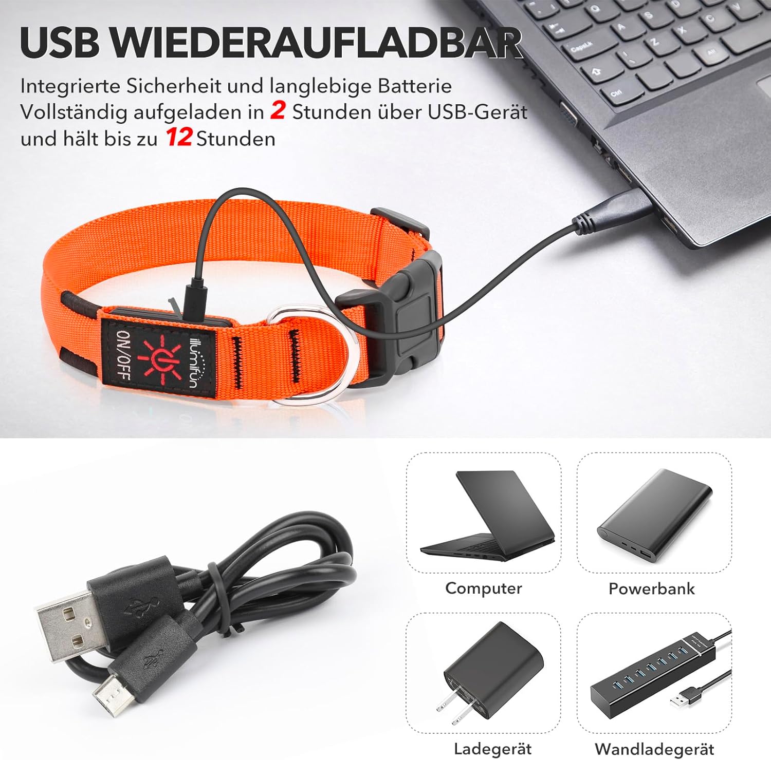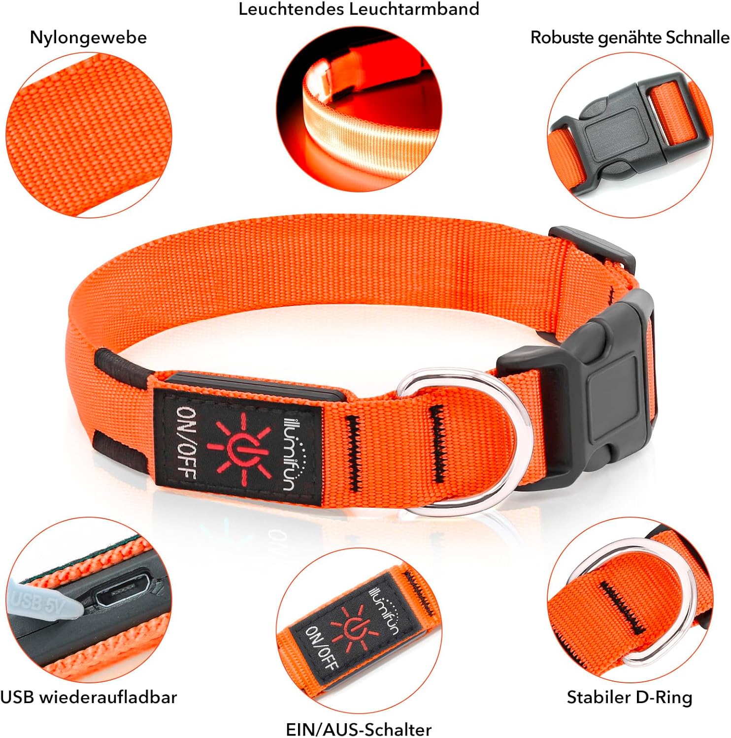Illumifun Светлинен нашийник за кучета, USB LED нашийник за кучета, Презареждащ се светещ нашийник за кучета, Регулируем размер, 3 режима на осветление за малки, средни, големи кучета
