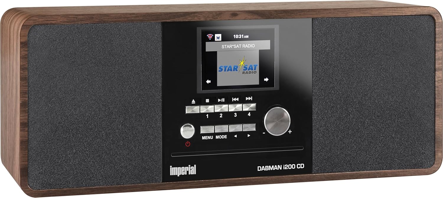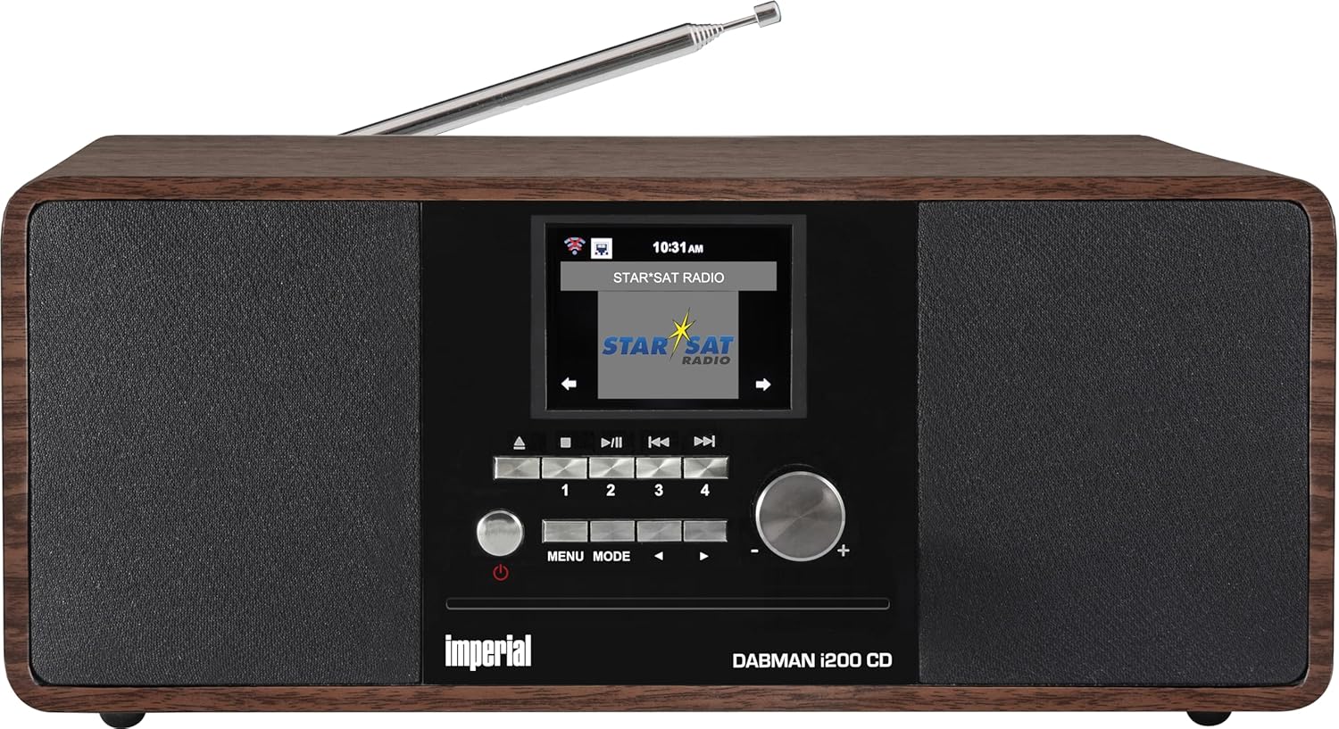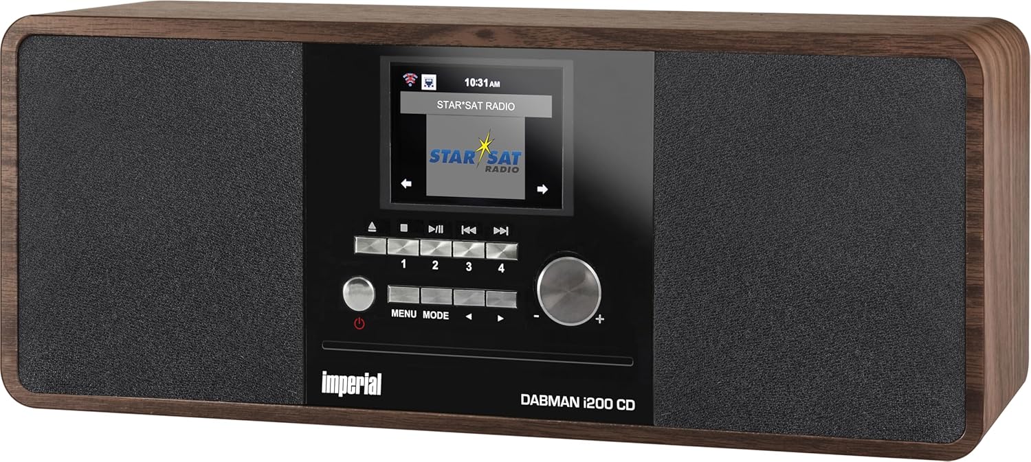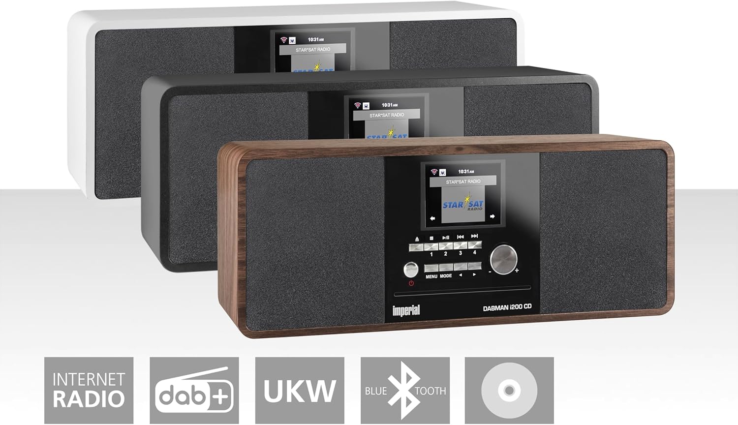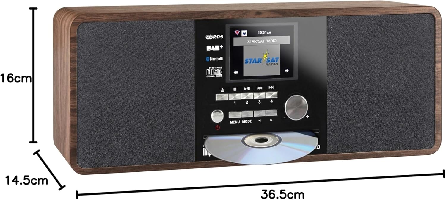 • Интернет (WLAN/LAN) DAB+ и FM радио (антена) със 7,2 см (2,8 инча) TFT цветен дисплей, дървен корпус с орехов вид