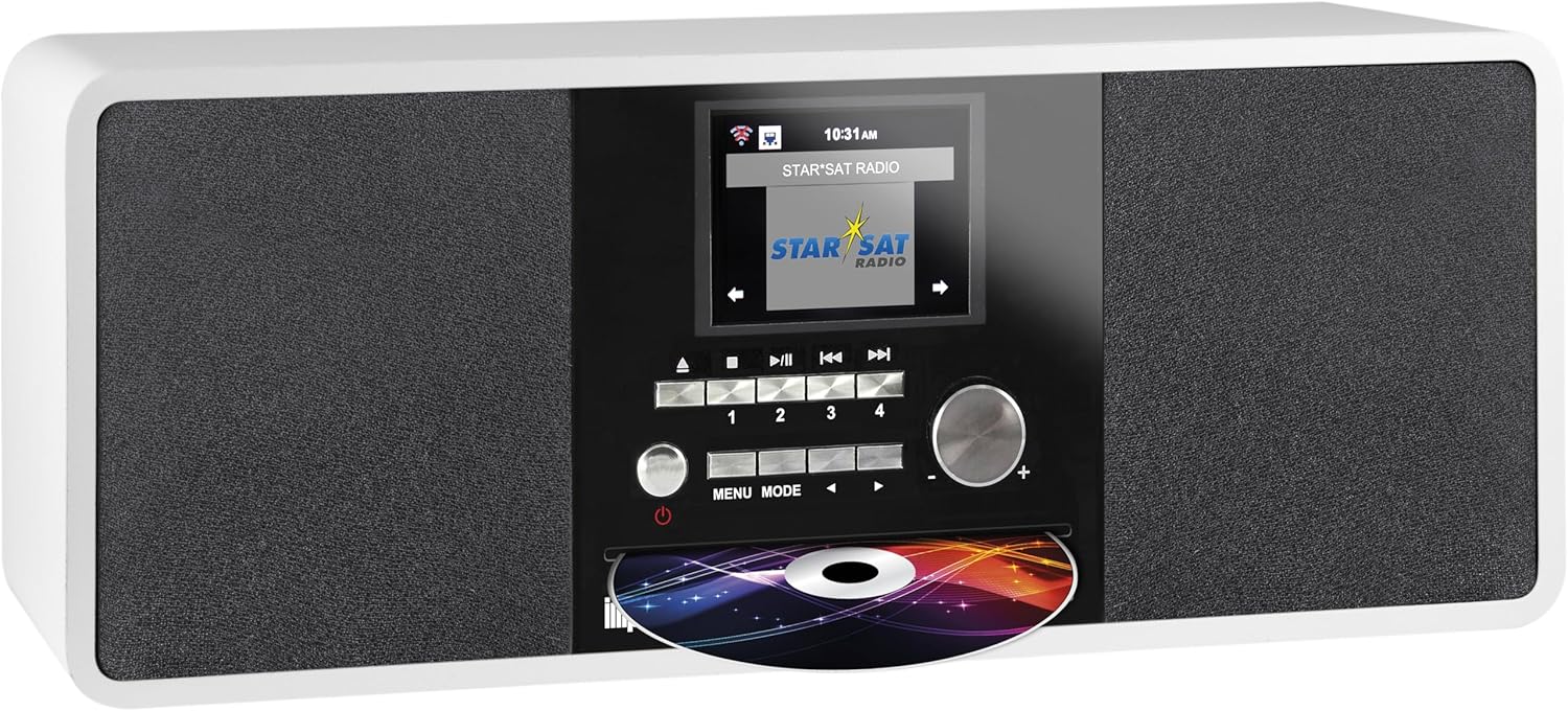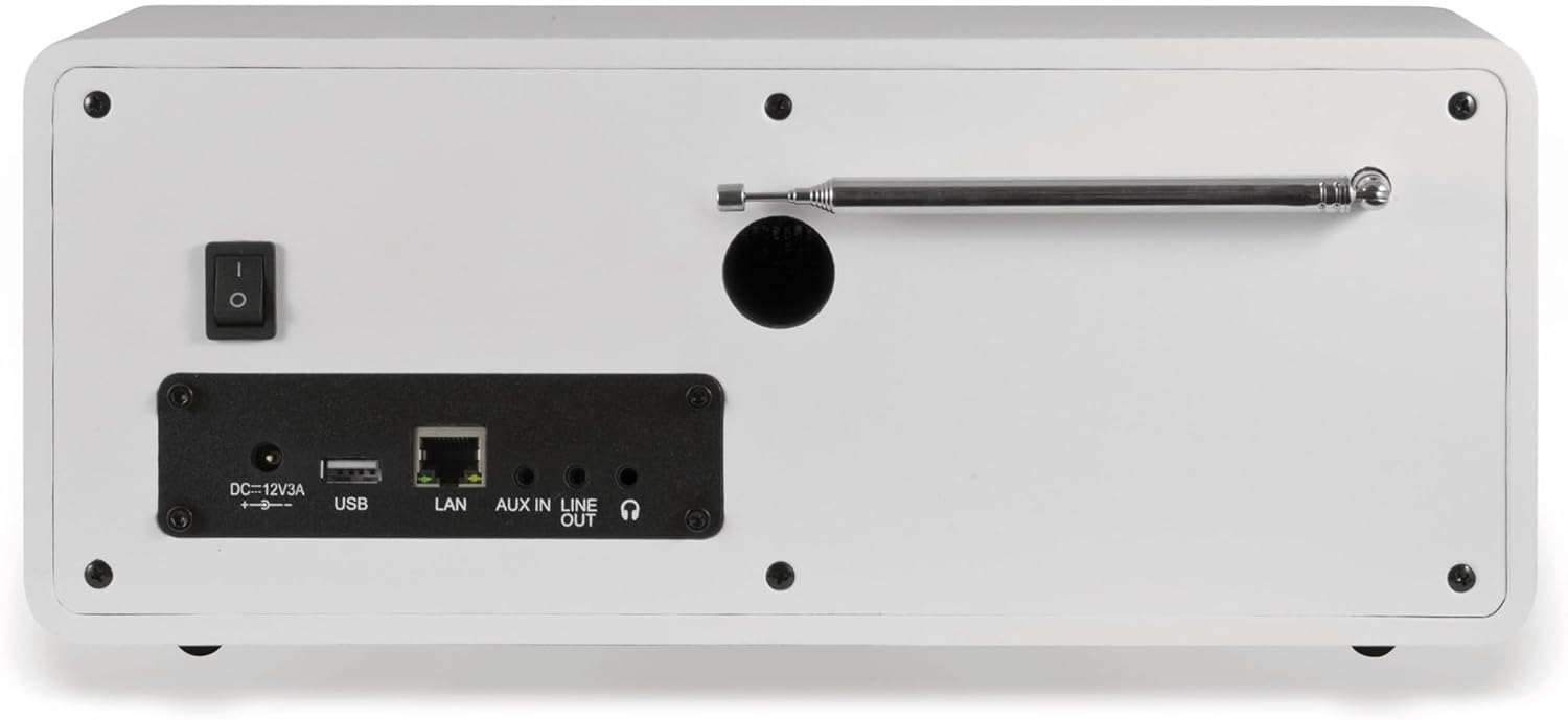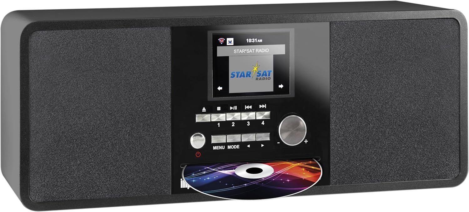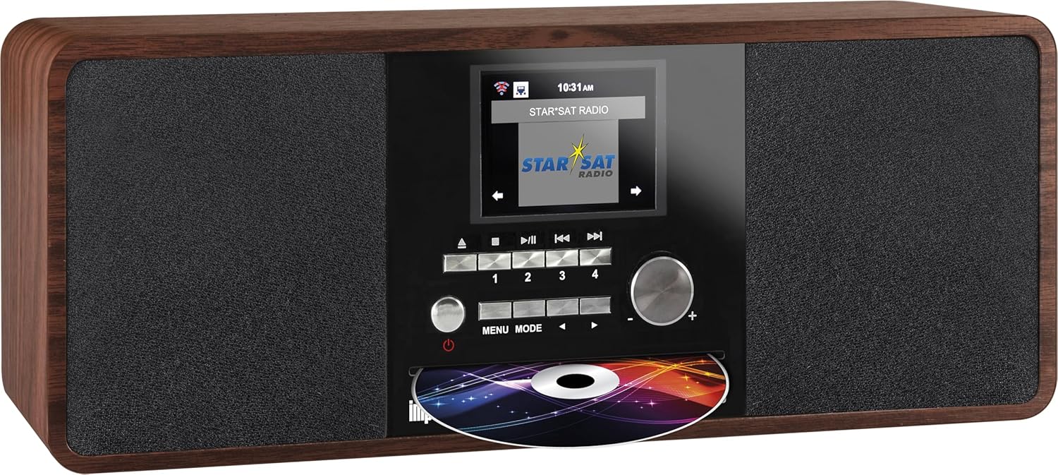 • Интернет (WLAN/LAN) DAB+ и FM радио (антена) със 7,2 см (2,8 инча) TFT цветен дисплей, дървен корпус с орехов вид