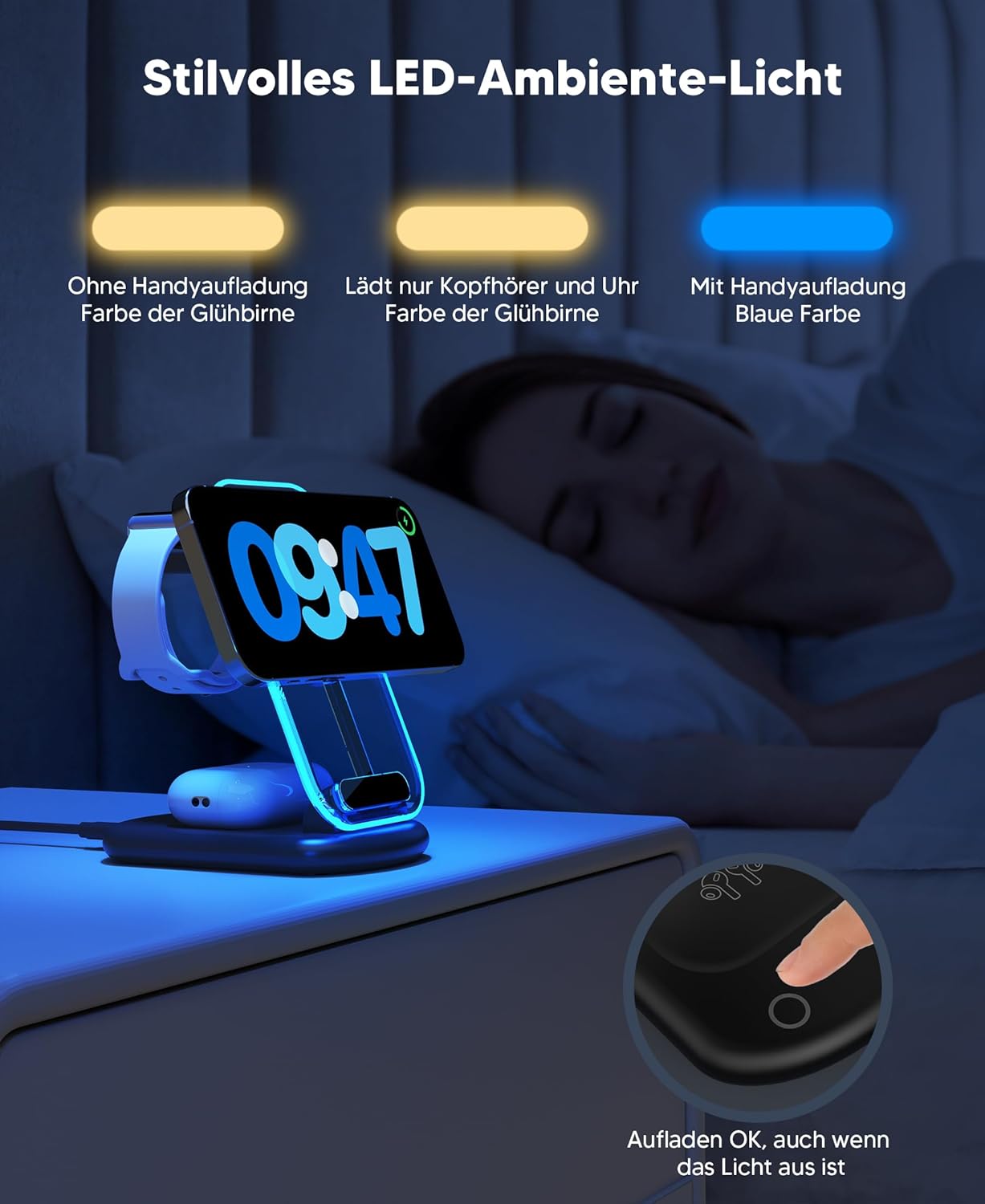 • Регулируема нощна лампа с тъчскрийн контрол: Нашата подобрена многофункционална станция за зареждане на Apple устройства е подходяща не само за зареждане на вашите устройства - тя осигурява и регулируемо околно осветление. Топлата светлина може да се използва като нощна лампа, когато е включена или в режим на готовност. Индикатор за напълно заредена или заредена лампа: телефон - синя светлина винаги включена. Индикатор за зареждане: телефон - синя светлина винаги включена; слушалки, часовник - не свети. Можете също да докоснете превключвателя, за да контролирате светлината през нощта. Идеална за кабинет, спалня и декорация до леглото.