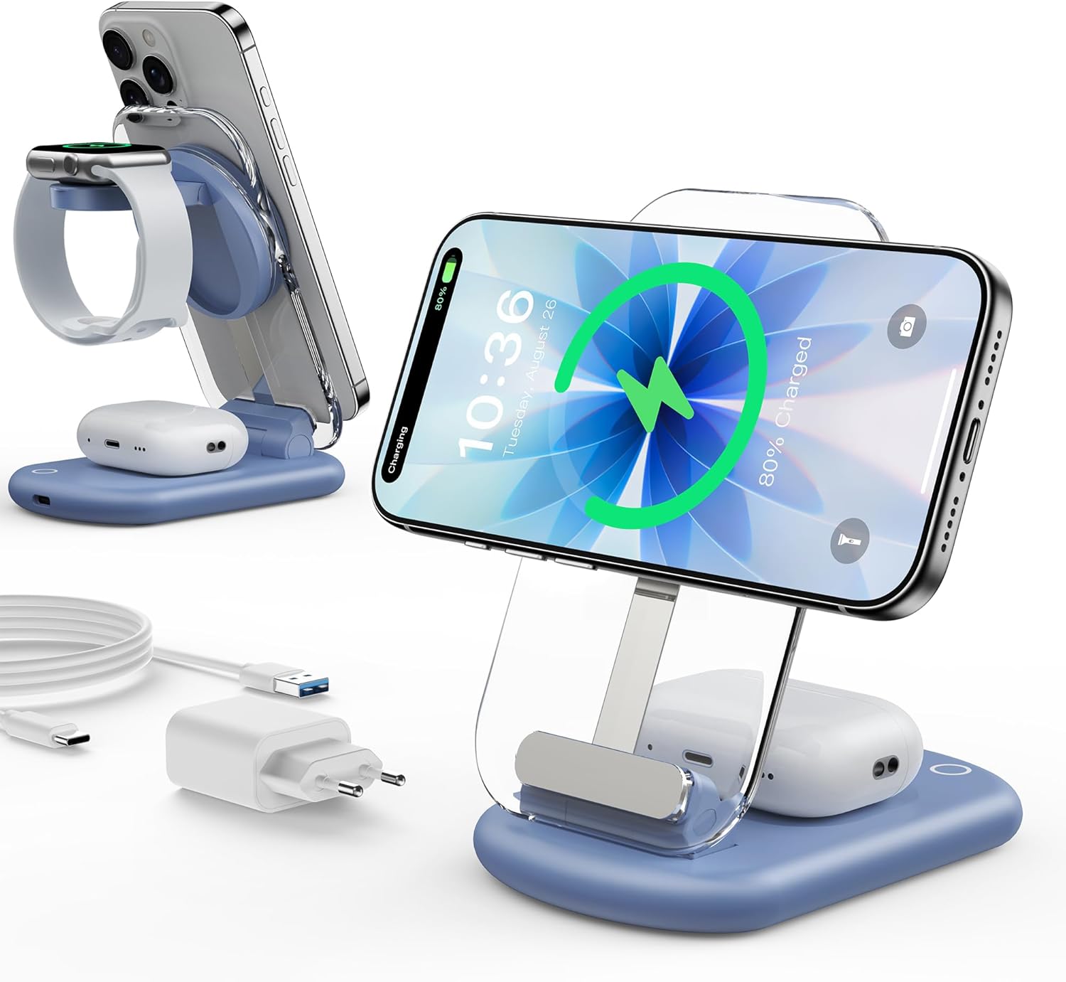 • 3-в-1 магнитно безжично зарядно: усъвършенстваната сигурна магнитна станция за зареждане поддържа едновременно зареждане на iPhone, iWatch и AirPods. Така можете да сложите край на заплетените кабели и да подредите бюрото си. Магнитната всмукателна мощност е подходяща за iPhone 17/17 Air/17 Pro/17 Pro Max/16/15/15 Pro/15 Plus/15 Pro Max/14/14 Pro/14 Plus/14 Pro Max. Съвместима е и с iWatch 10/9/8/7/6/5/4/3/2/SE/Ultra/Ultra 2, за AirPods 2/3/4/Pro/Pro 2 (Забележка: за AirPods 2/3/4 има 2 версии, работи само с калъф за безжично зареждане, не поддържа калъфи за зареждане A3058, A2897, A1602).