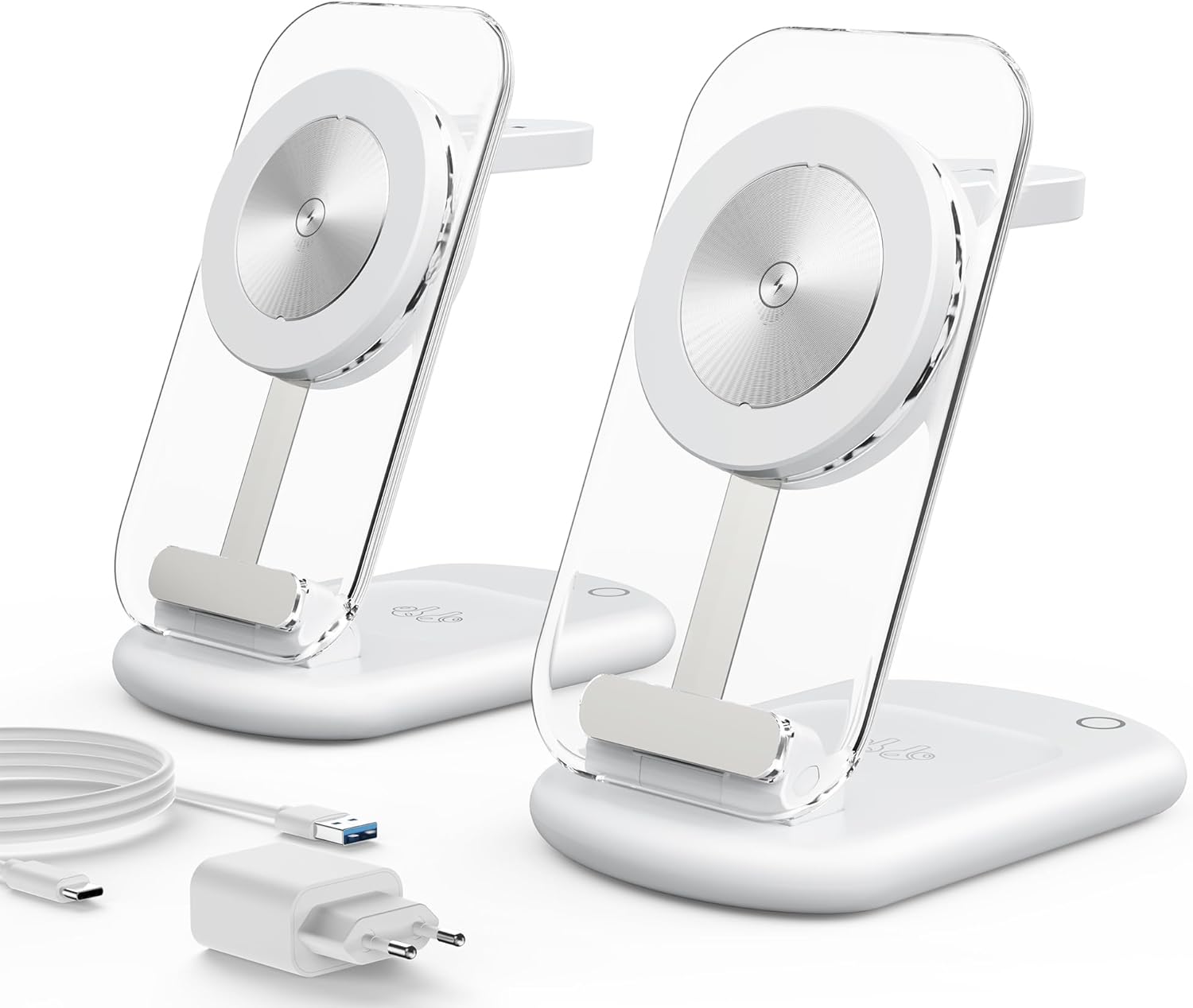 • 【Бързо и безопасно бързо зареждане】Магнитно безжично зарядно устройство с 3 различни режима на зареждане: портретен, пейзажен и плосък режим. Предлага се с 18W QC 3.0 адаптер и 1 USB A към Type C кабел (1 м). Това магнитно безжично зарядно устройство може да зарежда iPhone 17/16/15/14/13 от 0% до 100% за 3-3,5 часа (базирано на нашите лабораторни тестове). Почти толкова бързо, колкото оригиналното зарядно устройство Apple Mag Safe. Интелигентният ETL сертифициран чип за безопасност предпазва телефона ви от презареждане, претоварване по ток, пренапрежение, прегряване и късо съединение. Бързо и безопасно зареждане.