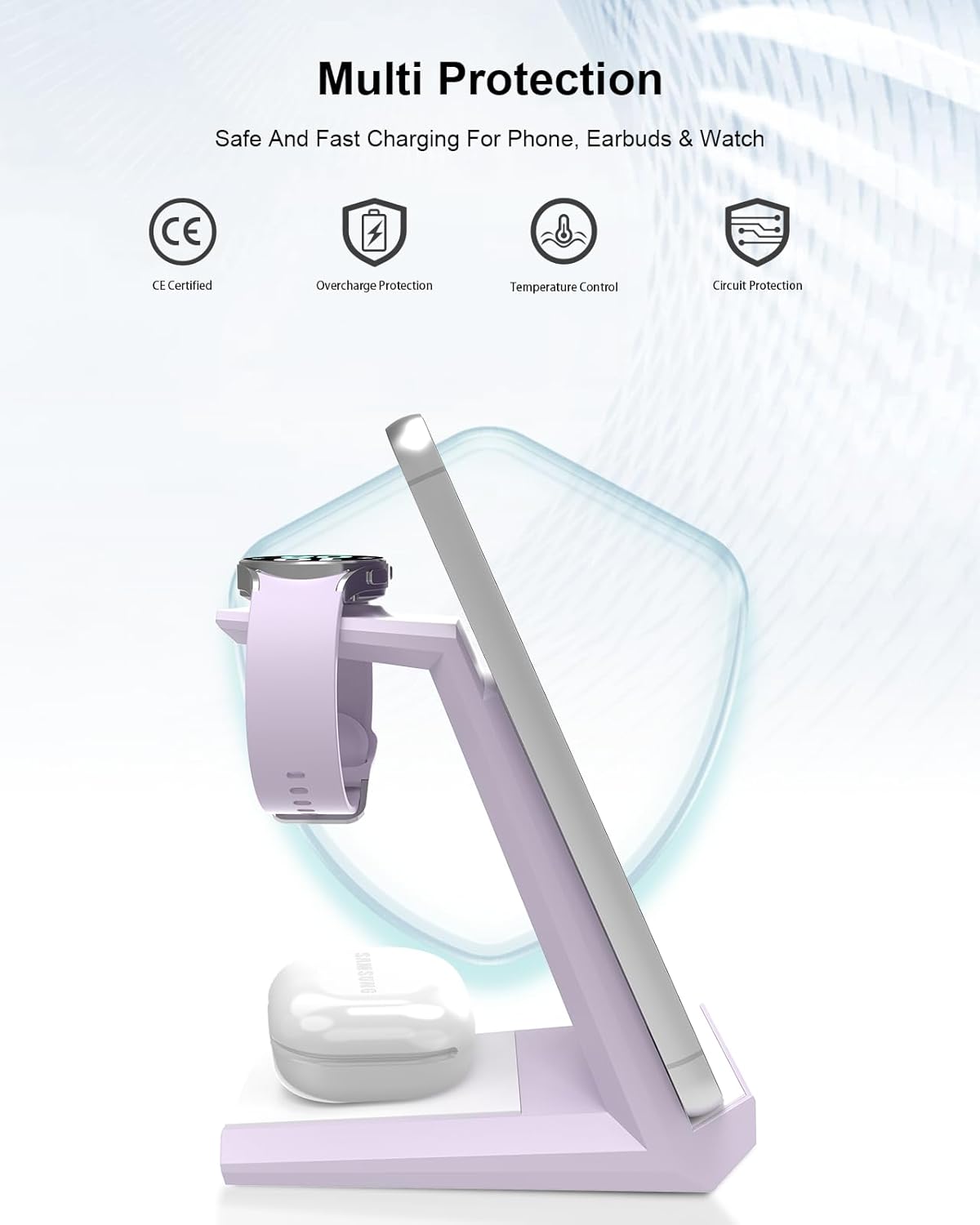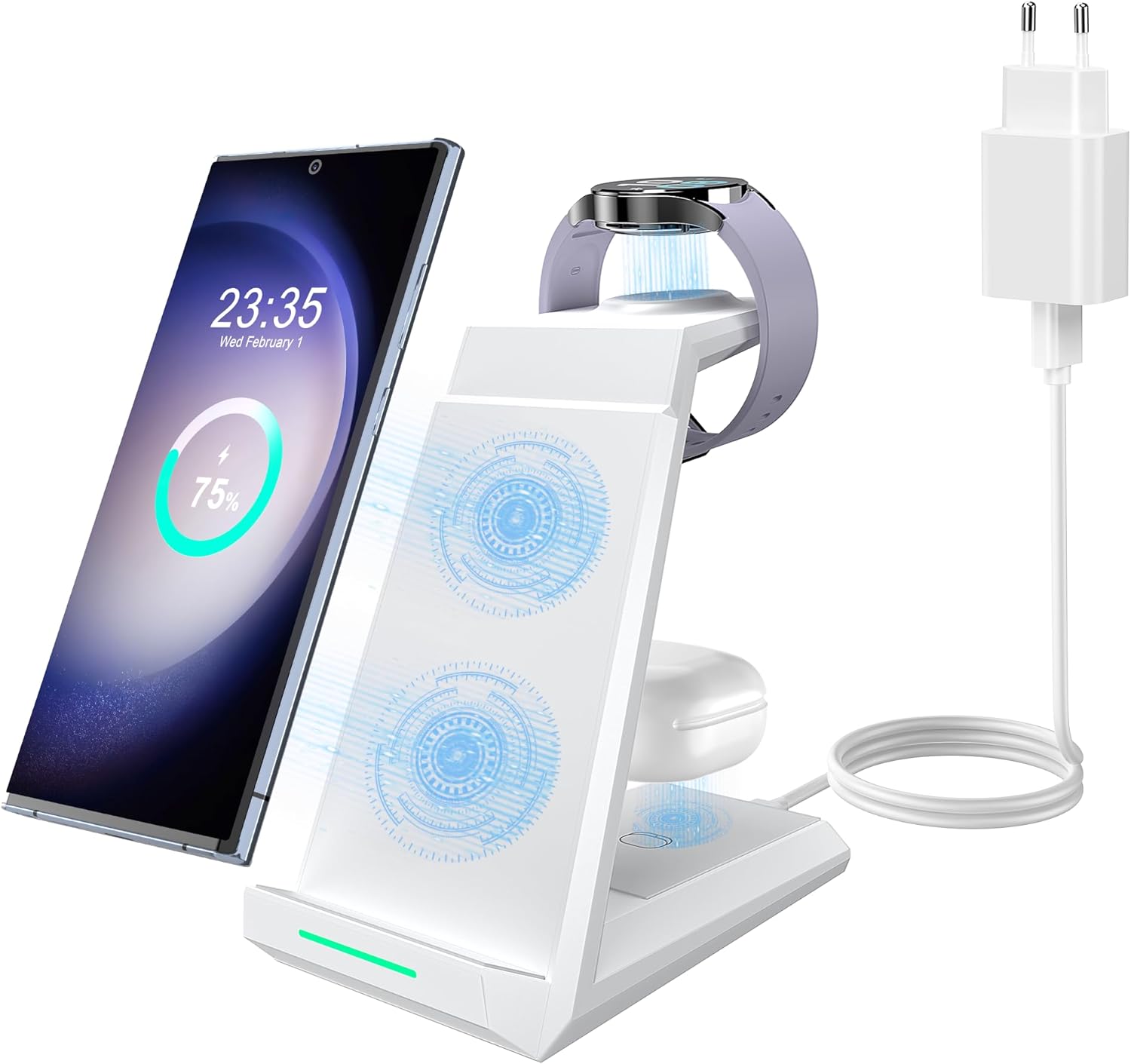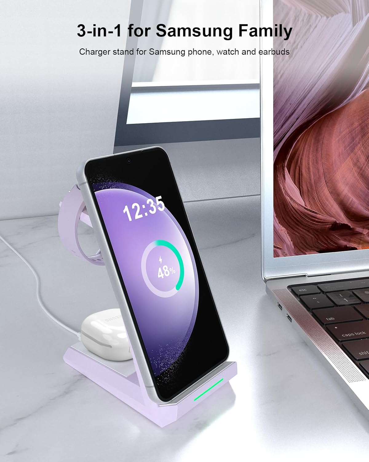 • Перфектен избор за потребители на Samsung: 3-в-1 индуктивна зарядна станция, проектирана за вашите Samsung устройства, чудесна алтернатива на безжичното зарядно устройство на Samsung. Поддържа безжично зареждане за Samsung Galaxy S25/S24/S23/S23+/S23 Ultra/S22/S22+/S22 Ultra/S21/S21+/S21 fe/S21 Ultra/S20/S20+/S20 Ultra/S20/S10/S9/S8/S7/S6 Series; за Galaxy Note 20,10,10e,10+,9,8,7,5; Съвместима със Samsung Galaxy Watch 7/6/5 Pro/5/4 Classic/4/3/Active 2 (Забележка: Не е съвместима с часовници Samsung Gear S1-S4); Galaxy Buds/Buds+/Pro/Live/2, AirPods 2/3/Pro.