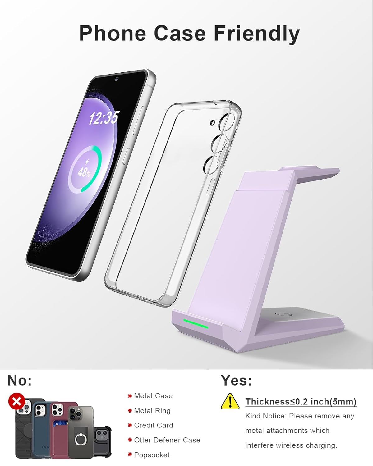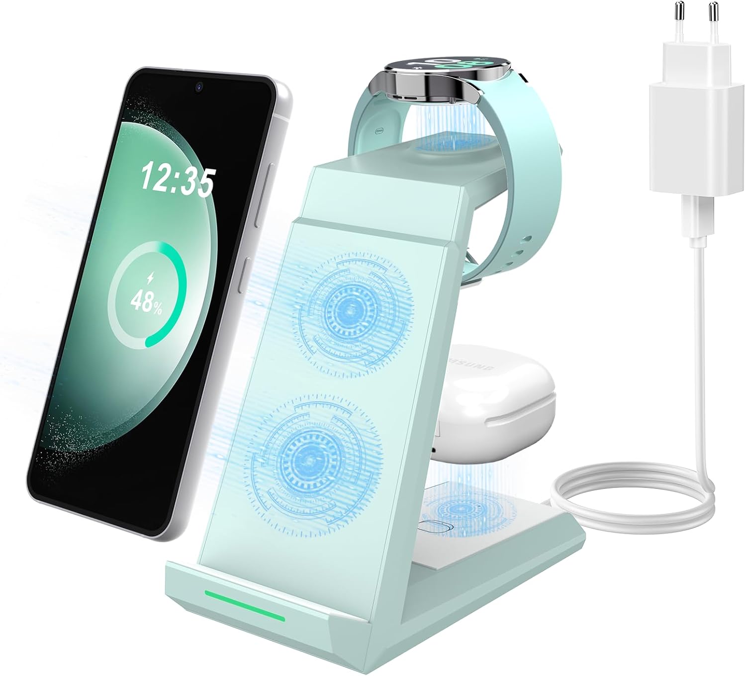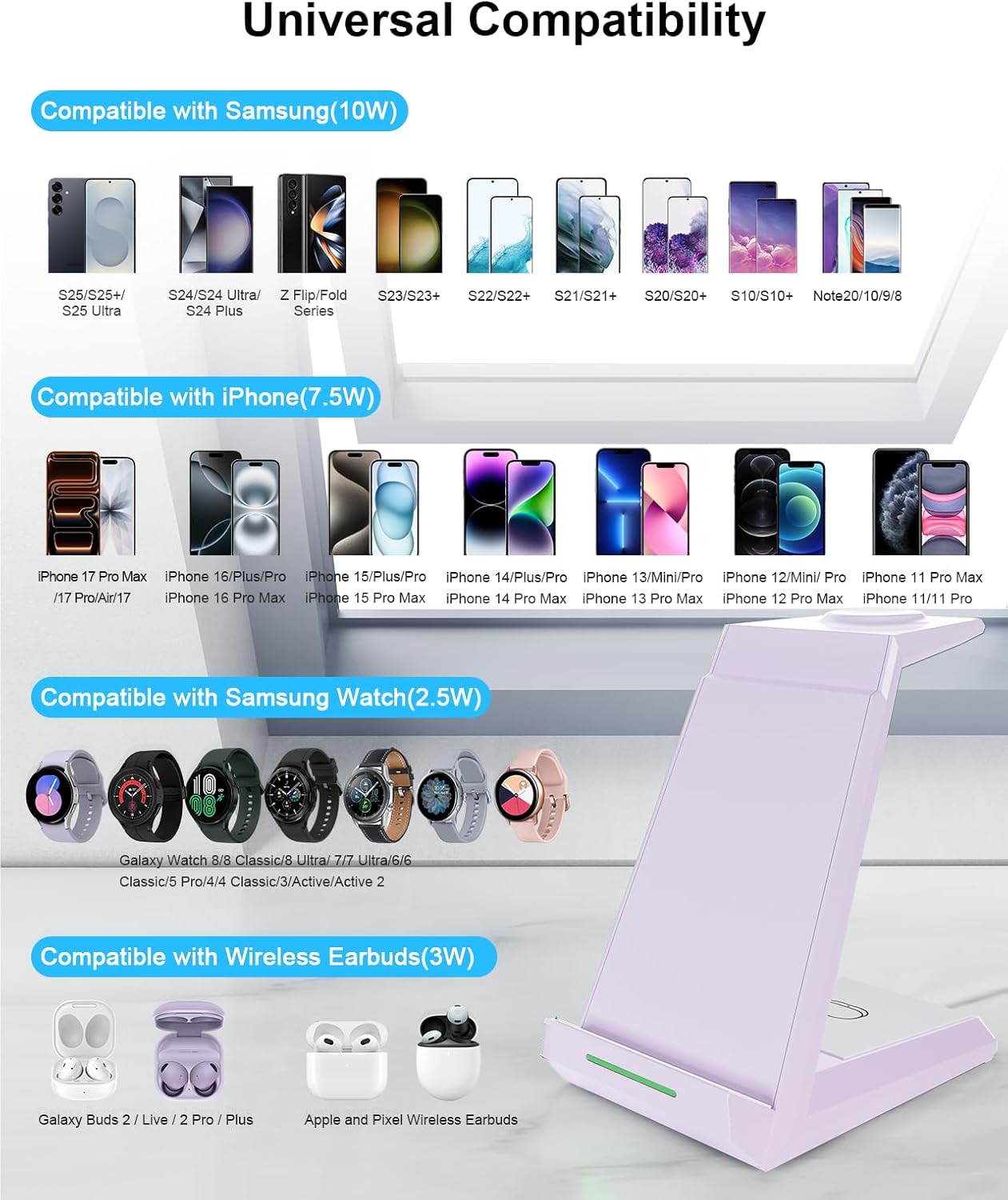 • Перфектен избор за потребители на Samsung: 3-в-1 индуктивна зарядна станция, проектирана за вашите Samsung устройства, чудесна алтернатива на безжичното зарядно устройство на Samsung. Поддържа безжично зареждане за Samsung Galaxy S25/S24/S23/S23+/S23 Ultra/S22/S22+/S22 Ultra/S21/S21+/S21 fe/S21 Ultra/S20/S20+/S20 Ultra/S20/S10/S9/S8/S7/S6 Series; за Galaxy Note 20,10,10e,10+,9,8,7,5; Съвместима със Samsung Galaxy Watch 7/6/5 Pro/5/4 Classic/4/3/Active 2 (Забележка: Не е съвместима с часовници Samsung Gear S1-S4); Galaxy Buds/Buds+/Pro/Live/2, AirPods 2/3/Pro.