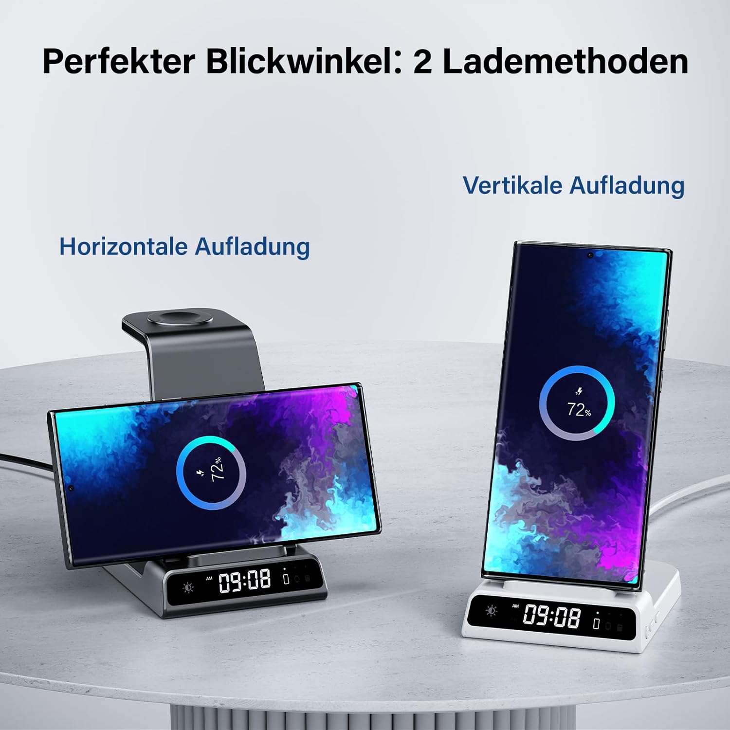• Лесно за употреба - Зарядната станция за Samsung поддържа вертикално или хоризонтално безжично зареждане, така че можете да виждате телефона си по-удобно, докато го зареждате. Тя може да прехвърля зарядна мощност през калъфа на телефона ви (≤ 5 мм/0,2 инча), но магнити, метални приставки или карти могат да попречат на зареждането.
