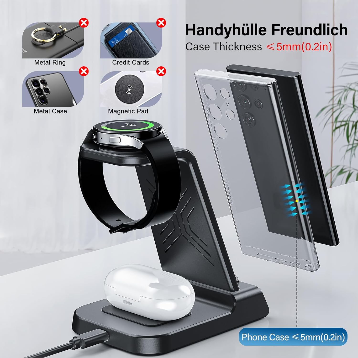 • 3-в-1 зарядна станция - Безжичното зарядно устройство Phelinta може да зарежда телефона, часовника и слушалките ви едновременно. Широко съвместимо със серията Samsung S25 Ultra/S24/S23/S22/S21/S20/S10, серията Z Flip 7/Z Fold 6, серията Note. Съвместимо с Galaxy Watch 8/8 Classic/Ultra/7/6 Classic/6/5 Pro/5/4/3/Active 2/1 (!Не е за Apple Watch), също така за Galaxy Buds 3/Buds 3 Pro/Buds 2/Buds 2 Pro/Buds Pro/Buds Live и други слушалки, които се зареждат безжично.