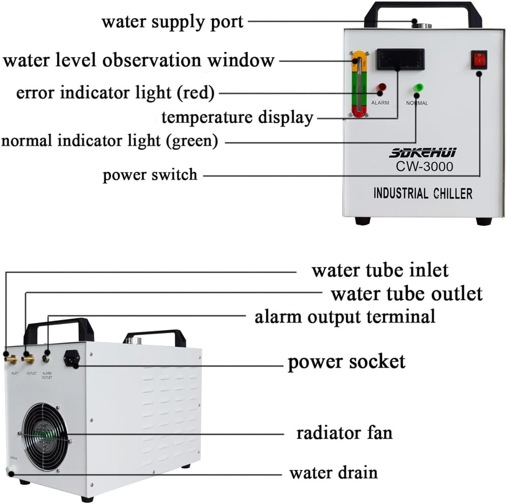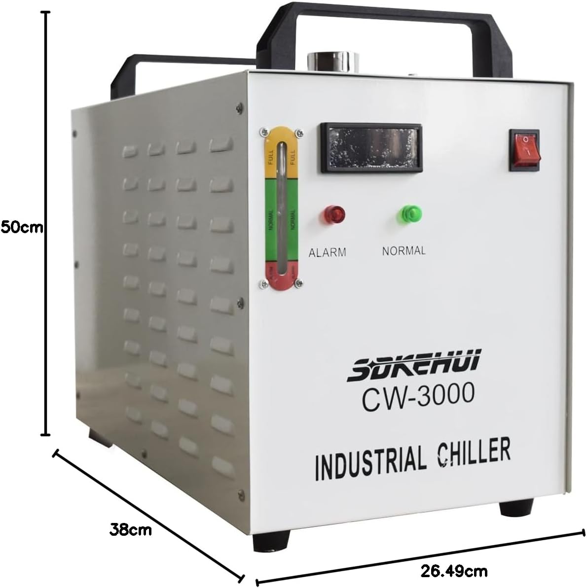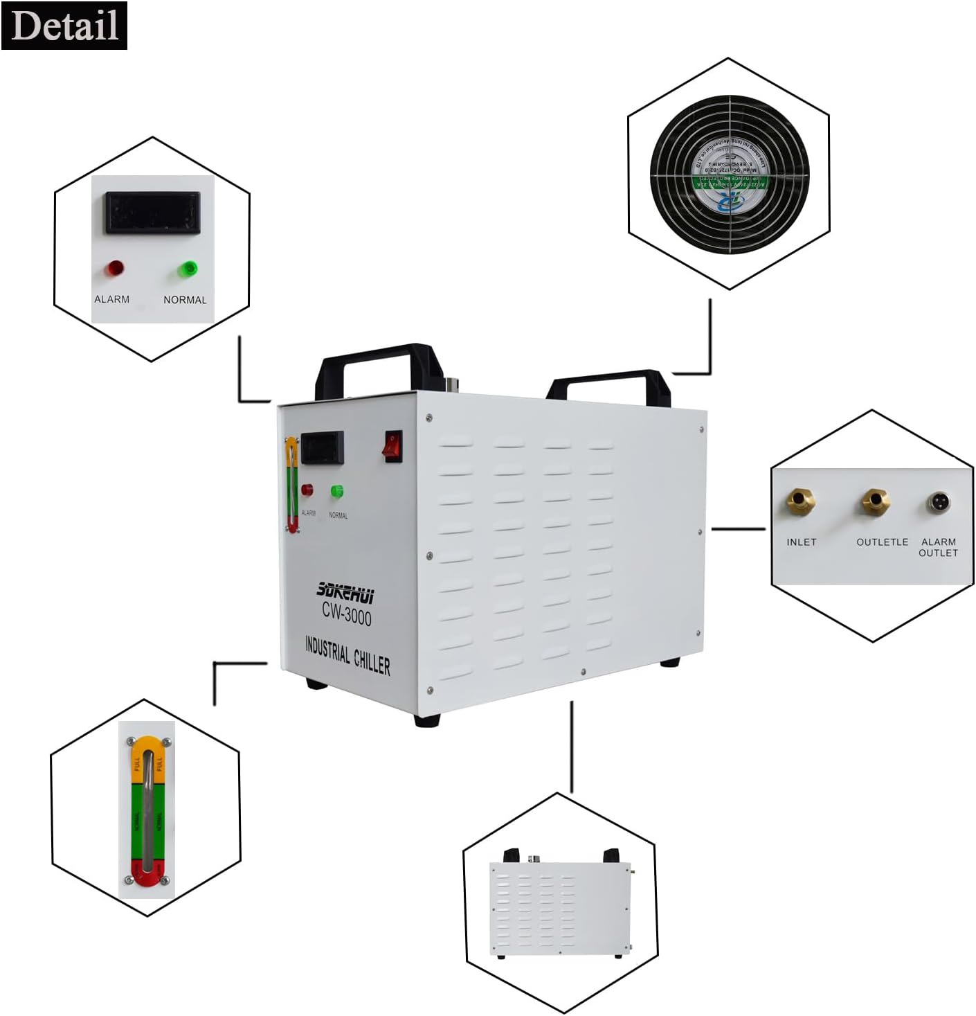 • Параметри на продукта: индустриалният охладител за вода CW-3000 е с капацитет 9 л, максимален дебит 10 л, охлаждаща мощност 50 W/°C, напрежение 220 V, честота 50 Hz и ток 0,45 A.
