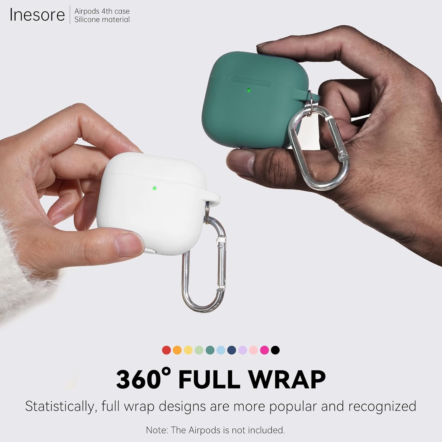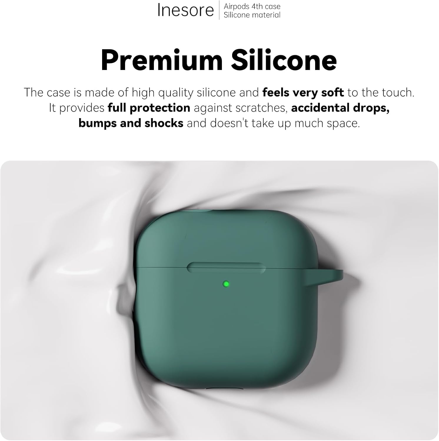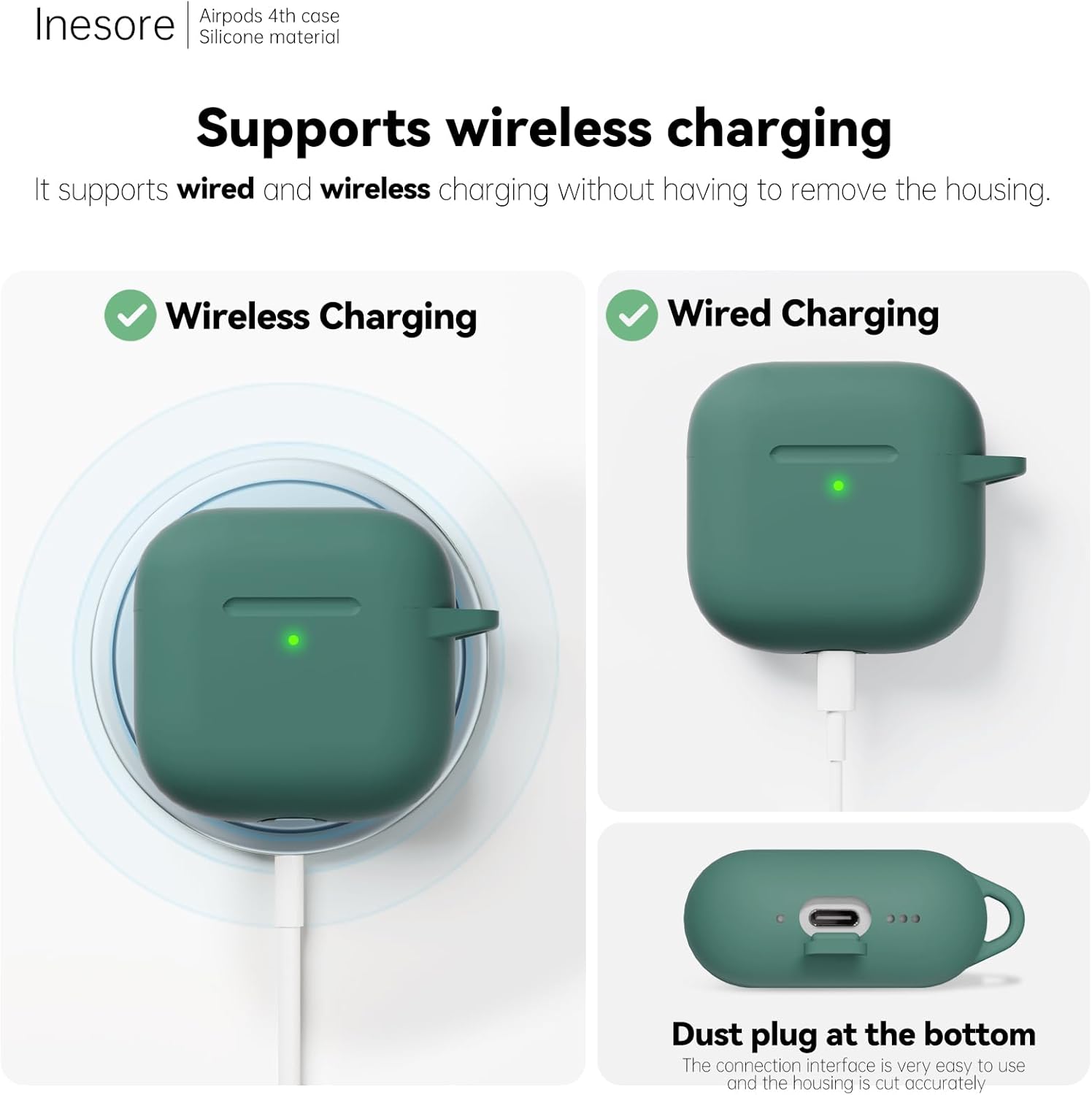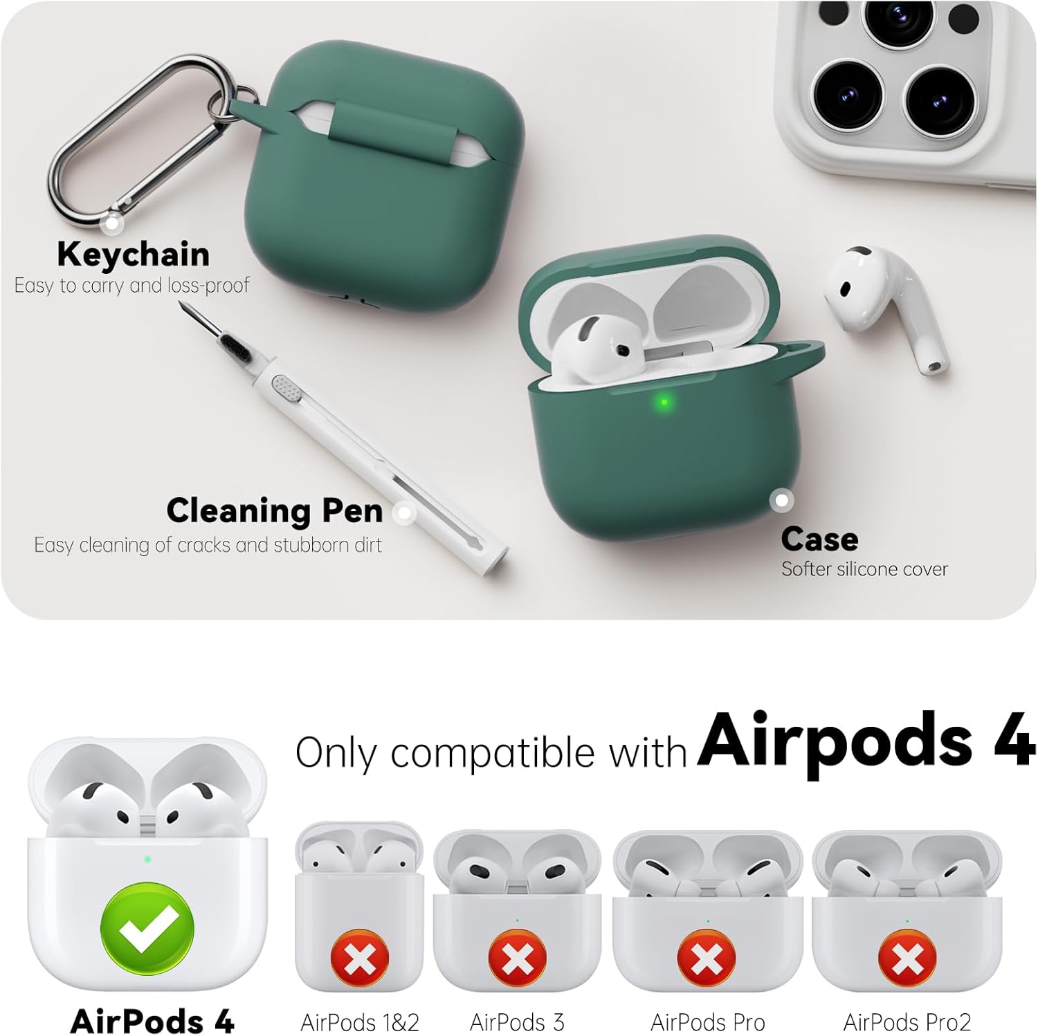 Inesore Съвместим с Airpods 4 Калъфи, Силиконов защитен калъф за Apple Airpods 4 с активно шумопотискане, поддръжка на безжично зареждане и видим преден LED, с почистваща писалка, зелен