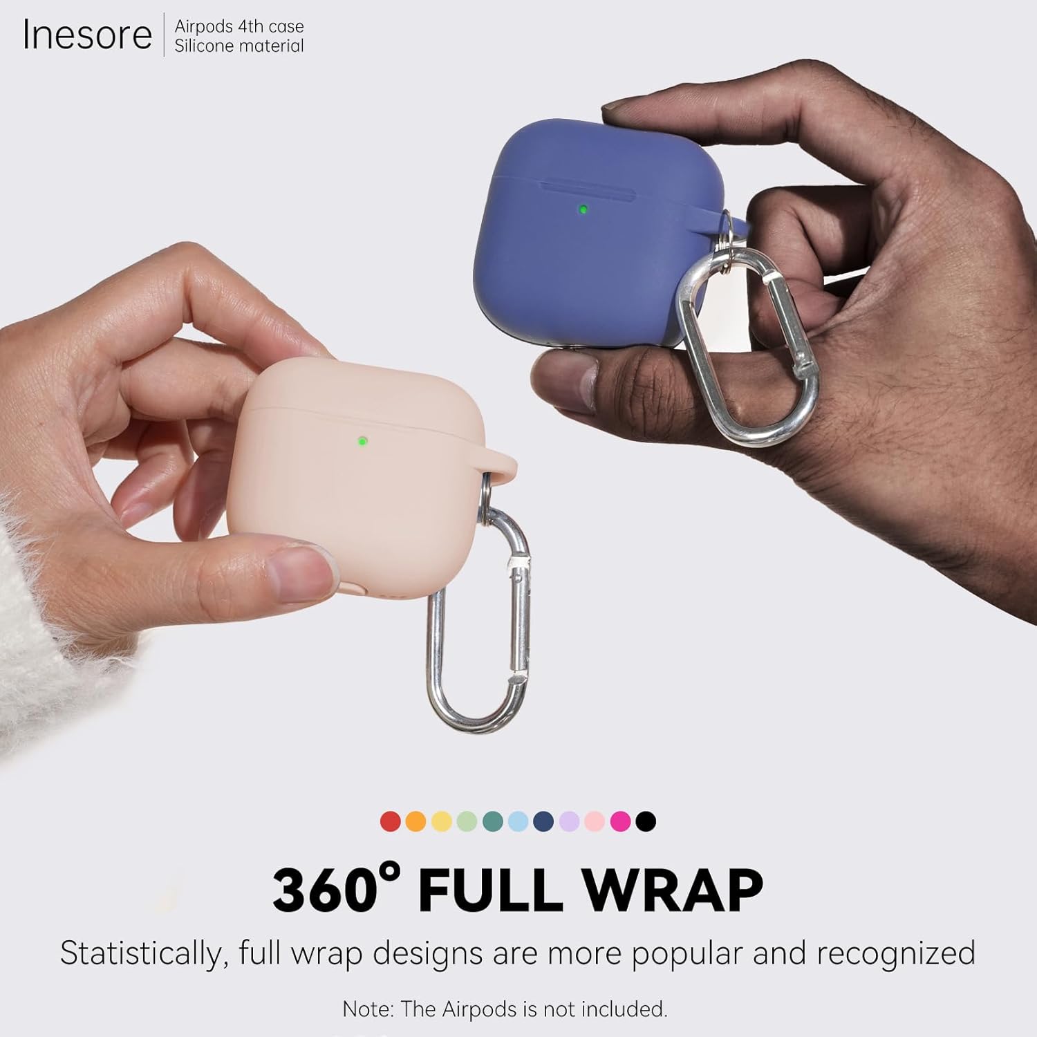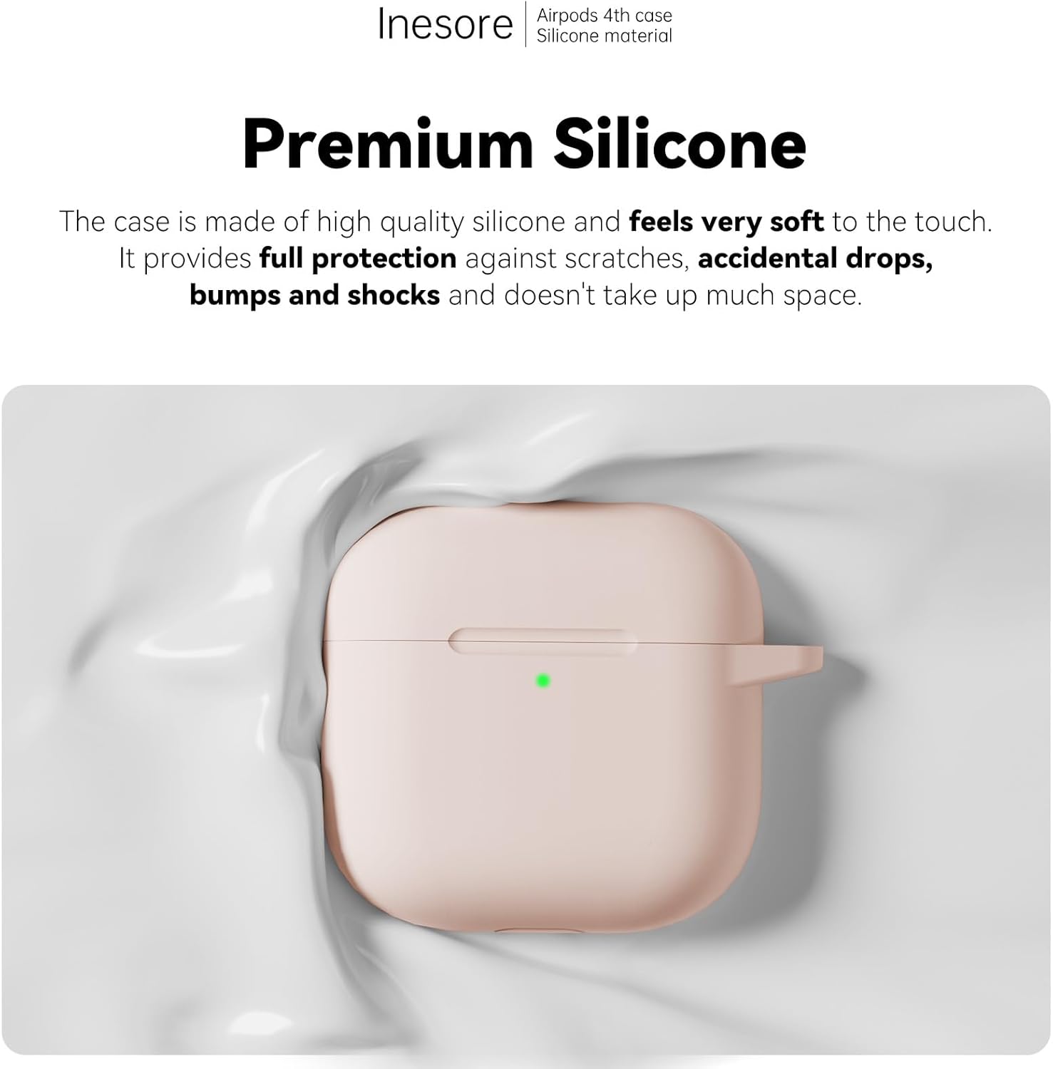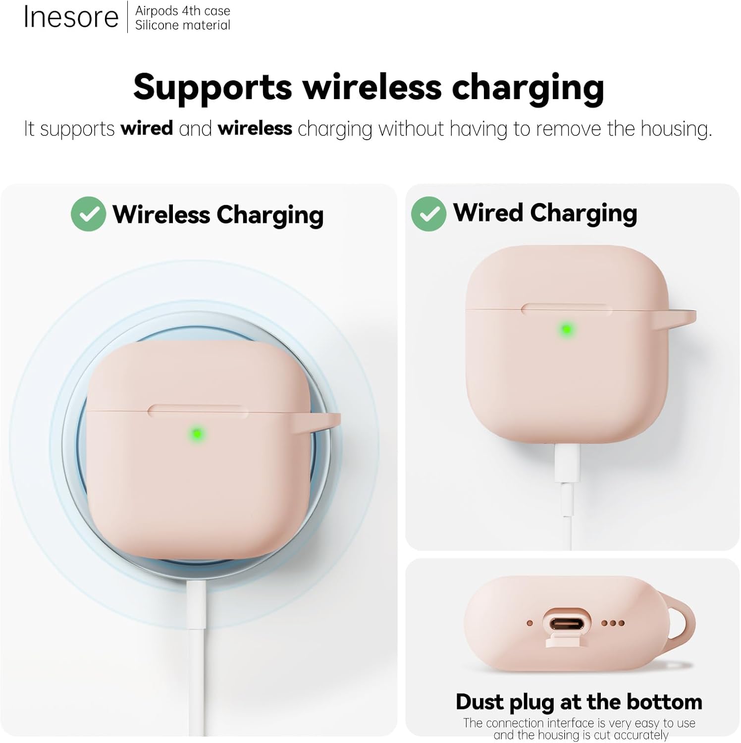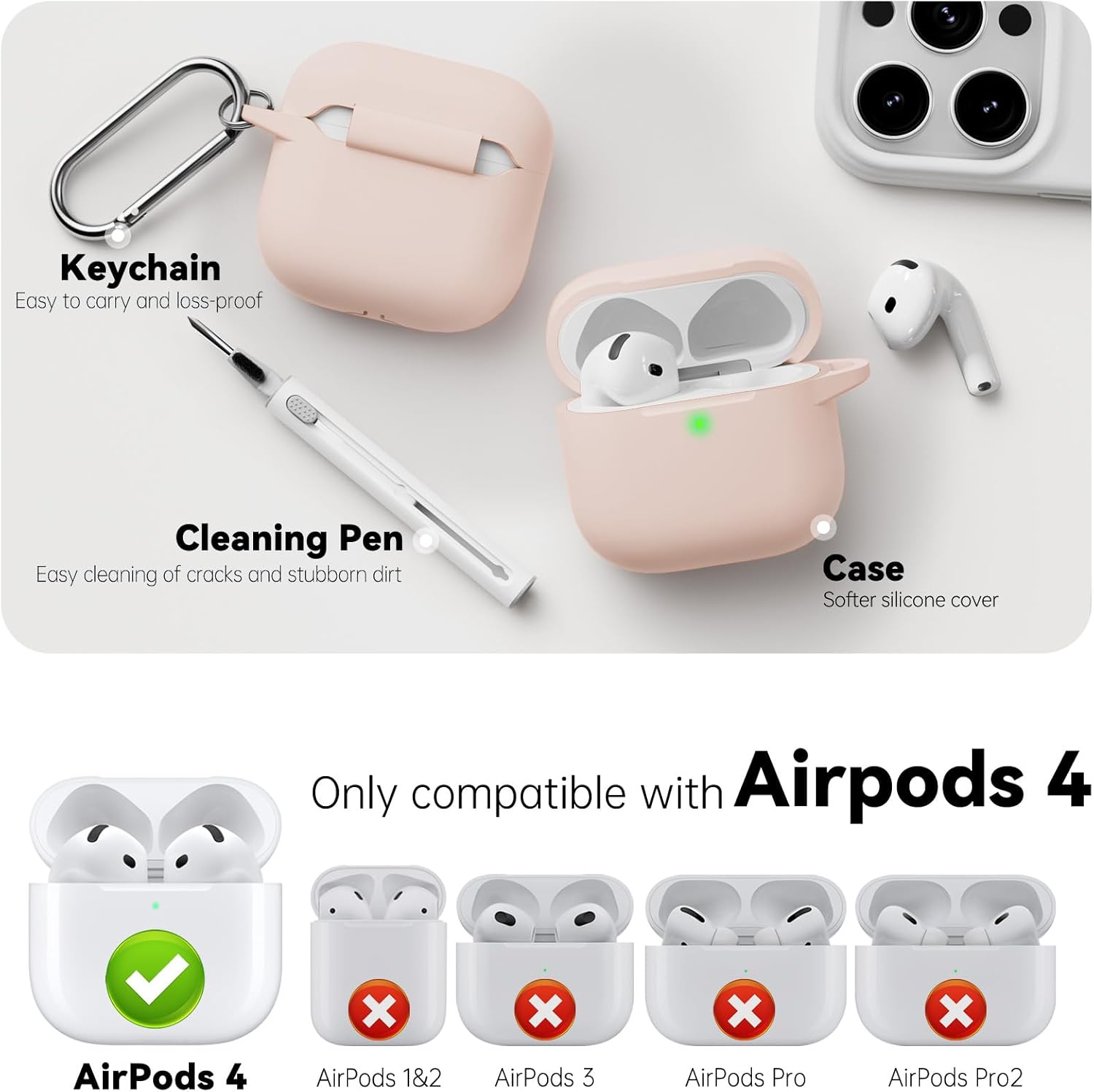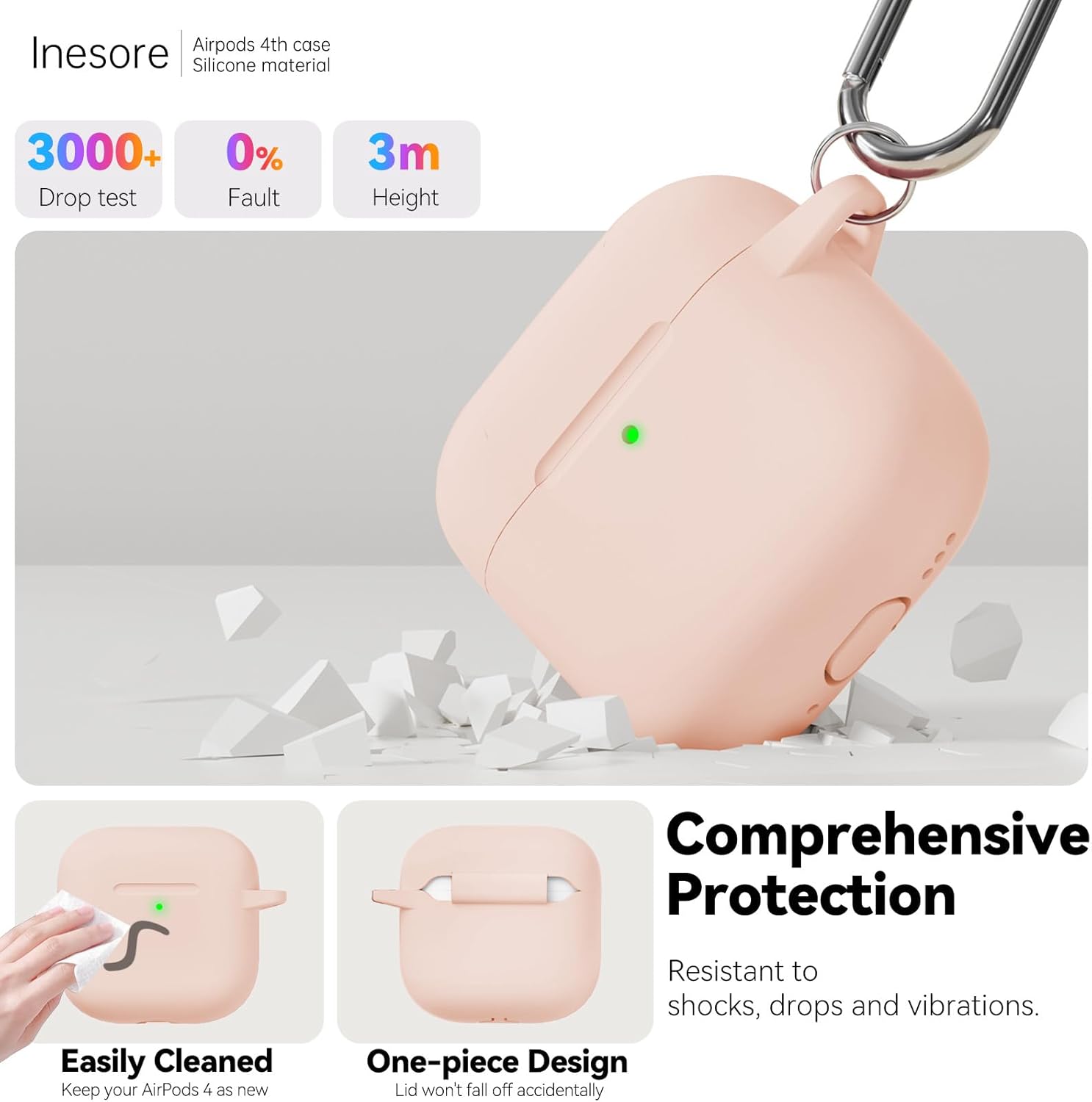 Inesore Съвместим с Airpods 4 Калъфи, Силиконов защитен калъф за Apple Airpods 4 с активно шумопотискане, поддръжка на безжично зареждане и видима предна LED светлина, с почистваща писалка, кремаво розов