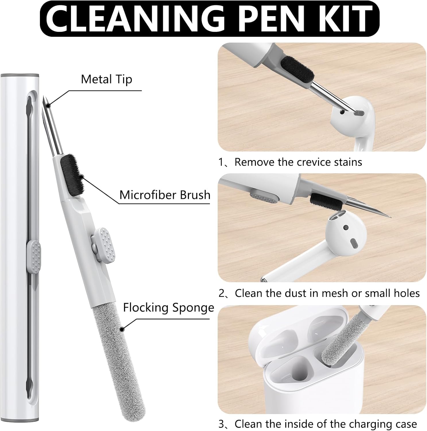 • Комплект за почистване 3 в 1: Почистваща писалка с връх за писалка, мека четка и четка за флокиране с висока плътност. Може да ви помогне да премахнете прах и мръсотия от слушалките си. Винаги поддържайте AirPods като нови.