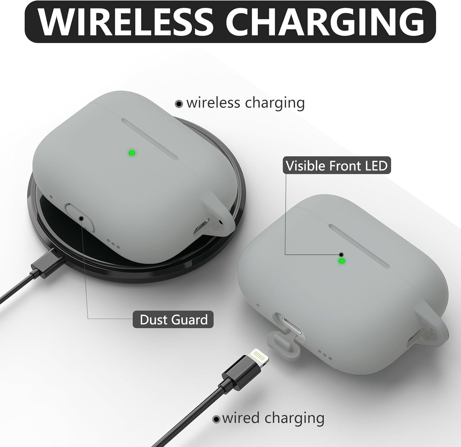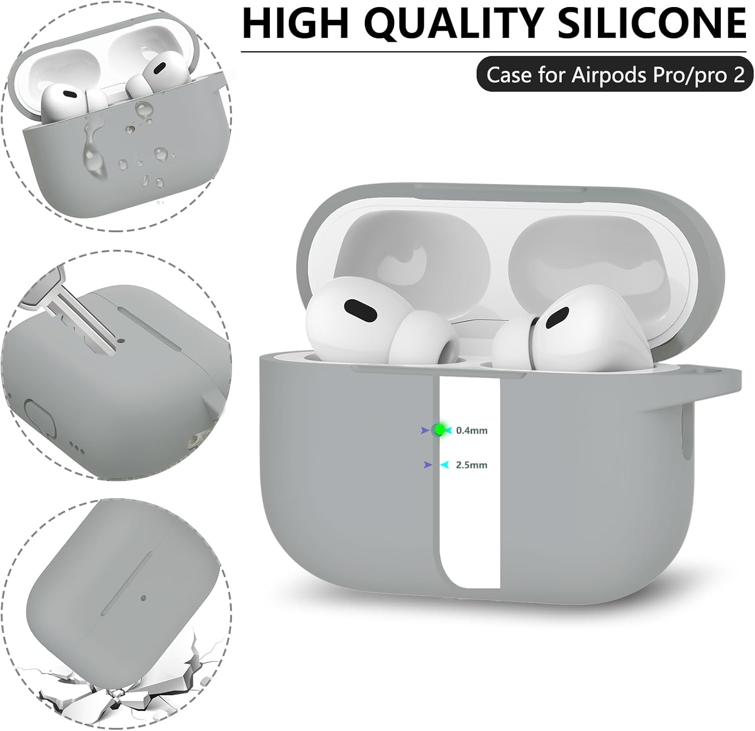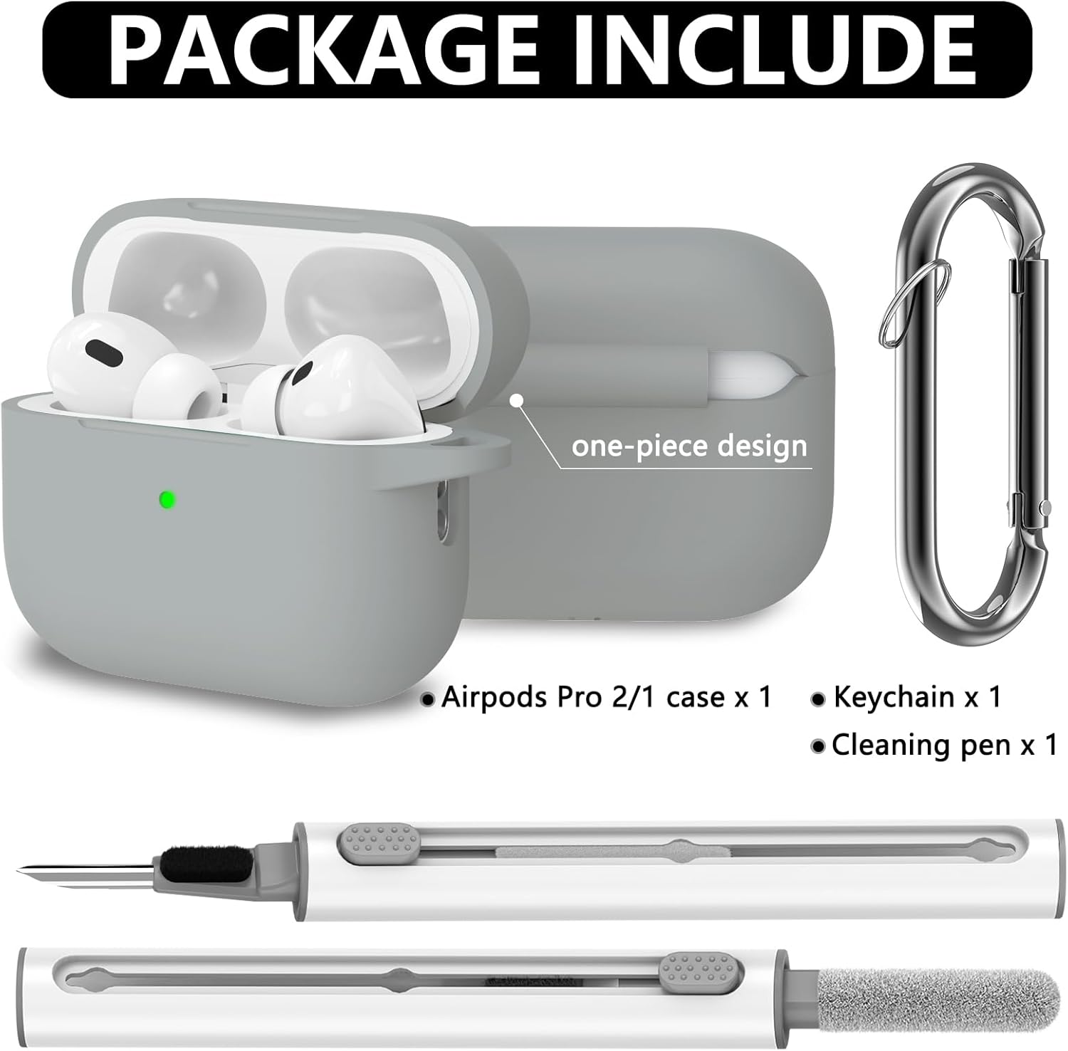 Inesore, съвместим с Airpods Pro 2-ро/1-во поколение, силиконов защитен калъф за Apple Airpods Pro 2-ро/1-во поколение, калъф за зареждане с ключодържател и почистваща писалка, за жени и мъже (светлосив)