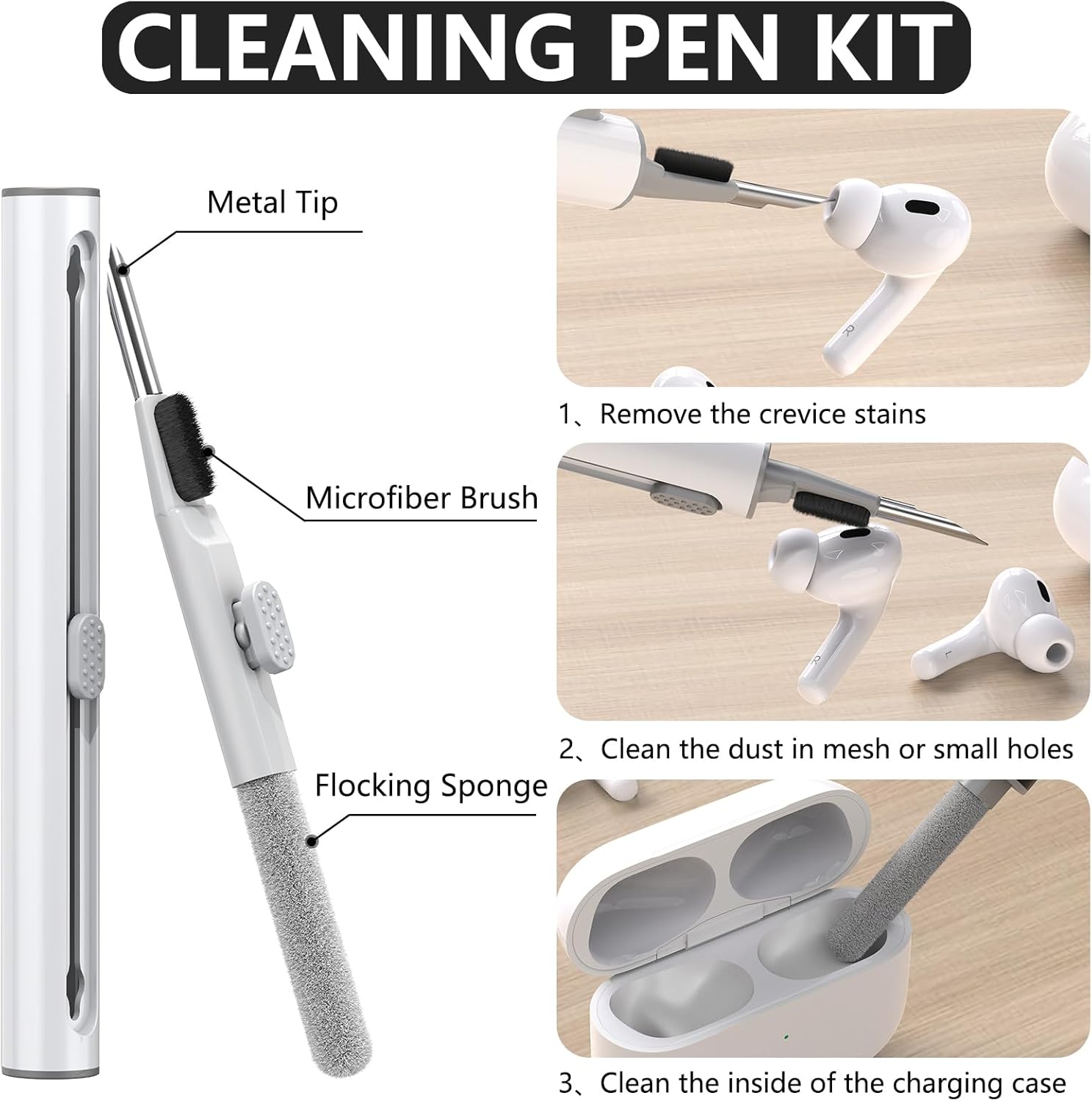 • 3 в 1 почистваща писалка: Почистващата писалка с връх на писалка, мека четка и четка за флокиране с висока плътност, може да ви помогне да премахнете прах и мръсотия от слушалките си, винаги поддържайте AirPods като нови.