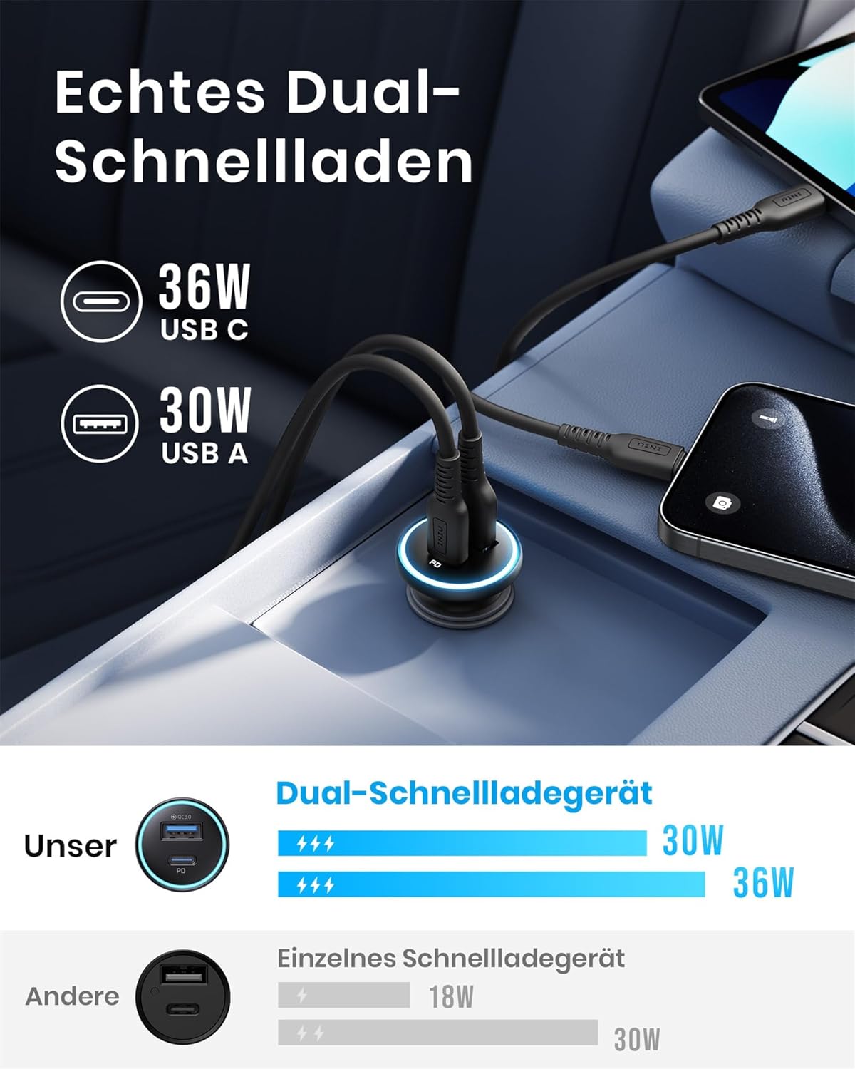 • Истинско двойно бързо зареждане: За разлика от типичните бързи зарядни устройства с един порт, зарядното за кола INIU може да зареди 2 телефона само за 25 минути. Оборудвано с портове Power Delivery 3.0 и Quick Charge 3.0, то дори осигурява бързо зареждане за водача и пътника.