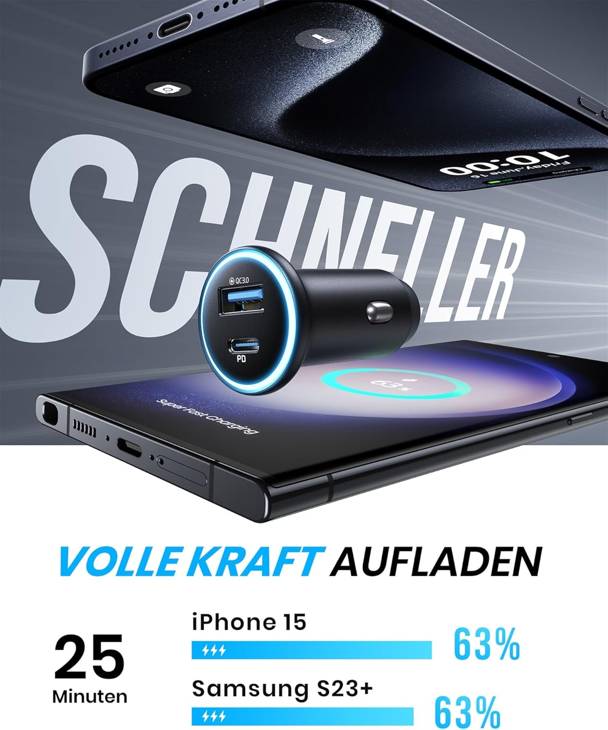 • 63% ЗАРЕЖДАНЕ ЗА 25 МИНУТИ INIU осигурява бързо зареждане на вашия телефон, независимо дали използвате USB A или USB-C порт. Комбинирайте го с кабел за бързо зареждане INIU или с оригиналния си кабел за бързо зареждане, за да изпитате удоволствието от зареждането до 63% само за 25 минути.
