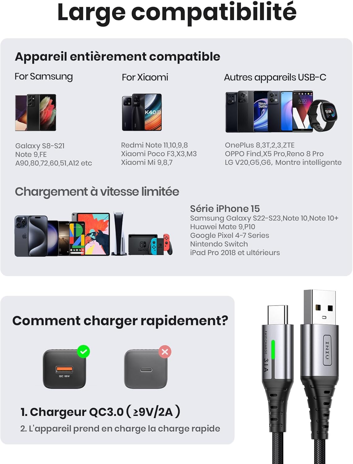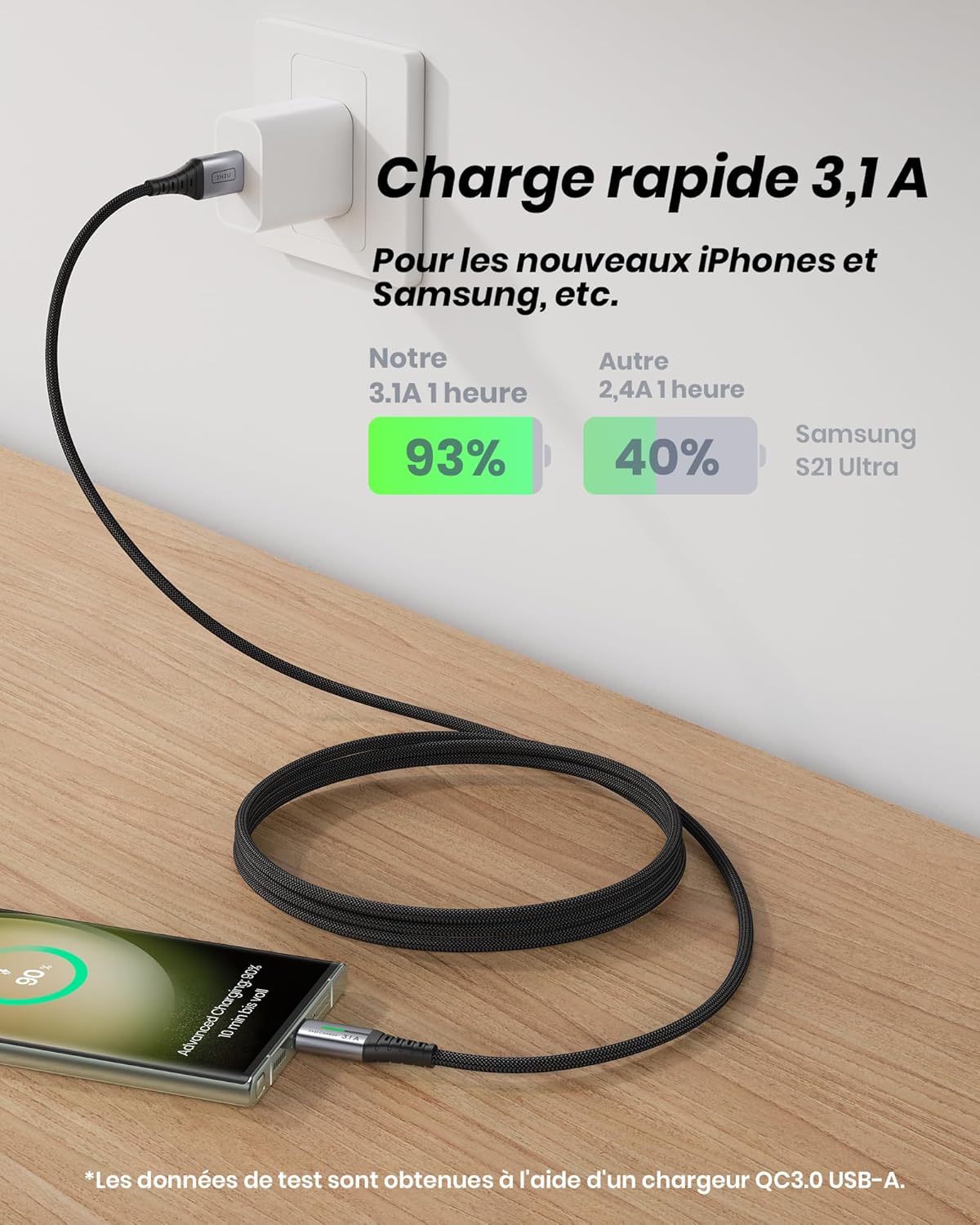 • Бързо зареждане от 3,1 A: Вътрешните медни проводници със свръхпроводимост позволяват безопасно и истинско зареждане от 3,1 A за вашето устройство с максимална скорост. Невероятно бързо зареждане на телефона ви от 0 до 93% за 1 час.