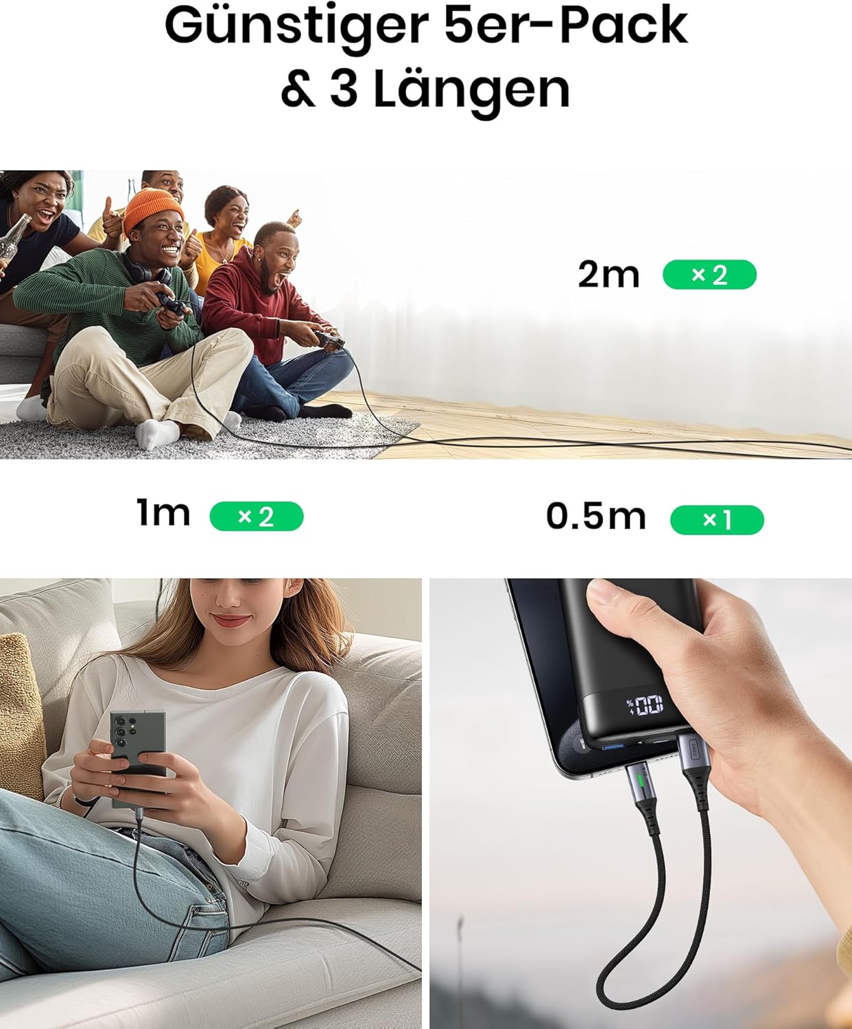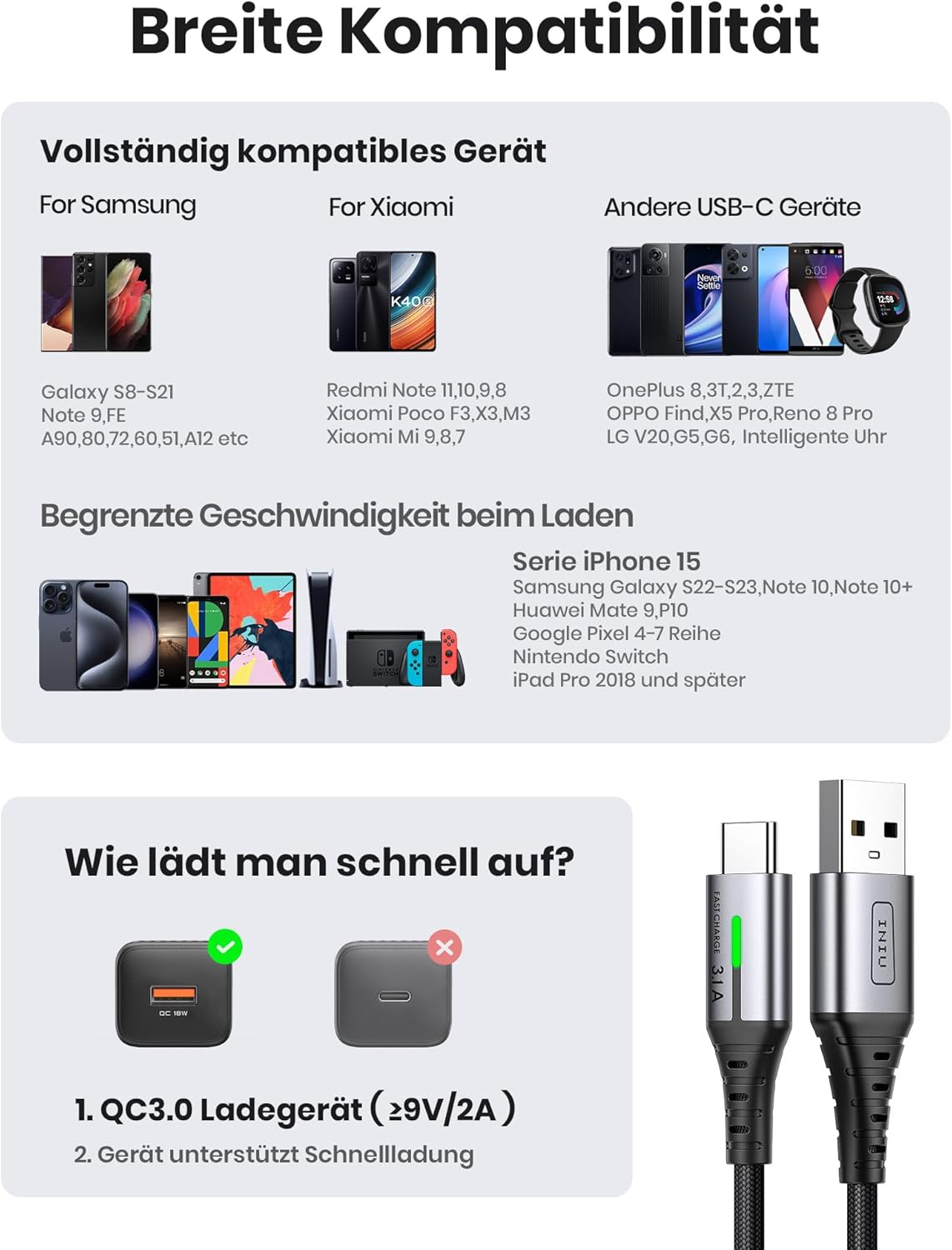 INIU USB C кабел, (5 броя – 1 / 1 / 2 / 2 / 3 м) Кабел за зареждане USB-C 3.1 A QC 3.0 кабел за бързо зареждане, Type C кабел за данни за мобилен телефон за iPhone 15 Pro Samsung S23 S22 Xiaomi 11 Google Pixel 7 Pro