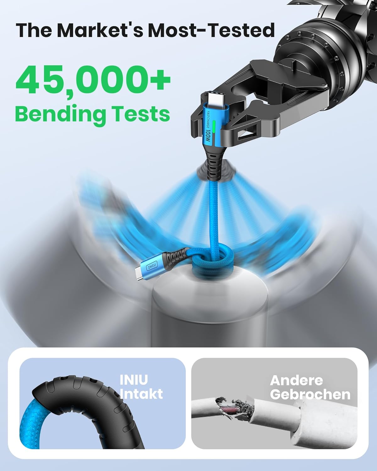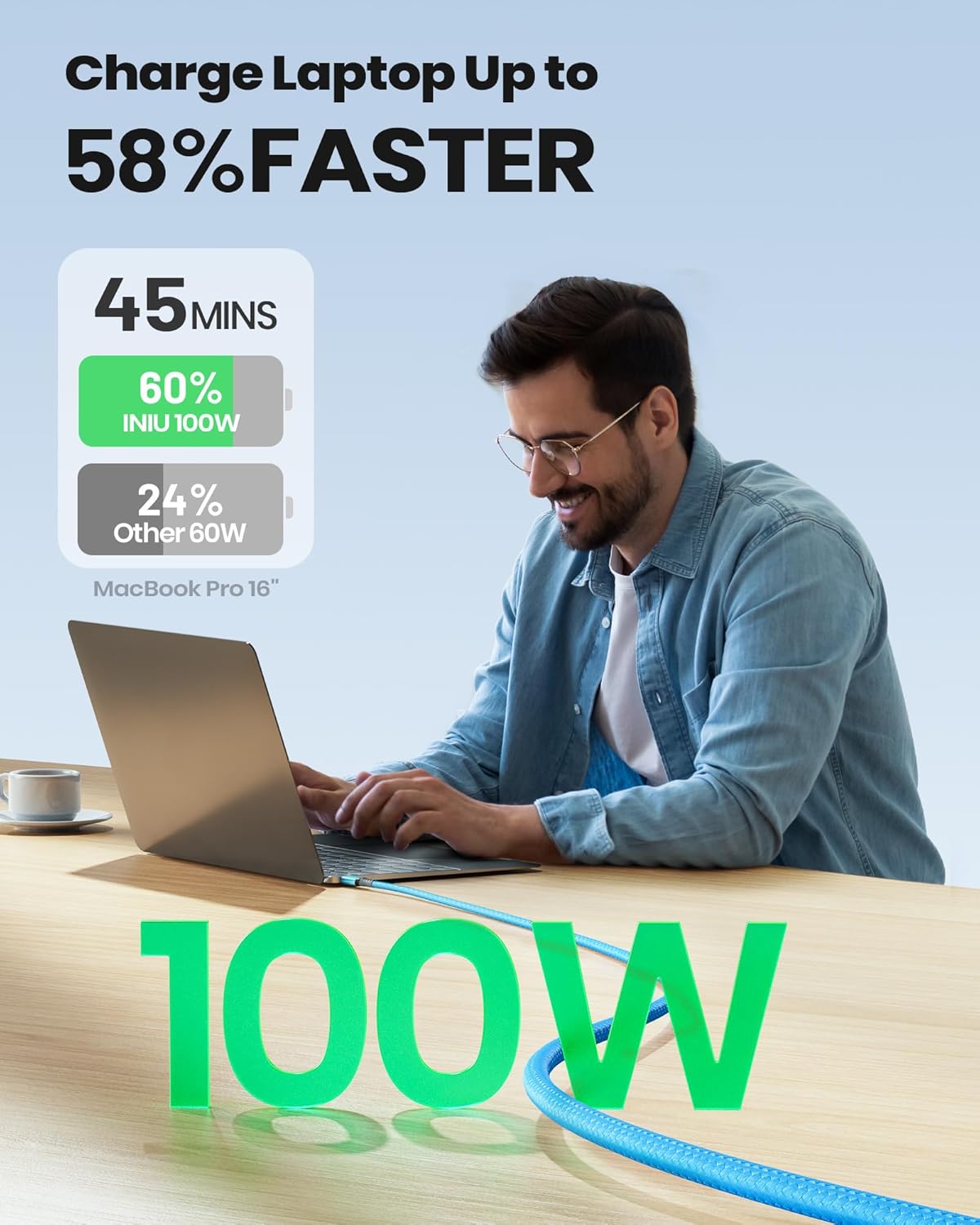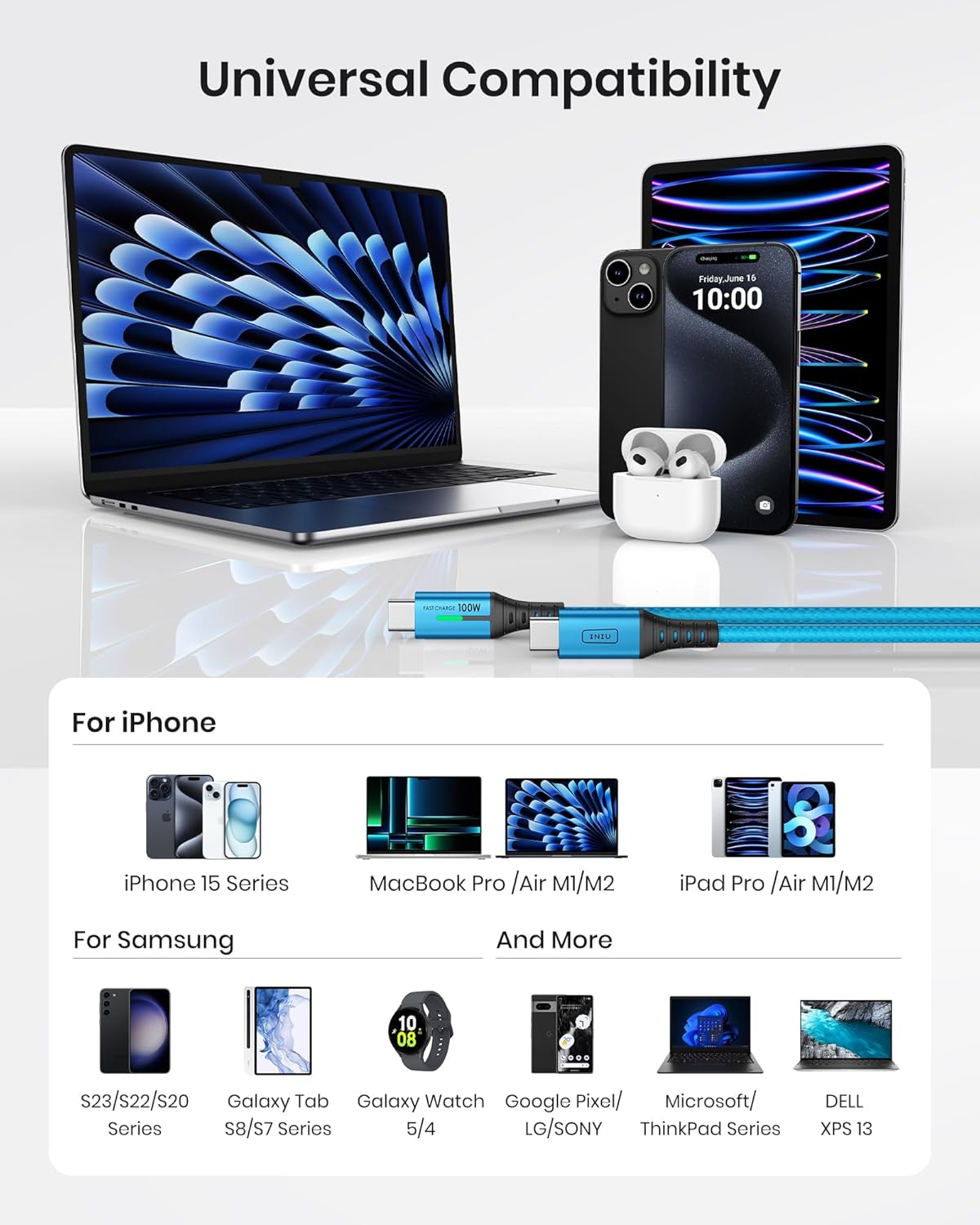 • НЕСРАДИМА СЪВМЕСТИМОСТ С мощната си изходна мощност от 100 W, тя може да зарежда по-голям брой устройства от устройства с 60 W кабели, включително всички USB-C телефони, таблети, почти всички водещи лаптопи, комутатори и др.