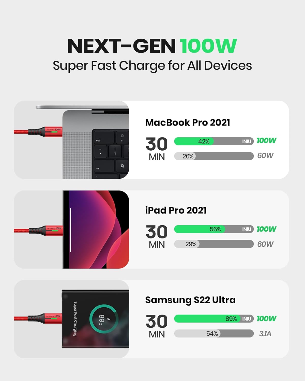 • 100W супер бърза изходна мощност: несравнимата 5A 100W PD технология издига скоростта на зареждане на следващото ниво - невероятно бързо зареждане от вашия Samsung Galaxy S22 до 89% за 35 минути или от вашия MacBook Pro до 100% само за 1,9 часа.