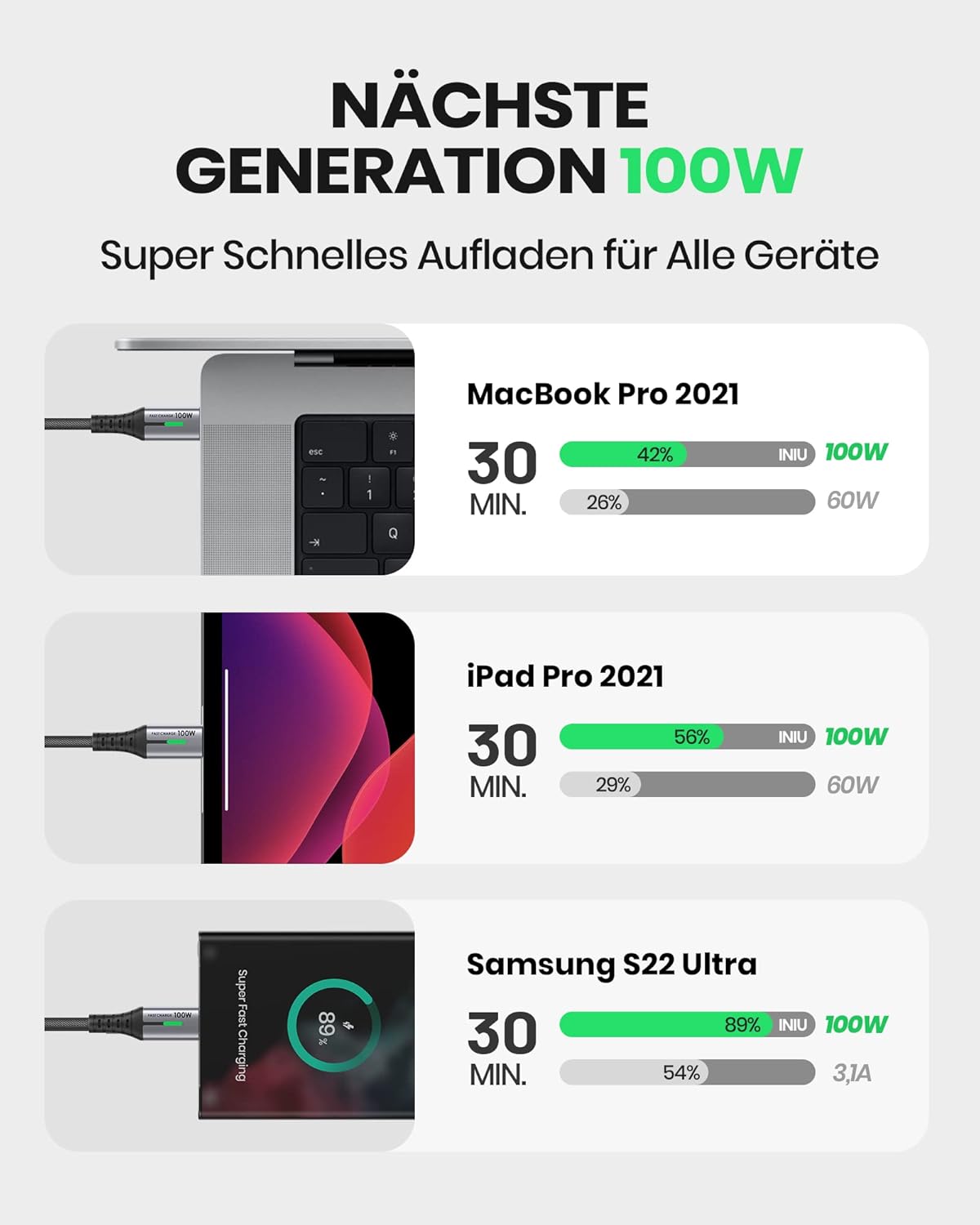 • 100W супер бърза изходна мощност: несравнимата 5A 100W PD технология издига скоростта на зареждане на следващото ниво - невероятно бързо зареждане от вашия Samsung Galaxy S22 до 89% за 35 минути или от вашия MacBook Pro до 100% само за 1,9 часа.