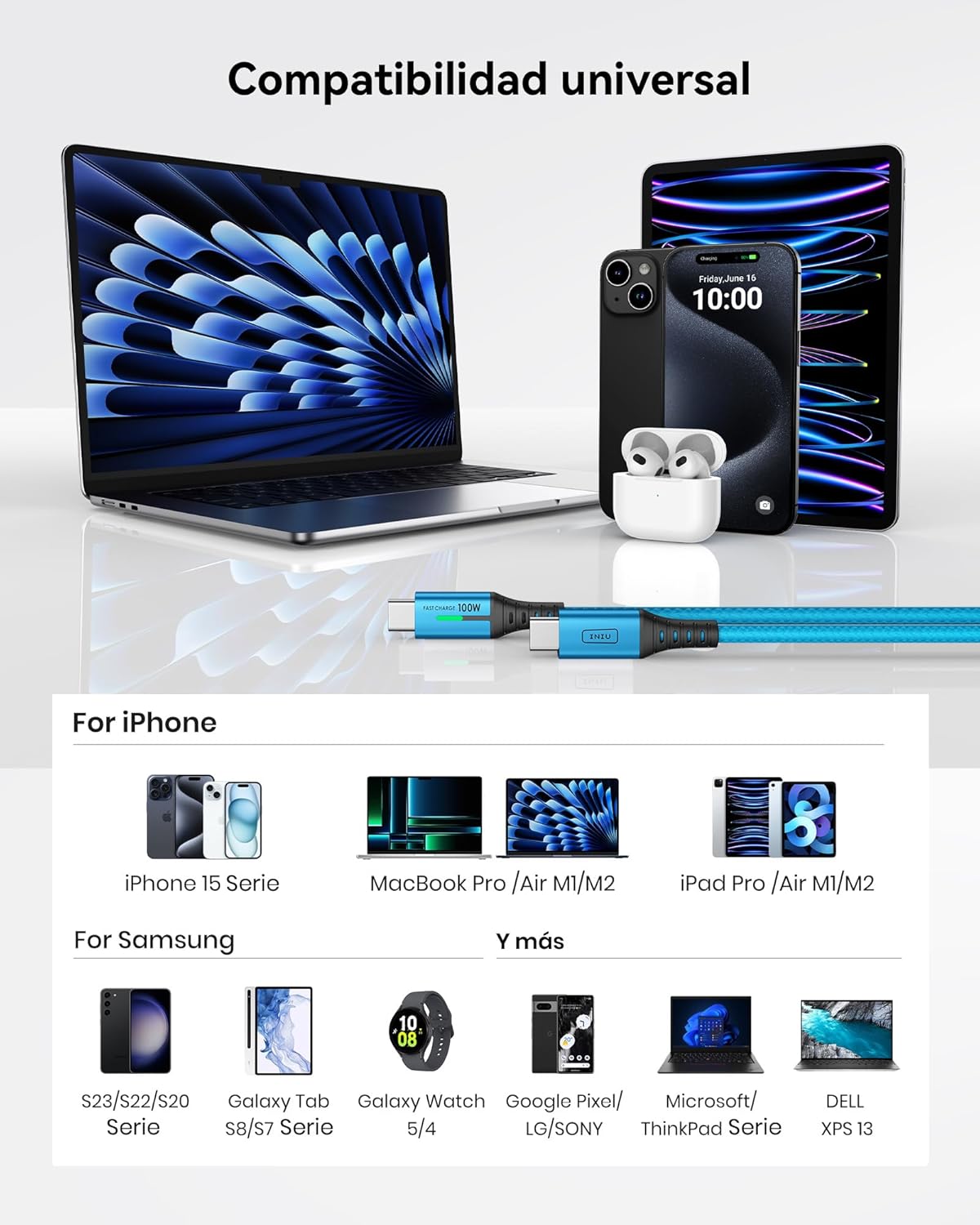 • НЕСРАДИМА СЪВМЕСТИМОСТ С мощната си изходна мощност от 100 W, тя може да зарежда по-голям брой устройства от устройства с 60 W кабели, включително всички USB-C телефони, таблети, почти всички водещи лаптопи, комутатори и др.