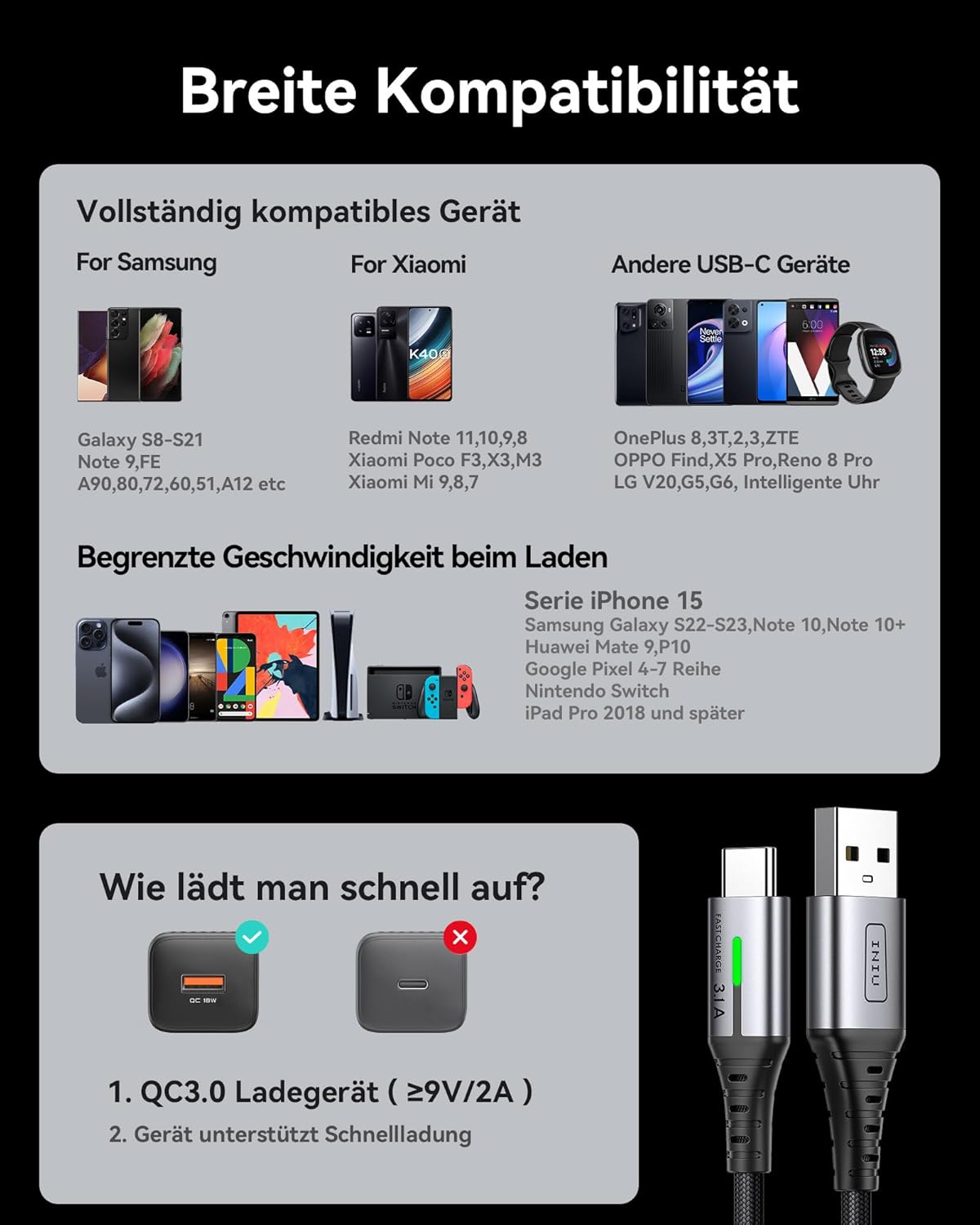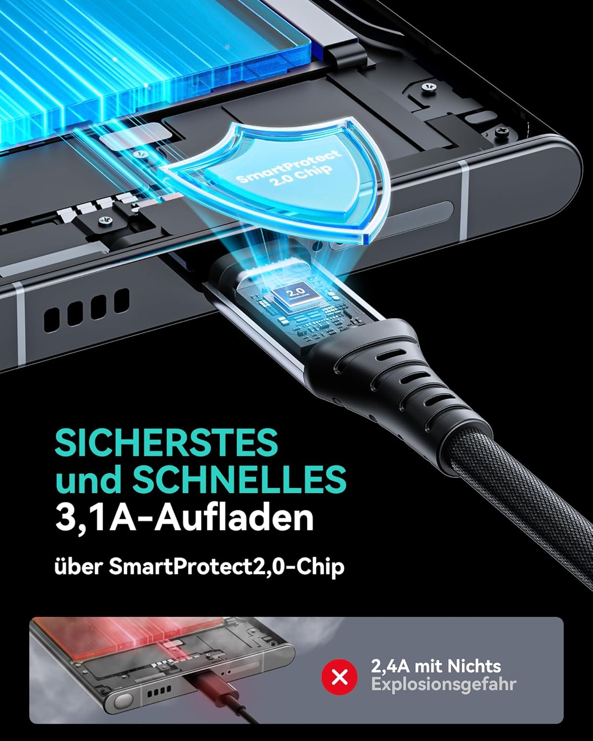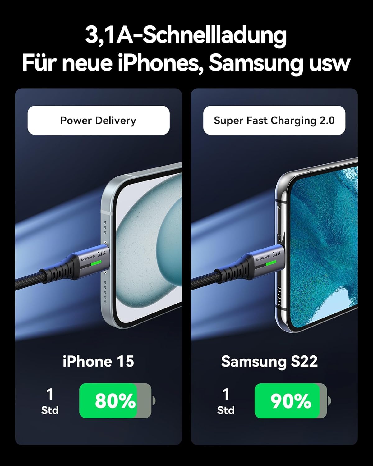 • Бързо зареждане от 3,1 A: Вътрешните медни проводници със свръхпроводимост позволяват безопасно и истинско зареждане от 3,1 A за вашето устройство с максимална скорост. Невероятно бързо зареждане на телефона ви от 0 до 93% за 1 час.