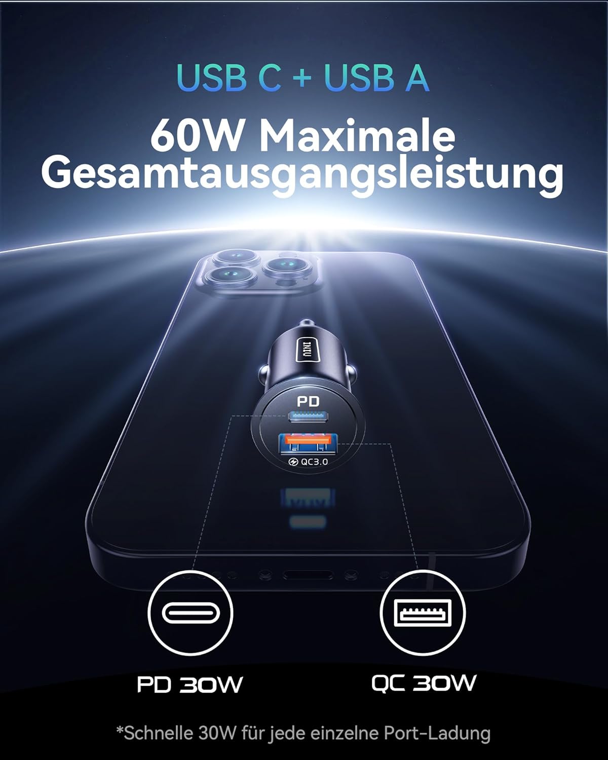 • Двойно зареждане: За разлика от повечето зарядни за кола само с 2 USB порта, нашият продукт има както PD USB C портове, така и QC USB портове, така че можете бързо да зареждате не само всички стандартни USB устройства, но и всички нови iPhone и Android устройства с USB C портове едновременно!