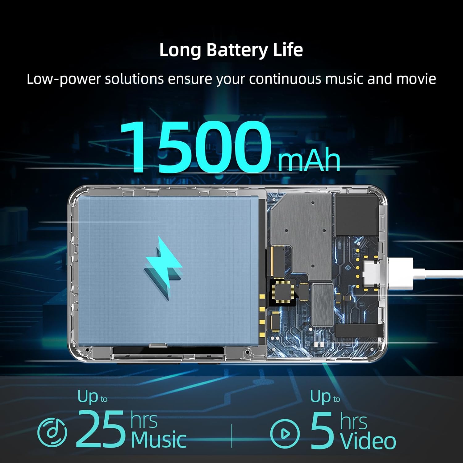 • Пускайте любимите си песни: Този MP3 плейър със Spotify има мощно музикално приложение, което поддържа много формати (MP3, WAV, FLAC, AAC, APE, OGG, M4A, WMA, MP2 и др.). Използвайте функцията за сканиране на музика, за да зареждате песни от папки с едно щракване и да създавате неограничен брой плейлисти. Намирайте песни лесно, като въведете името им. MP3-ката разполага и с чип за намаляване на шума за върховно звуково изживяване.