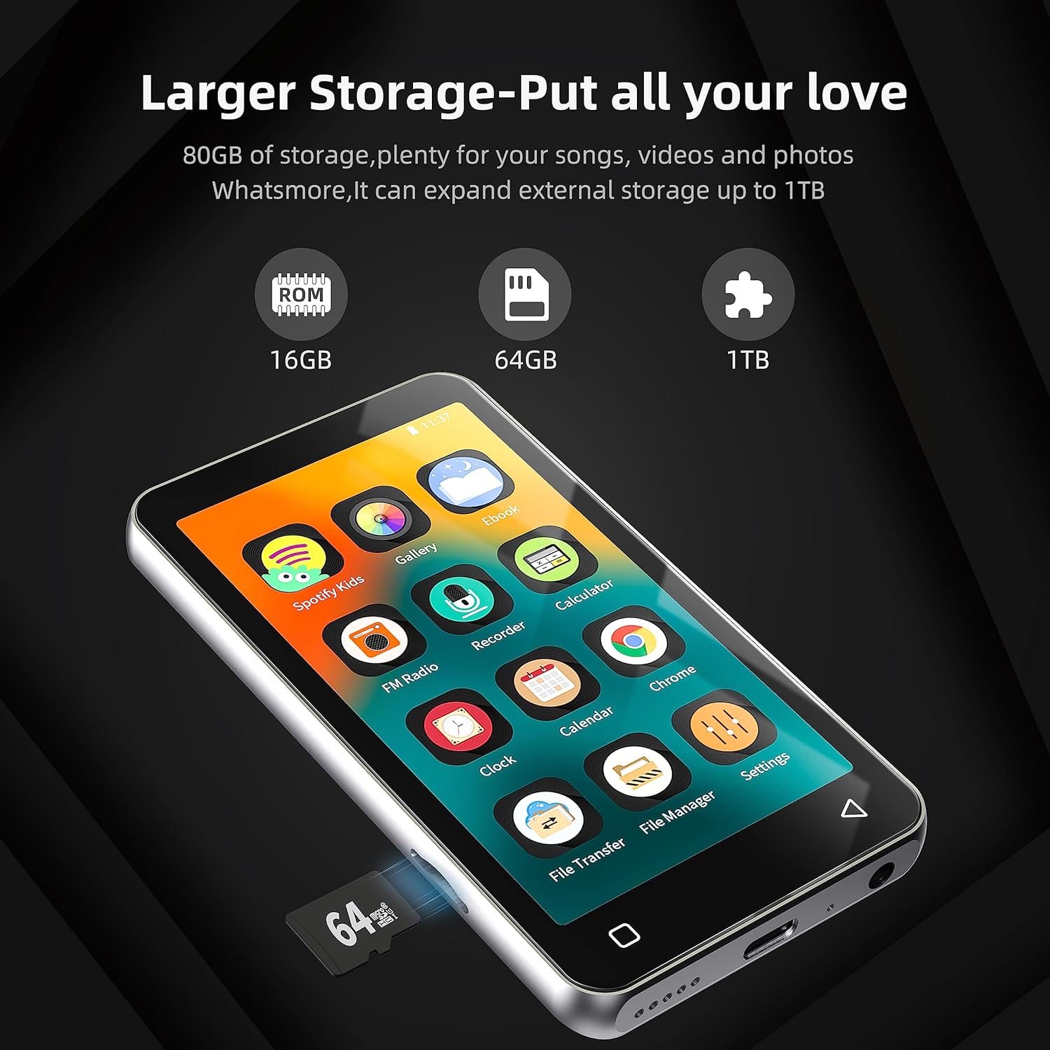 • 【Слушане на музика онлайн】MP3 плейърът е предварително инсталиран с популярни приложения като Spotify, Spotify Kids, Amazon Music и Deezer и осигурява лесен достъп до огромна музикална библиотека. Независимо дали имате нужда да освободите паметта на телефона, искате специален плейър или имате деца, които не са готови за телефон, това е добър избор.