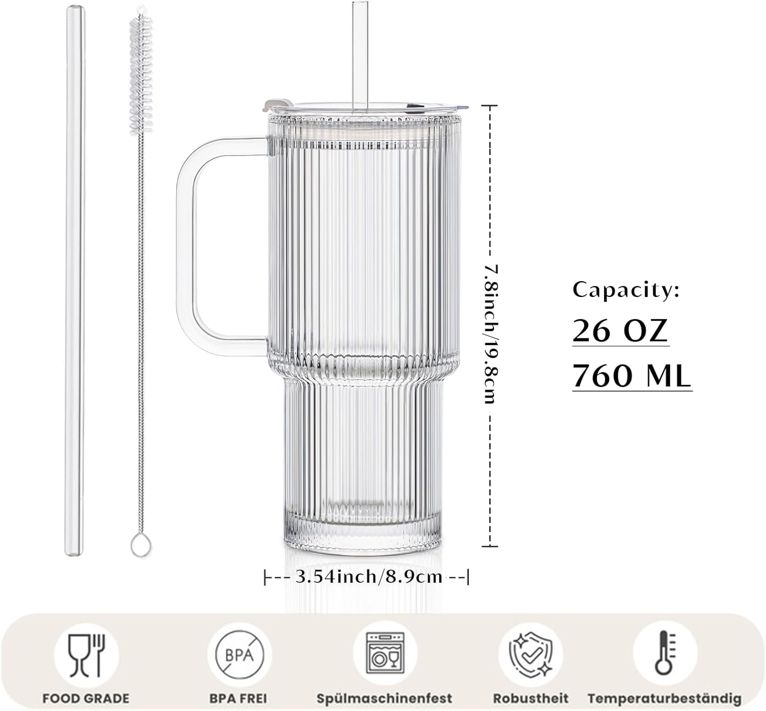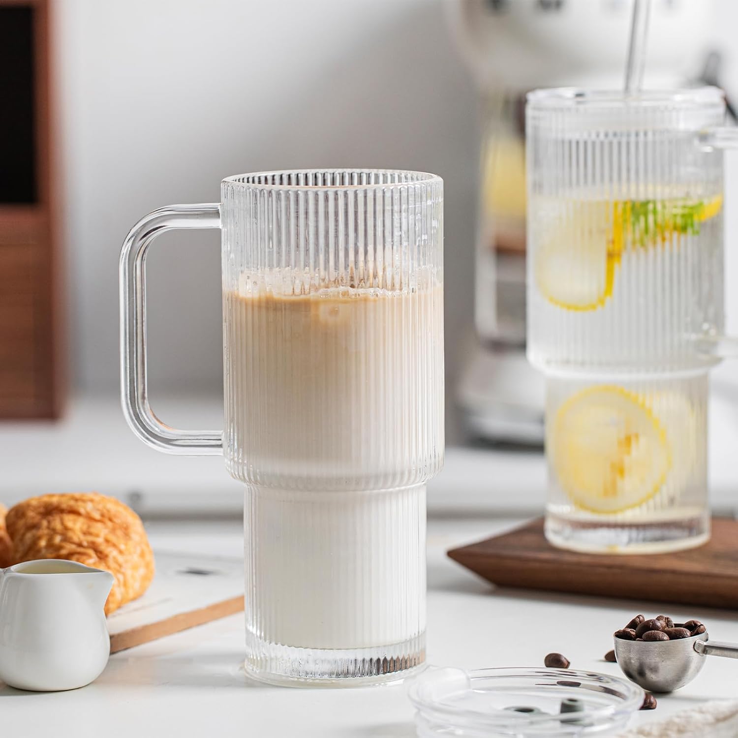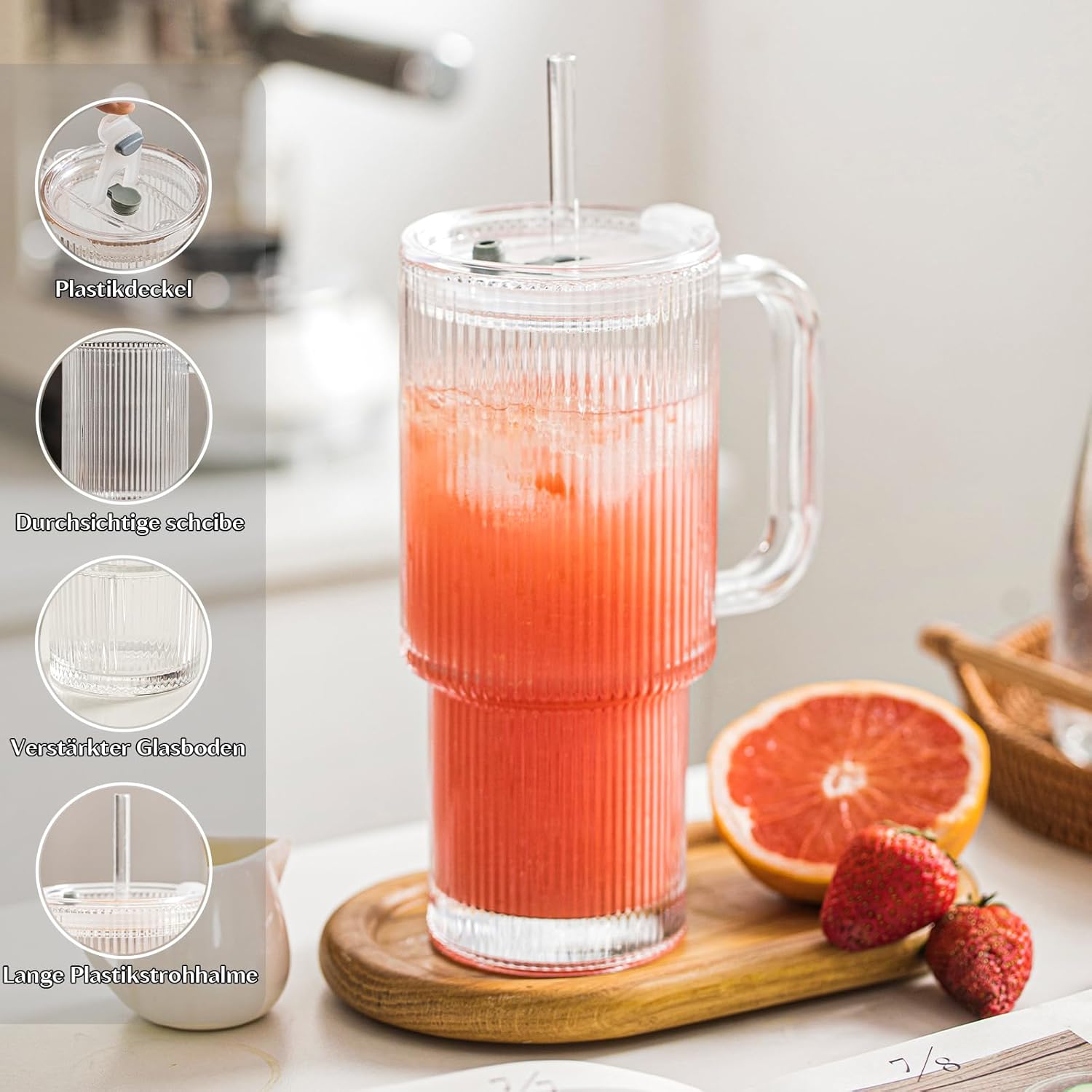 • Висококачествен дизайн от стъкло, подходящ за съдомиялна машина: Тези естетически приятни стъклени чаши са изработени от издръжливо, висококачествено стъкло и се отличават с елегантна, оребрена текстура и удобна дръжка за лесно боравене. Гладката, прозрачна повърхност придава на напитките ви изискан вид и осигурява дълготрайна издръжливост. Освен това, тези чаши, комплектовани с капачки и сламки, са подходящи за съдомиялна машина, което прави почистването лесно и удобно.