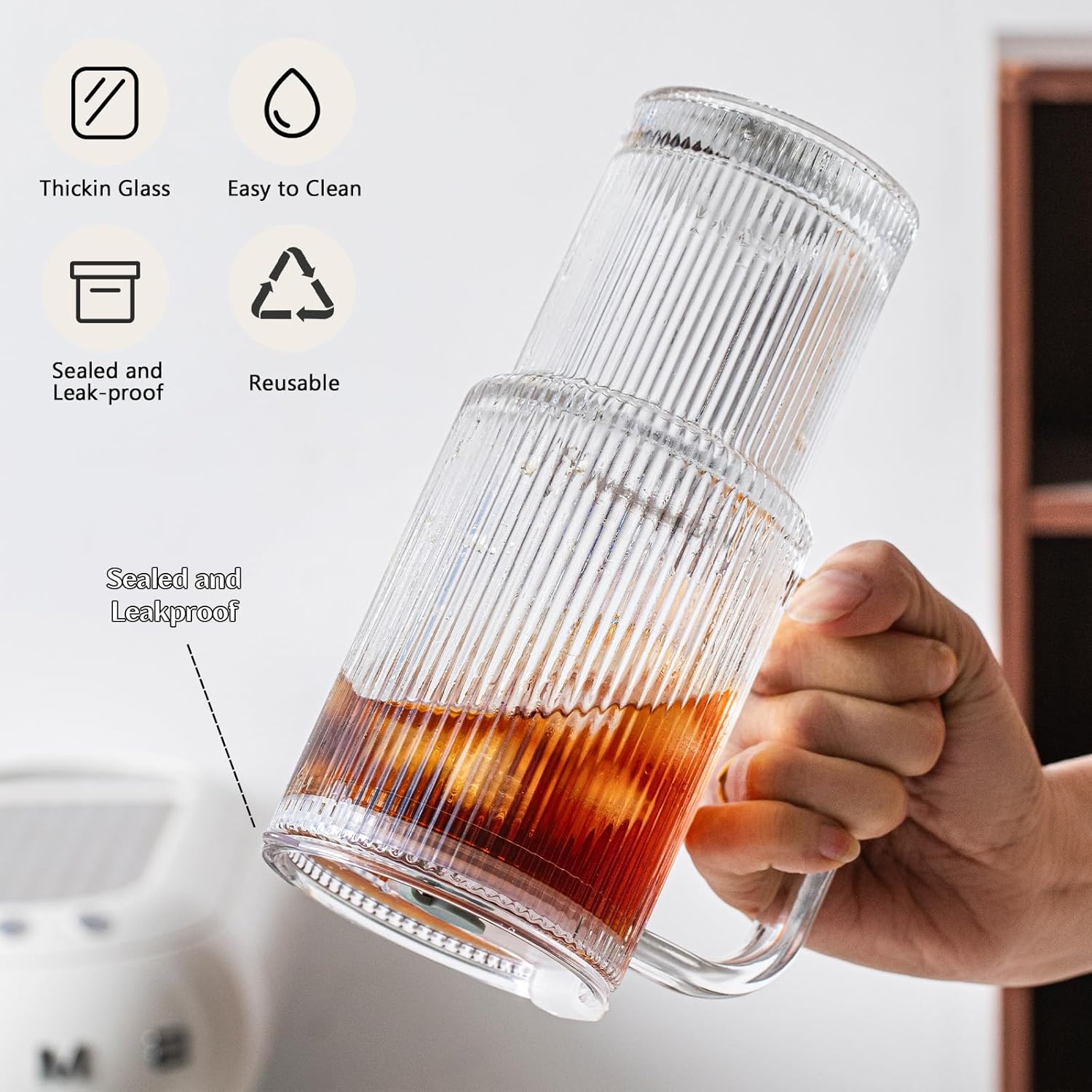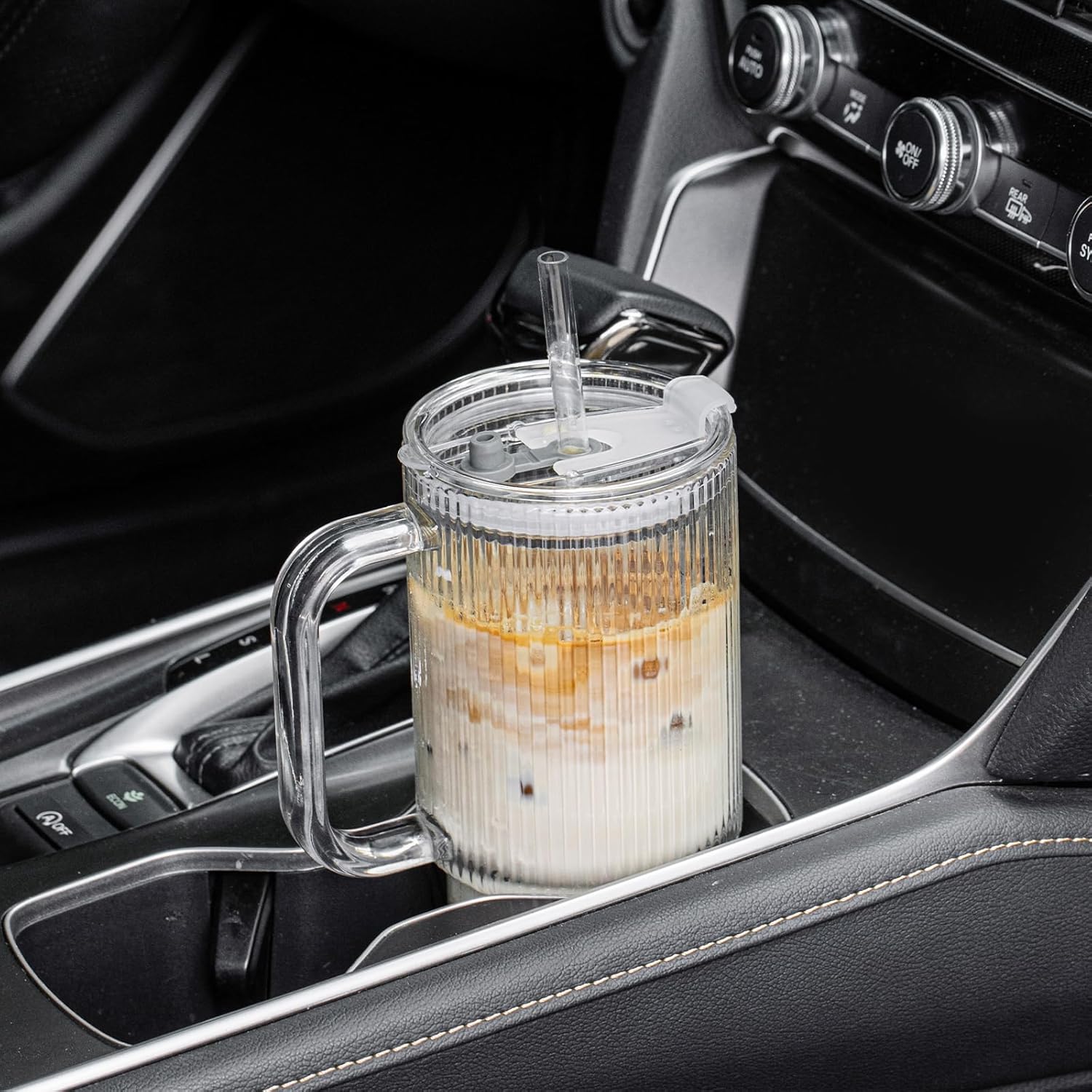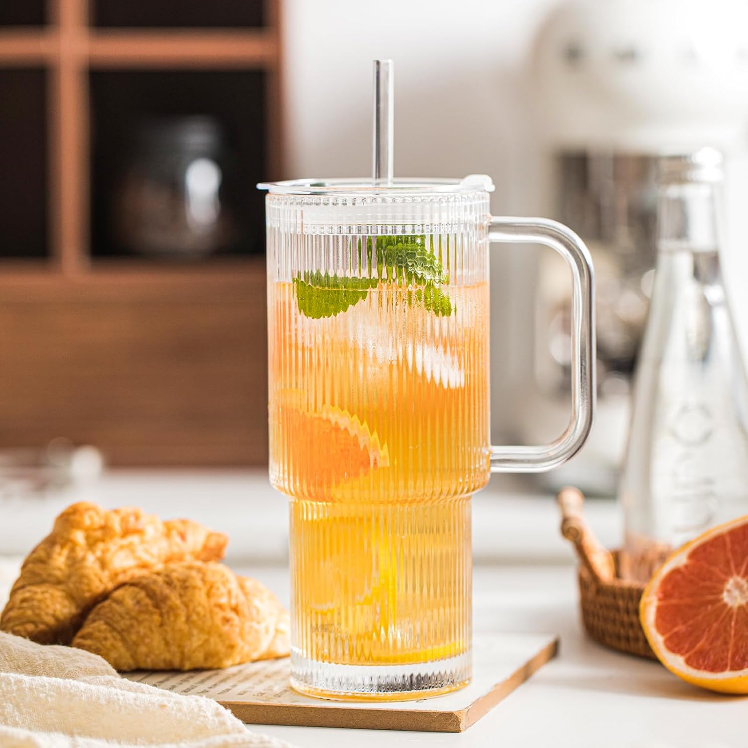 • Висококачествен дизайн от стъкло, подходящ за съдомиялна машина: Тези естетически приятни стъклени чаши са изработени от издръжливо, висококачествено стъкло и се отличават с елегантна, оребрена текстура и удобна дръжка за лесно боравене. Гладката, прозрачна повърхност придава на напитките ви изискан вид и осигурява дълготрайна издръжливост. Освен това, тези чаши, комплектовани с капачки и сламки, са подходящи за съдомиялна машина, което прави почистването лесно и удобно.