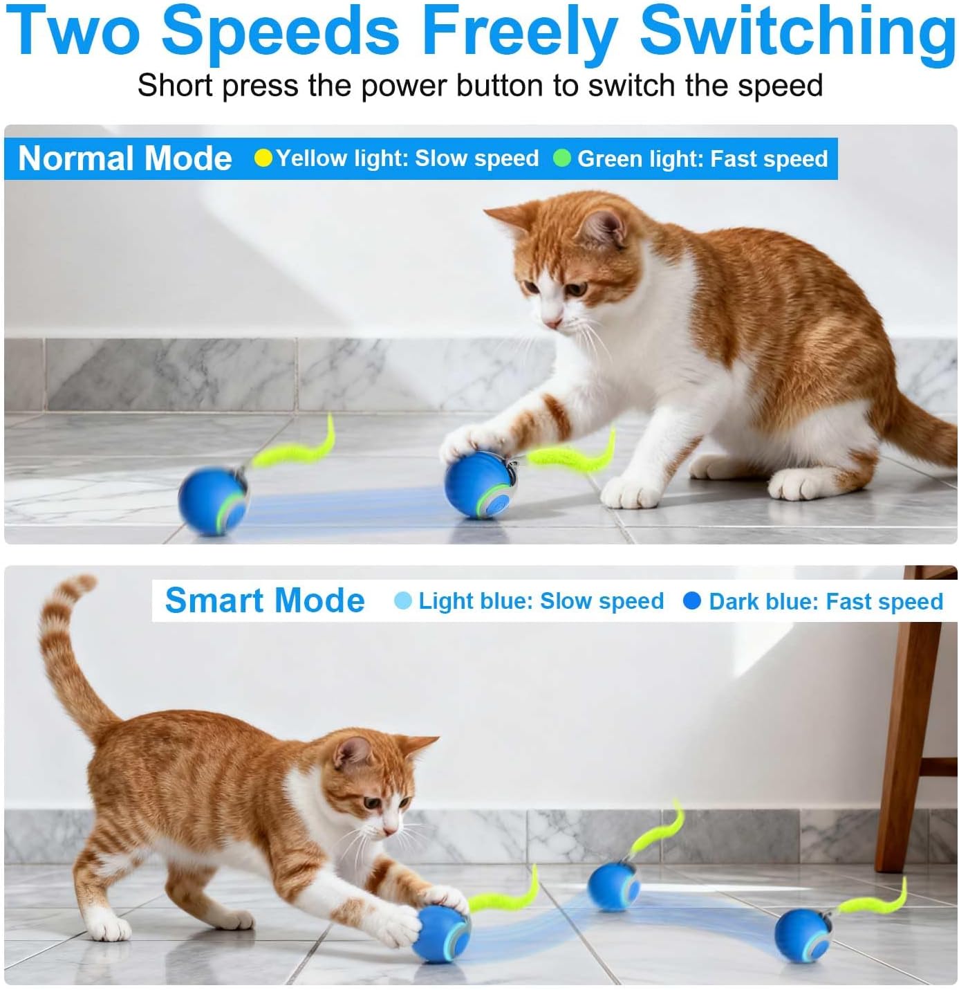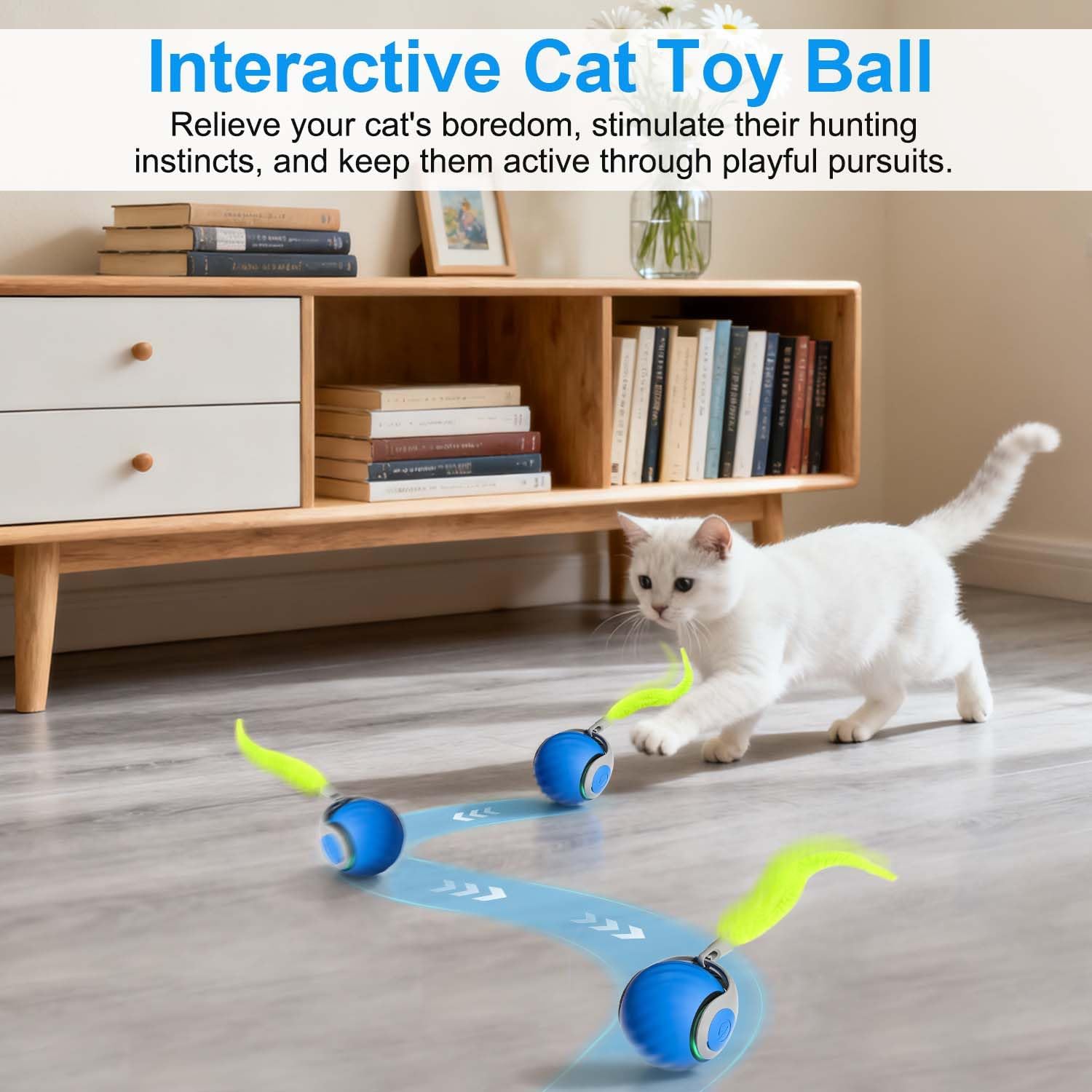 The removable, feather-like tail accessory and ball move quickly together, strengthening your cat's hunting instinct and giving the moving ball a fun element.
