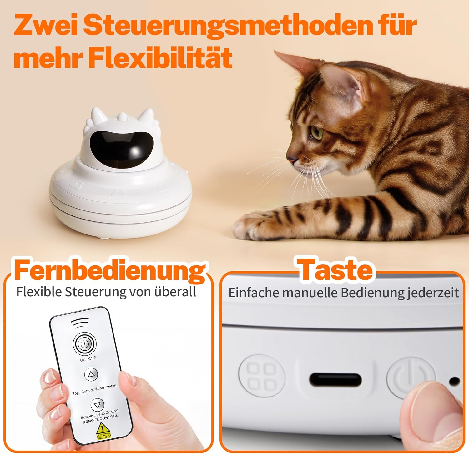 • Множество режими на игра и скорост: Тази интерактивна играчка за котки предлага различни режими, адаптирани към настроението и темперамента: обича ли котката ви темпо? С бързо регулиране, тя гони бързо. Внимателните котки могат да се промъкват спокойно около играчката благодарение на бавната скорост. Перфектната интелигентна играчка за котки - всеки ден се превръща в ново приключение, независимо дали става въпрос за възрастни животни или играчки за котки.